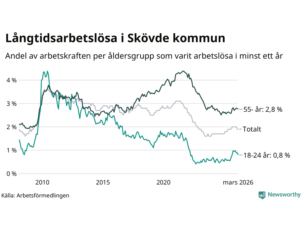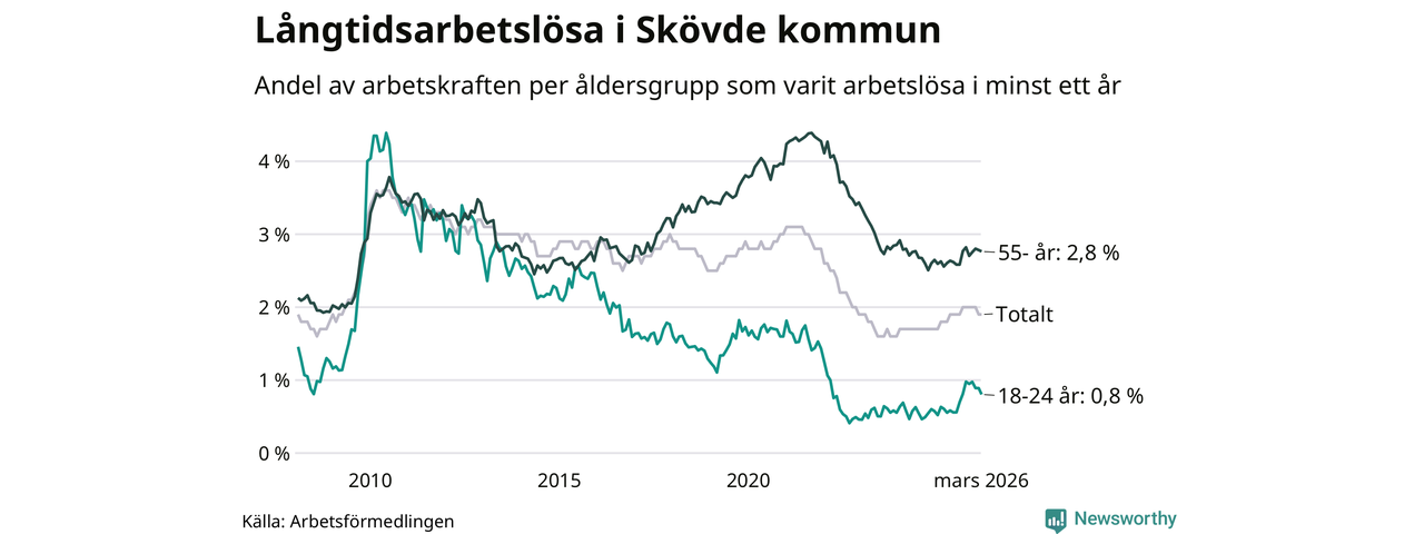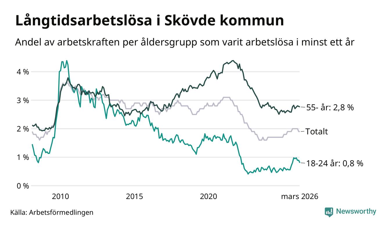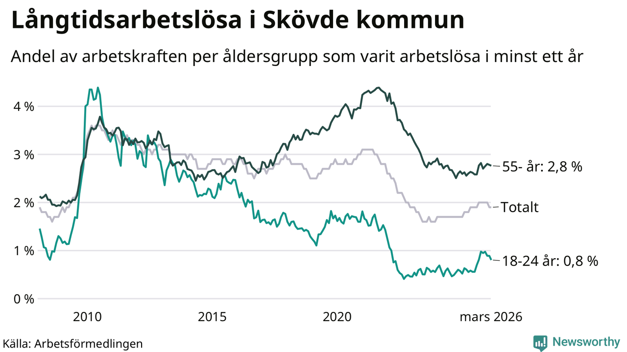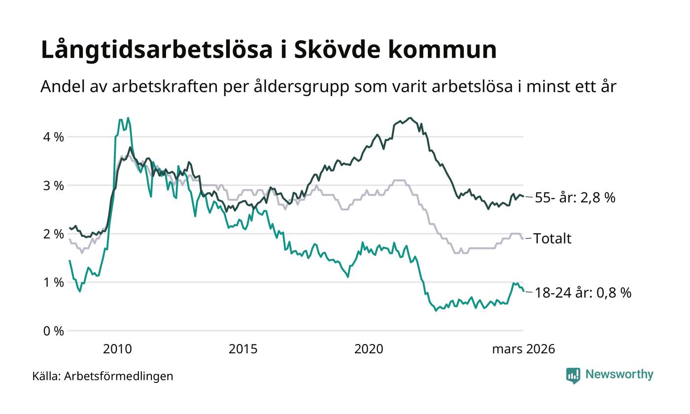 Av de 560 personerna som varit arbetslösa i mer än ett år i Skövde kommun är 165 personer mellan 55 och 661 år och 29 är mellan 18 och 24 år. För den äldre gruppen är andelen arbetslösa 2,8 procent medan den i den yngre gruppen är 0,8 procent. Även i riket som helhet är långtidsarbetslösheten högre i gruppen äldre.