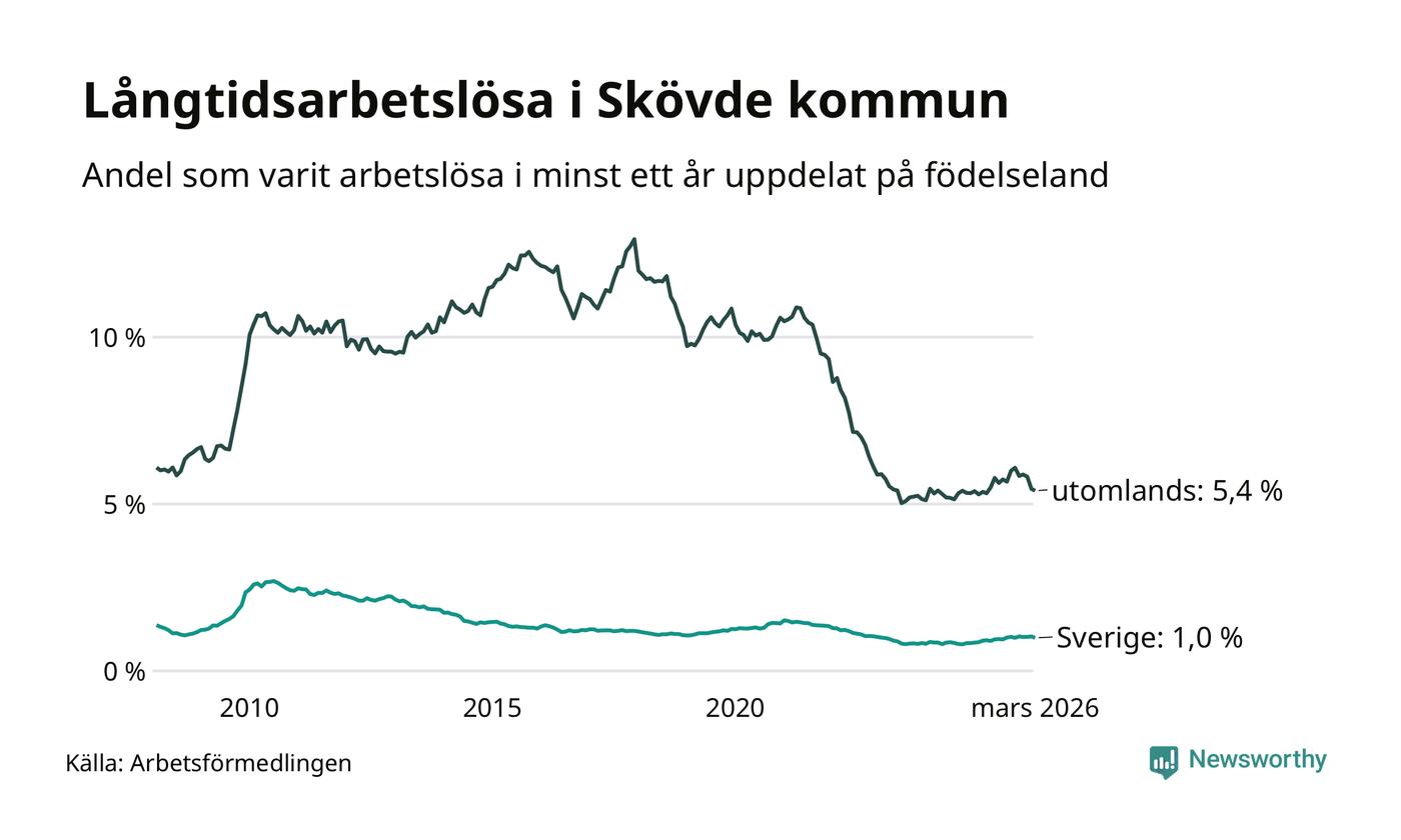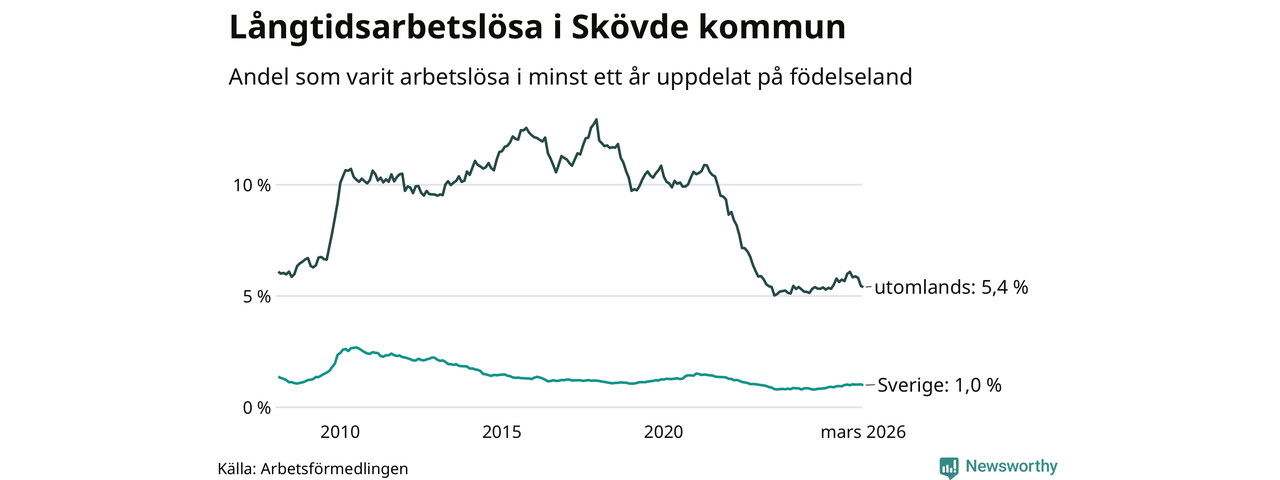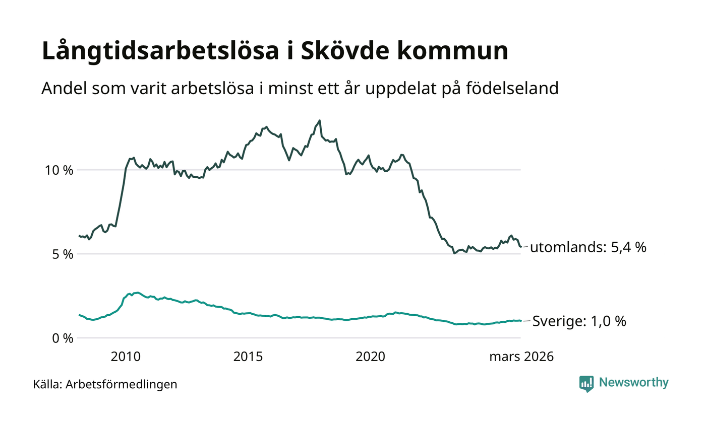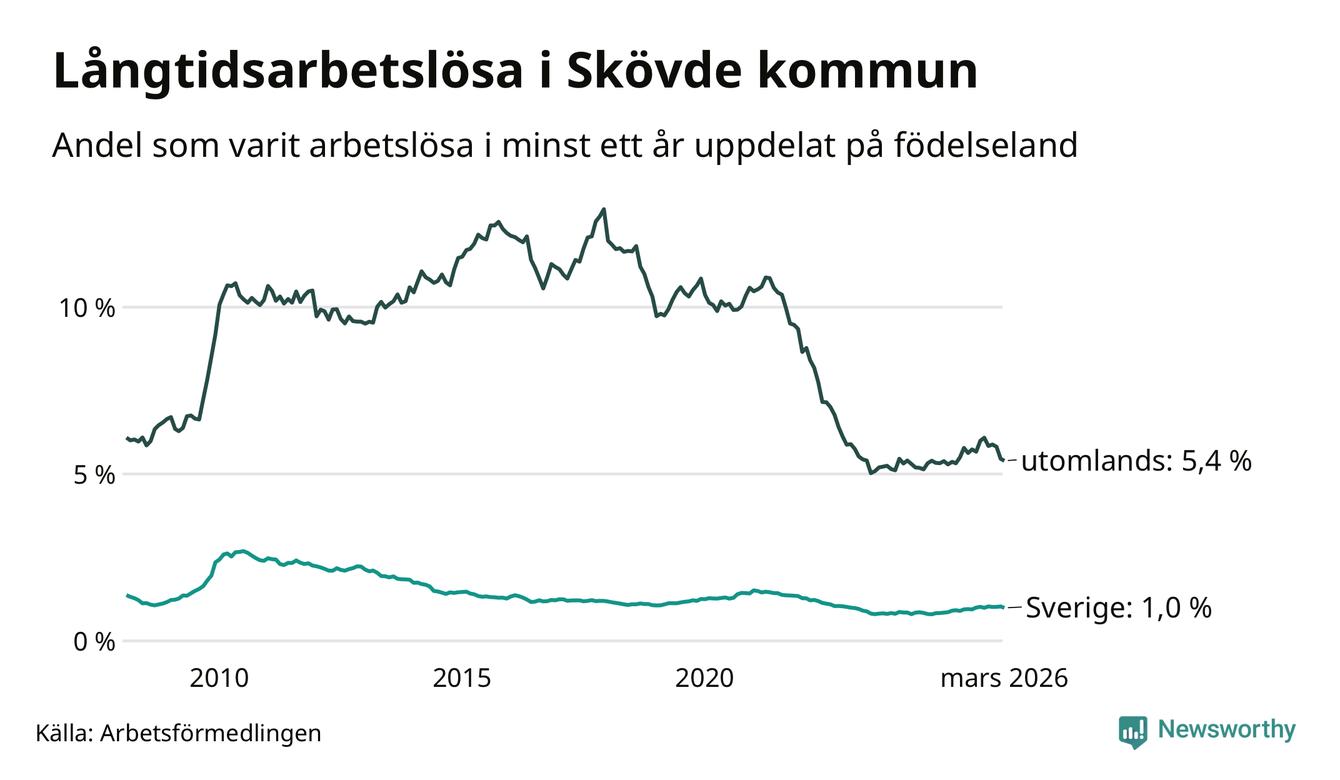 239 av de långtidsarbetslösa i Skövde är födda i Sverige, medan 321 är födda utomlands. Det innebär att långtidsarbetslösheten bland Sverigefödda är 1,0 procent, medan den är fem gånger så hög – 5,4 procent – bland födda utomlands. Även i riket som helhet är arbetslösheten högre bland utrikesfödda.