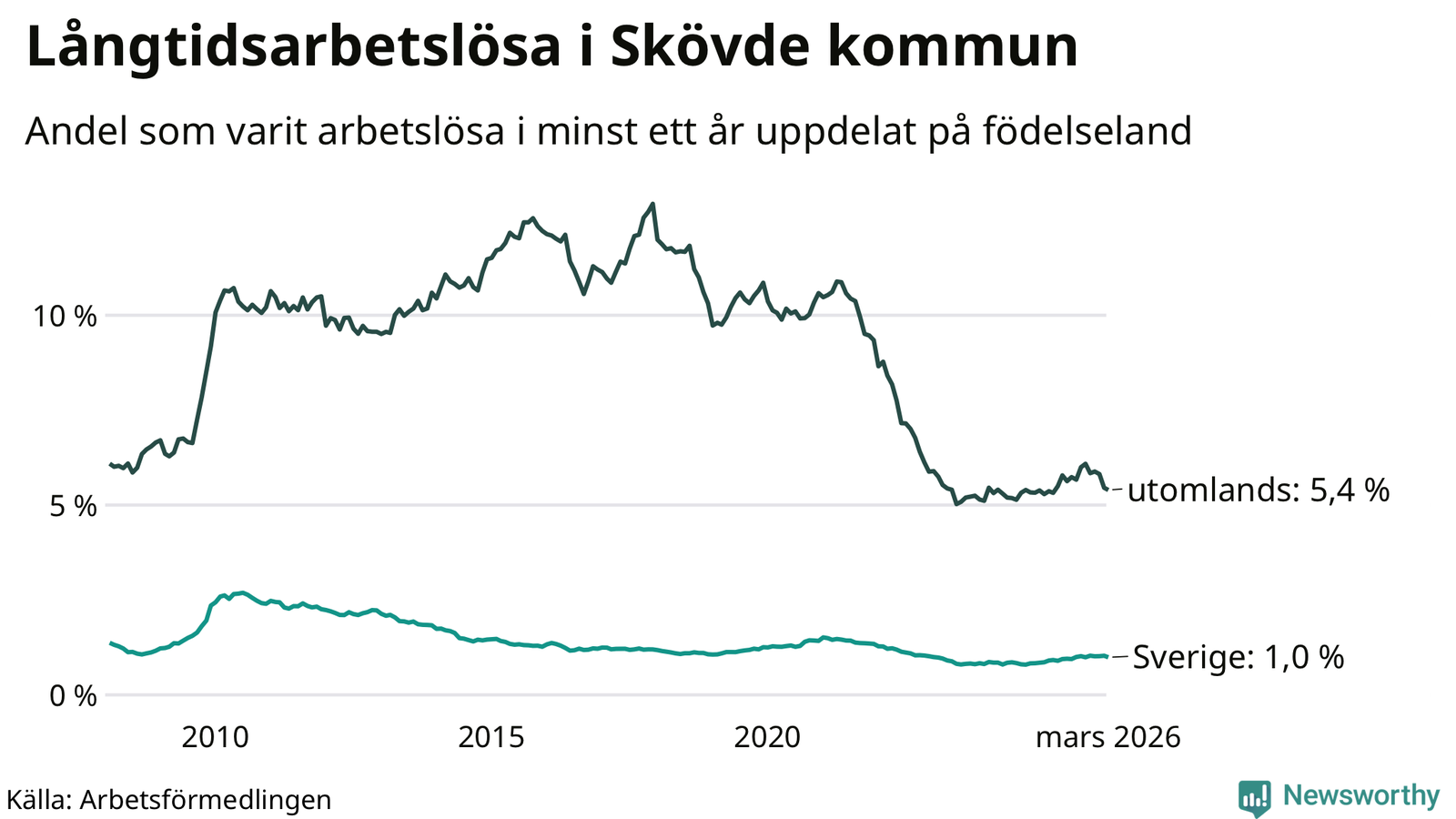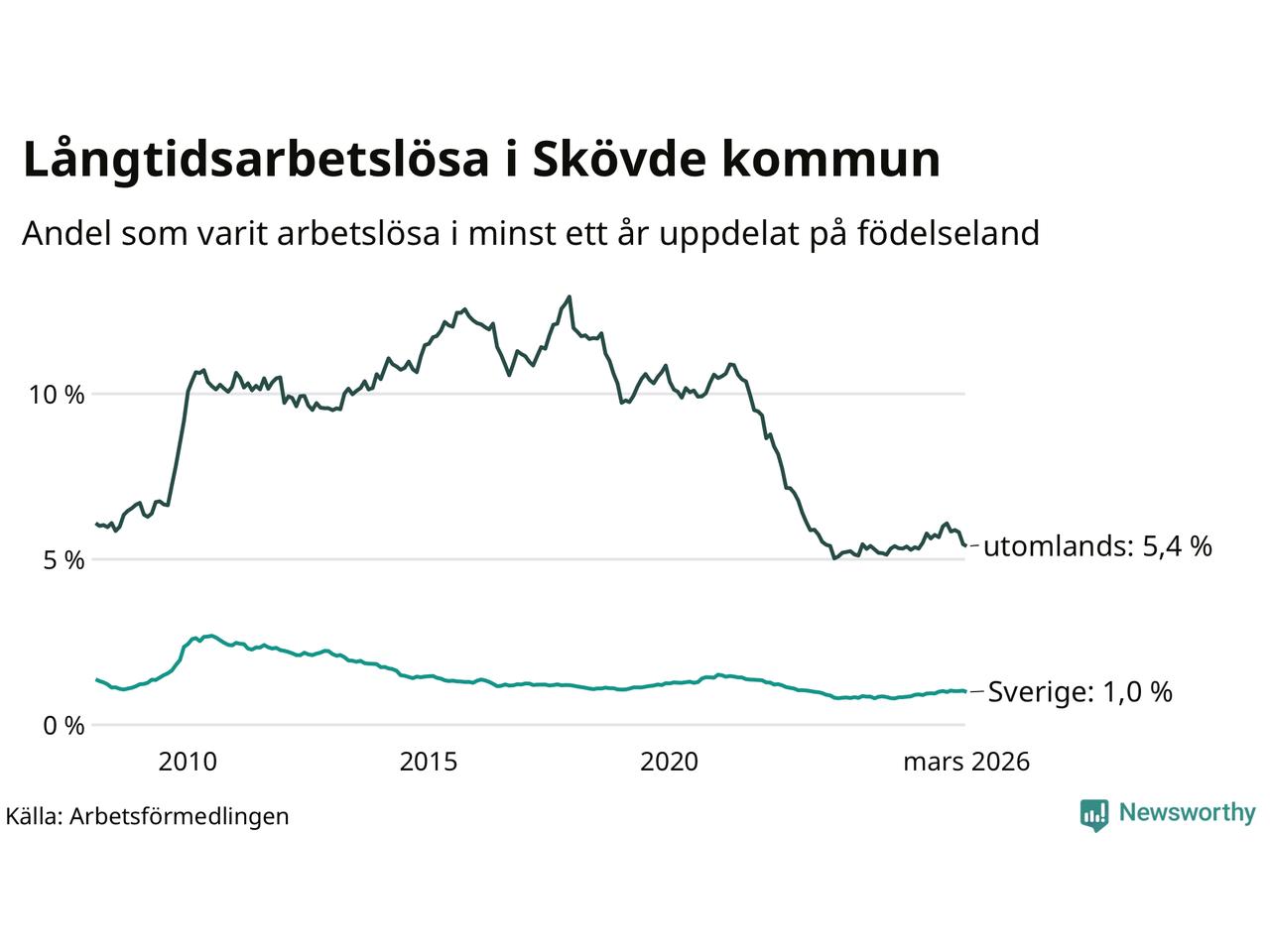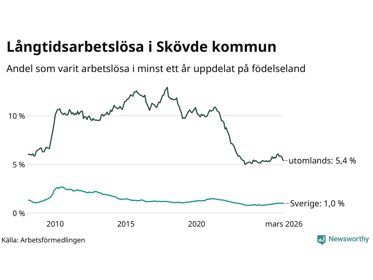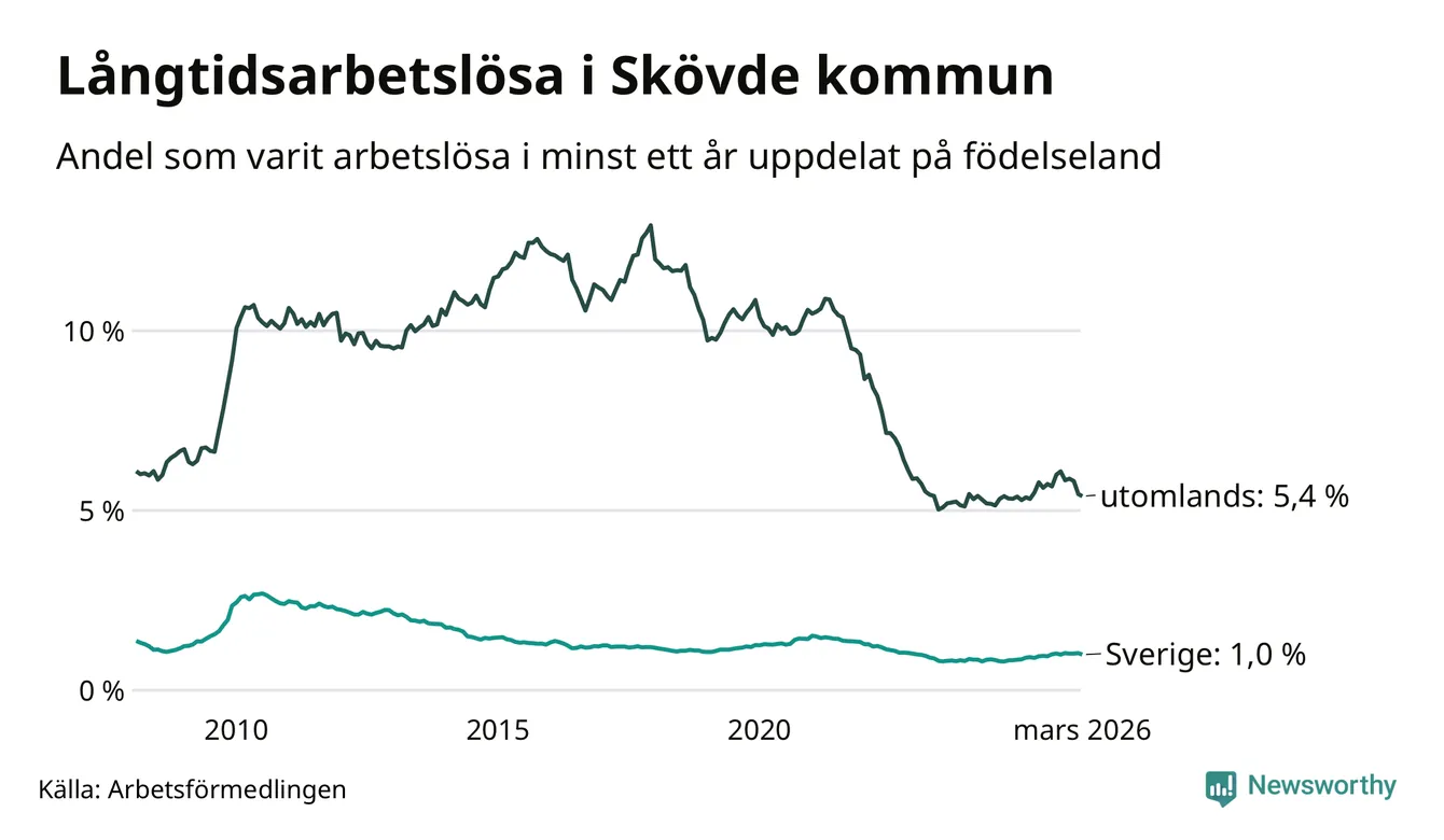 239 av de långtidsarbetslösa i Skövde är födda i Sverige, medan 321 är födda utomlands. Det innebär att långtidsarbetslösheten bland Sverigefödda är 1,0 procent, medan den är fem gånger så hög – 5,4 procent – bland födda utomlands. Även i riket som helhet är arbetslösheten högre bland utrikesfödda.