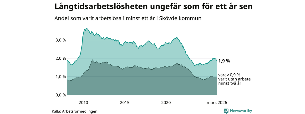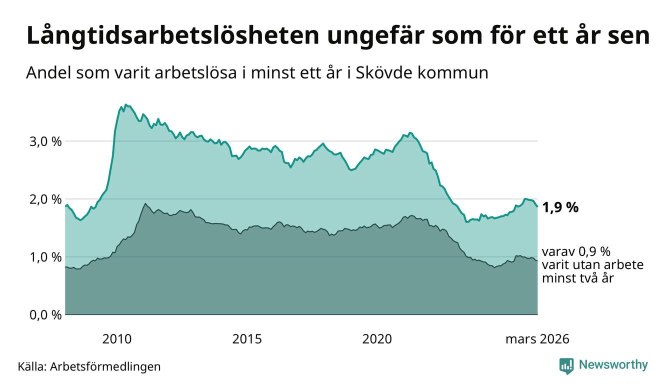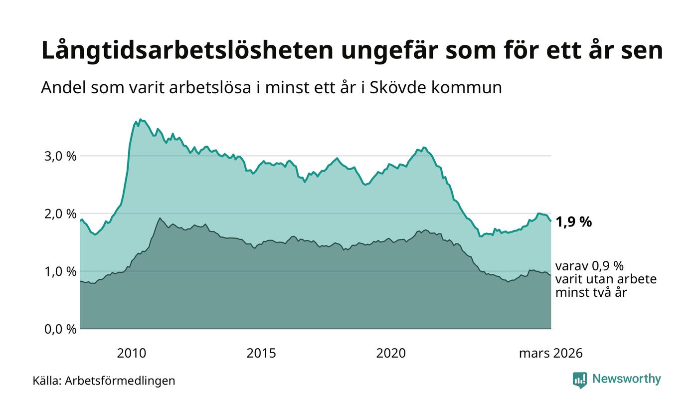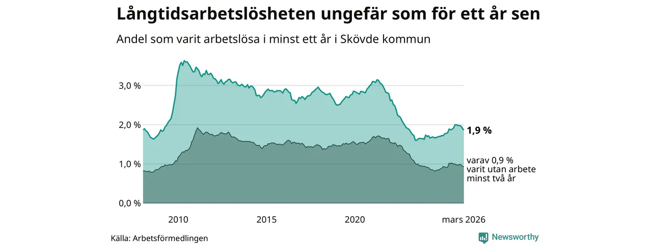 I mars hade 560 Skövdebor varit arbetslösa i minst ett år, vilket är 13 färre än månaden innan. 560 personer motsvarar 1,9 procent av arbetskraften i kommunen – andelen långtidsarbetslösa är ungefär på samma nivå som för ett år sedan.