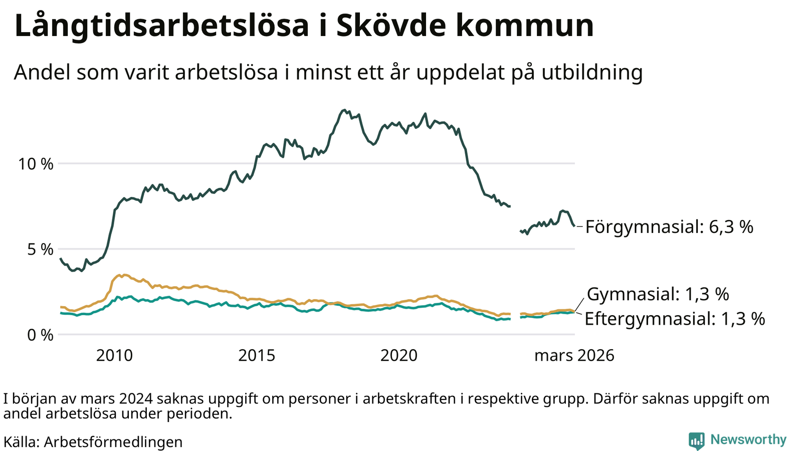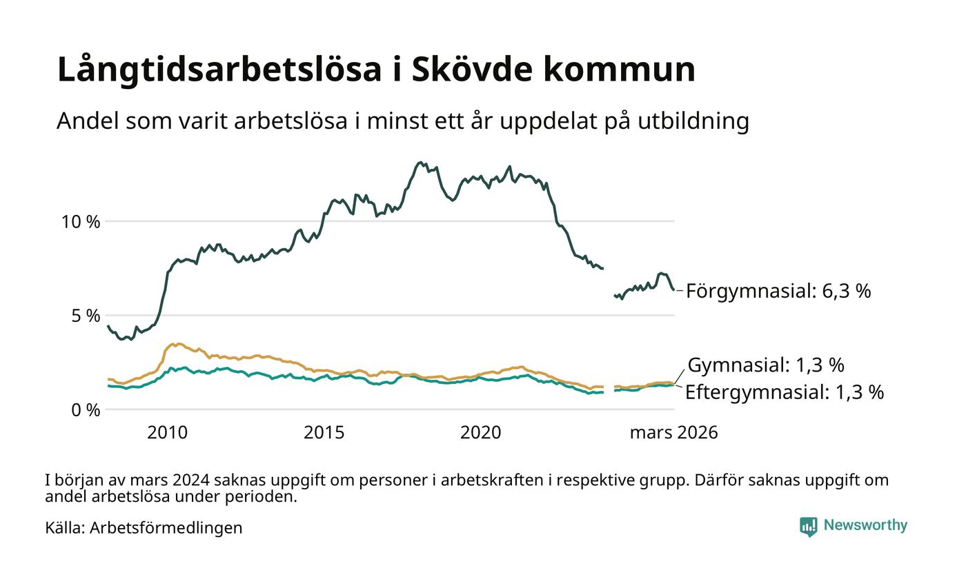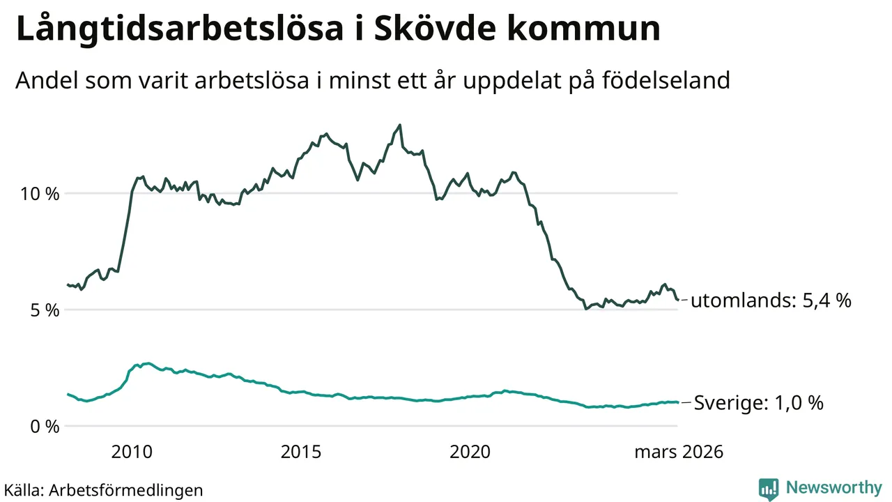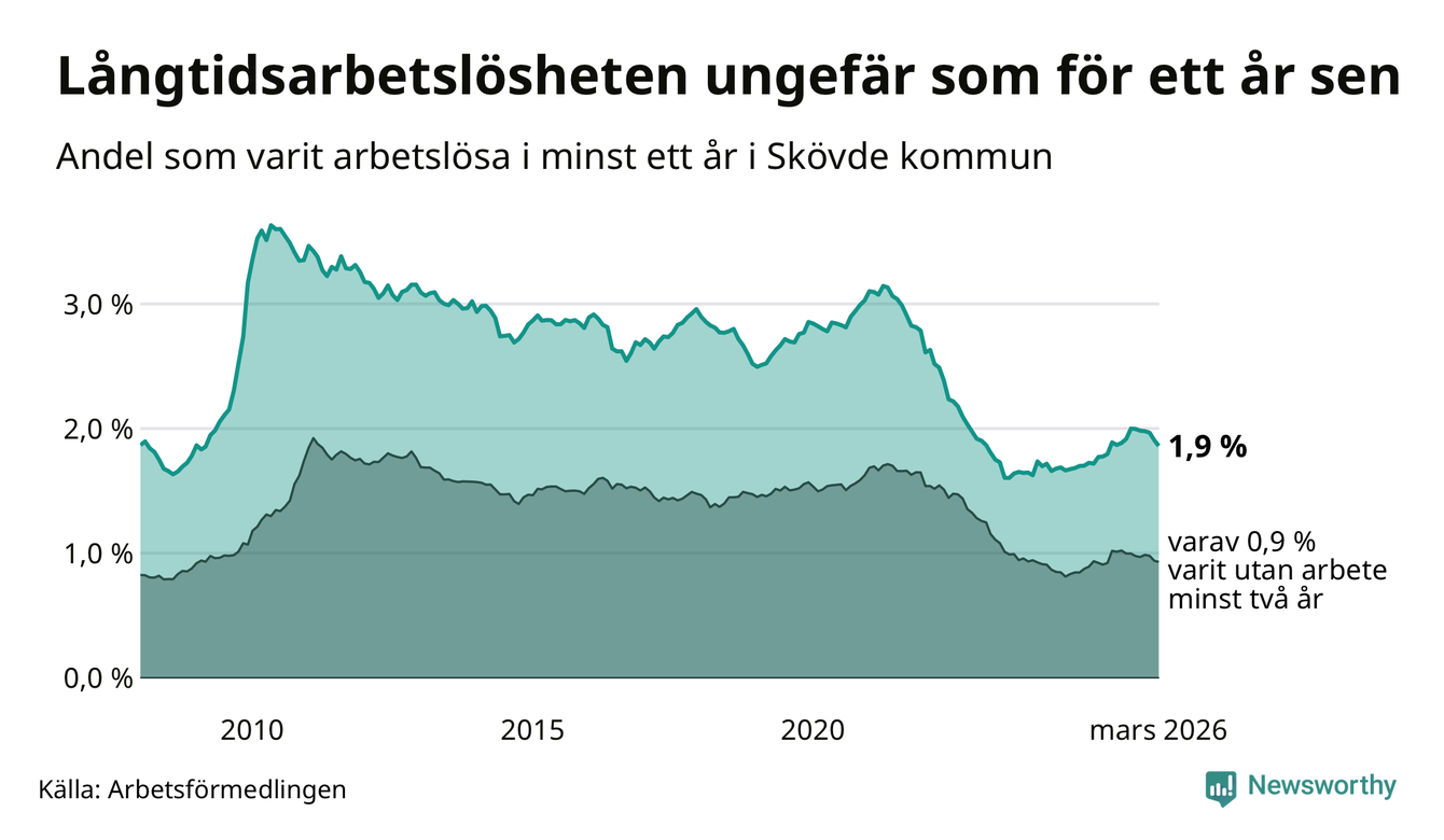 I mars hade 560 Skövdebor varit arbetslösa i minst ett år, vilket är 13 färre än månaden innan. 560 personer motsvarar 1,9 procent av arbetskraften i kommunen – andelen långtidsarbetslösa är ungefär på samma nivå som för ett år sedan.