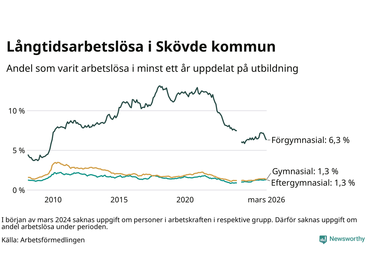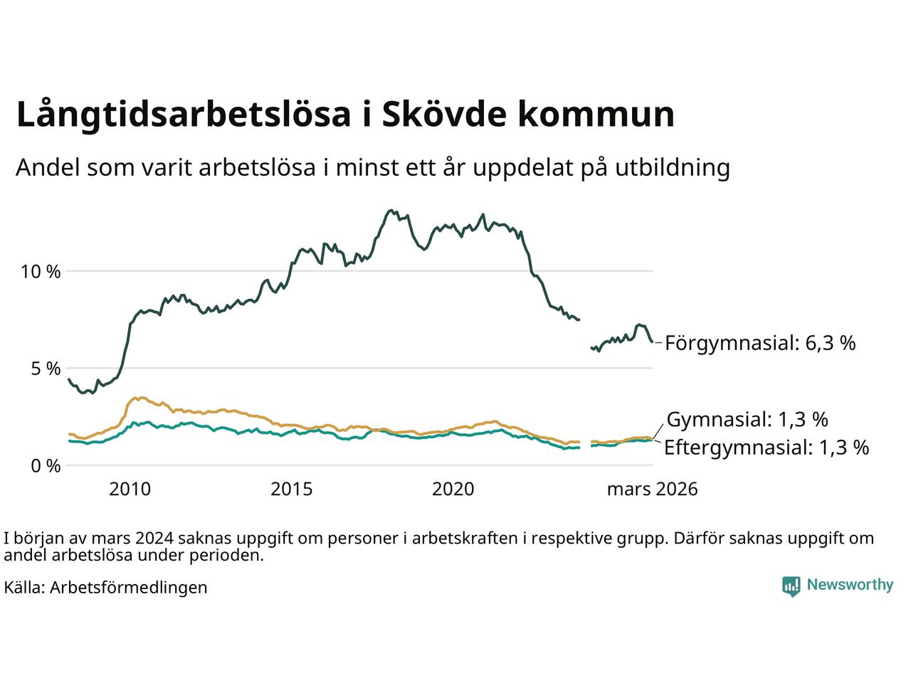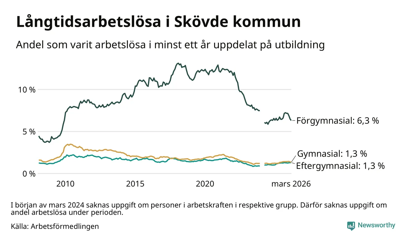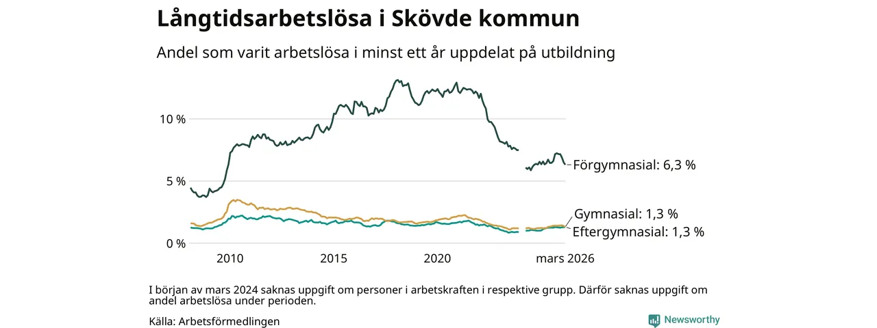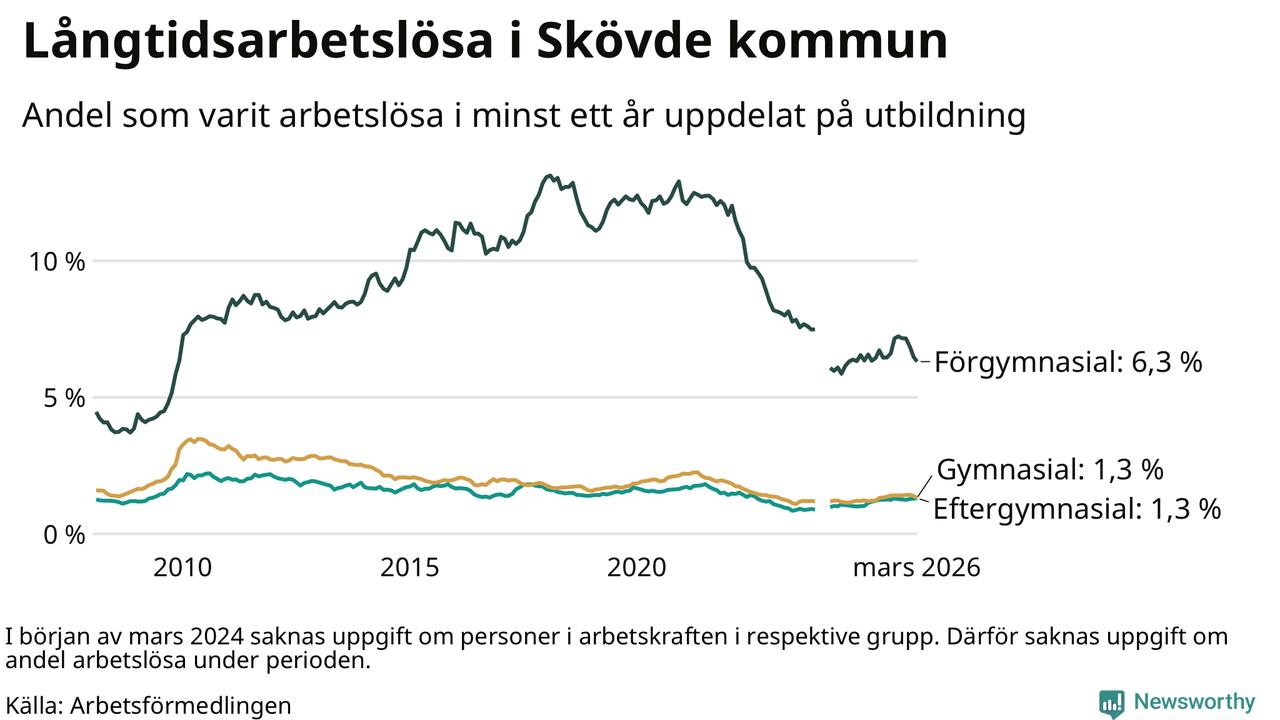 Andelen som varit utan arbete i minst ett år i Skövde var ungefär lika stor i mars jämfört med samma månad för ett år sedan. Det visar Arbetsfömedlingens senaste månadsstatistik.