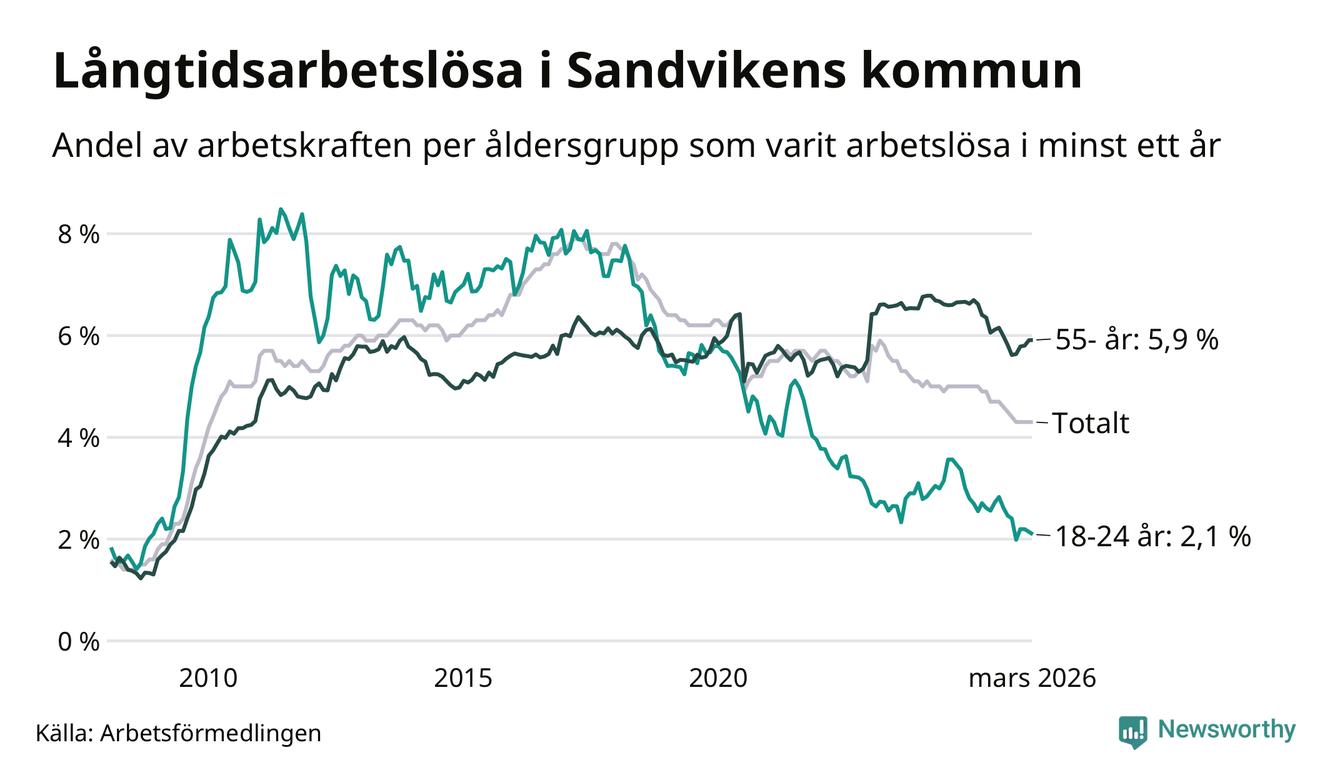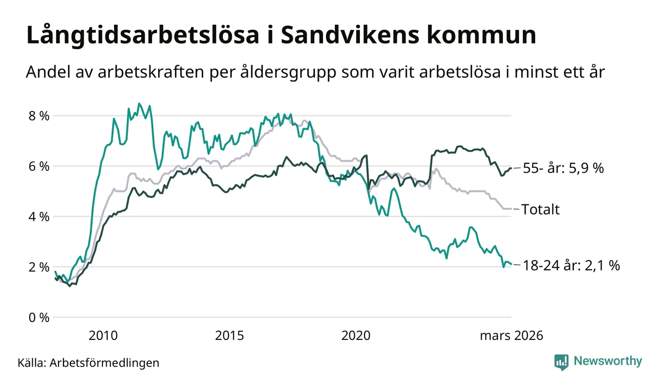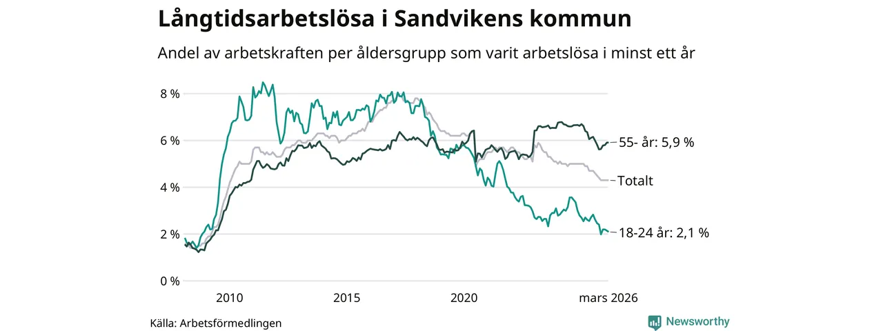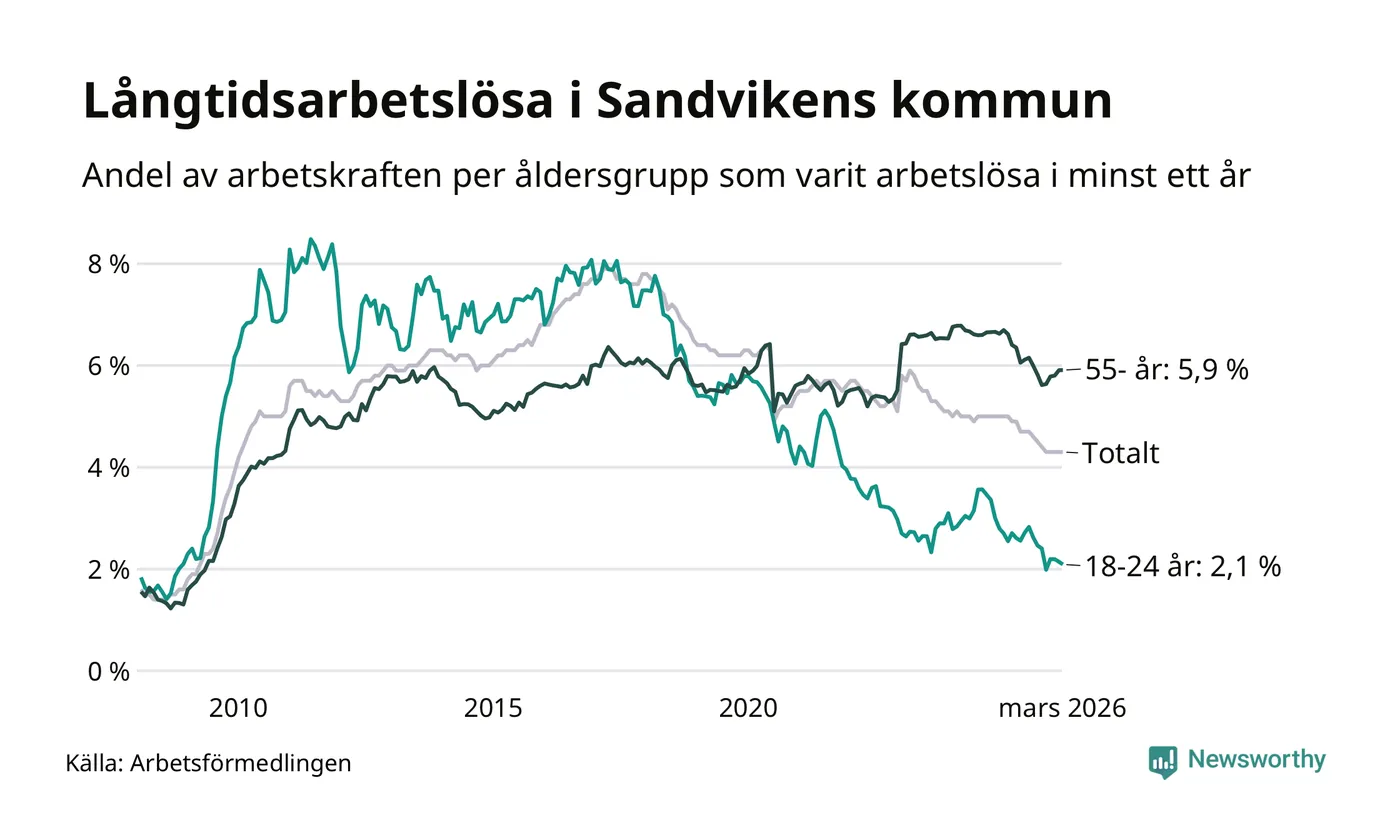 Av de 791 personerna som varit arbetslösa i mer än ett år i Sandvikens kommun är 272 personer mellan 55 och 661 år och 40 är mellan 18 och 24 år. För den äldre gruppen är andelen arbetslösa 5,9 procent medan den i den yngre gruppen är 2,1 procent. Även i riket som helhet är långtidsarbetslösheten högre i gruppen äldre.