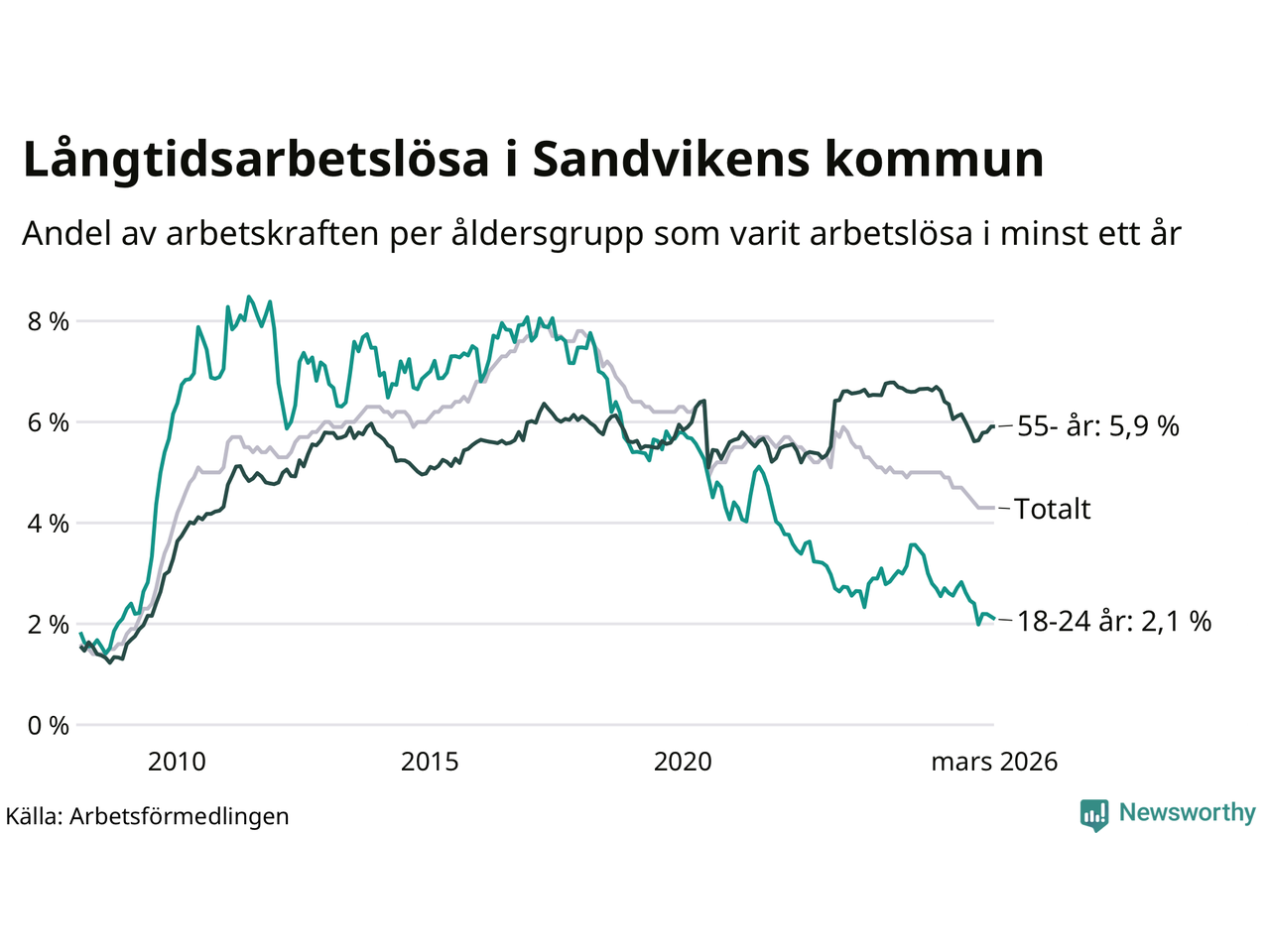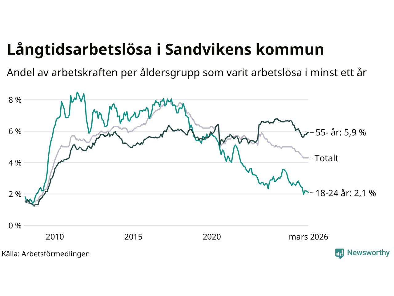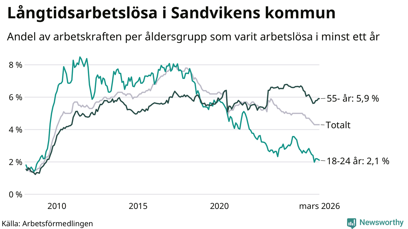 Graf: Andel arbetslösa uppdelat i åldersgrupper i Sandviken