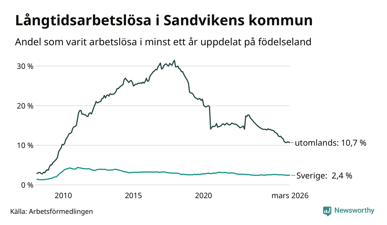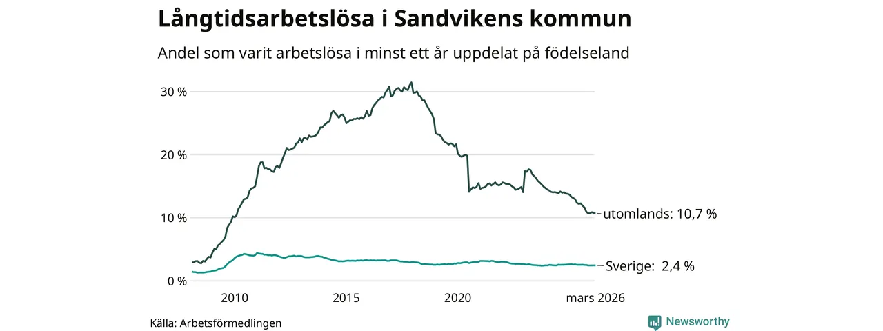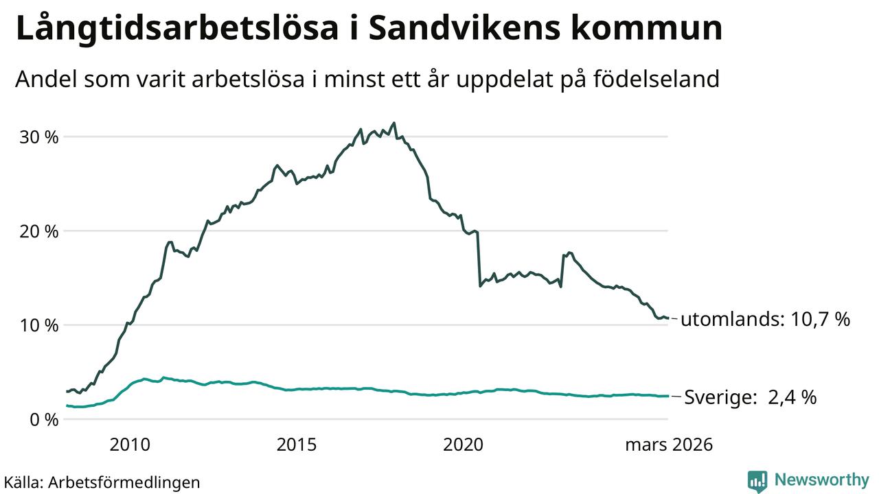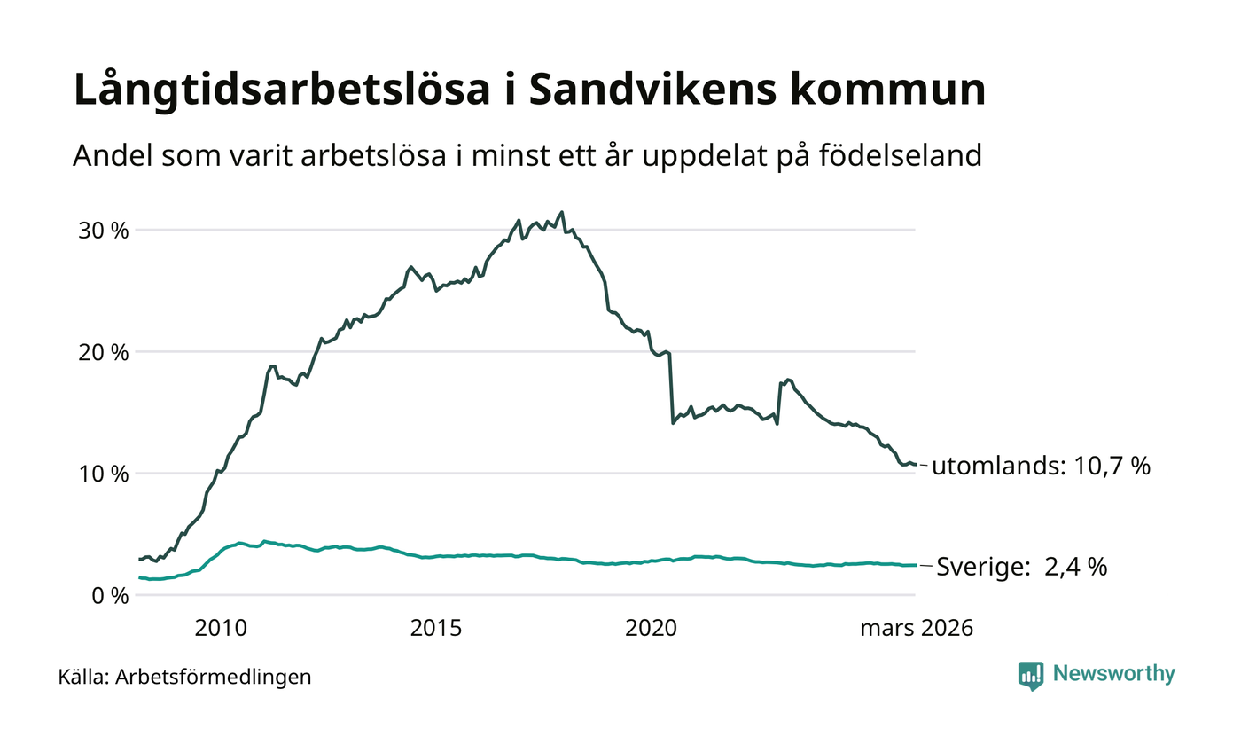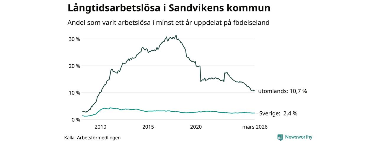 353 av de långtidsarbetslösa i Sandviken är födda i Sverige, medan 438 är födda utomlands. Det innebär att långtidsarbetslösheten bland Sverigefödda är 2,4 procent, medan den är fyra gånger så hög – 10,7 procent – bland födda utomlands. Även i riket som helhet är arbetslösheten högre bland utrikesfödda.