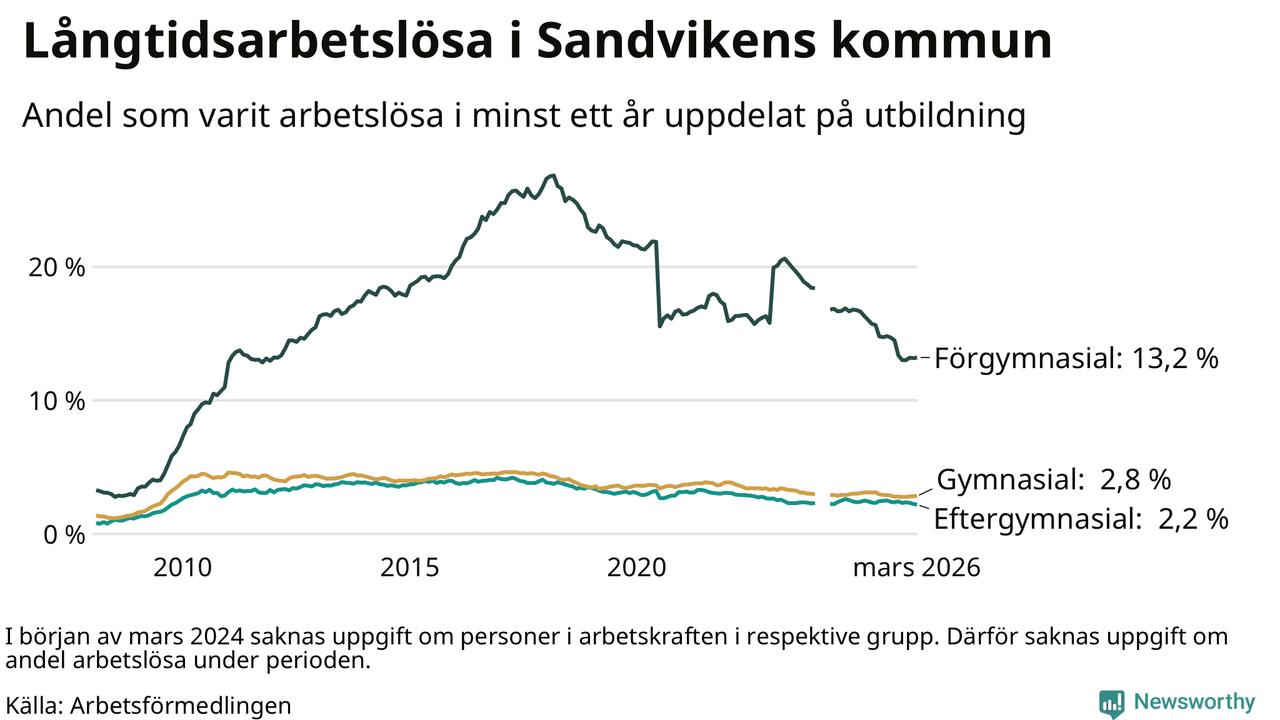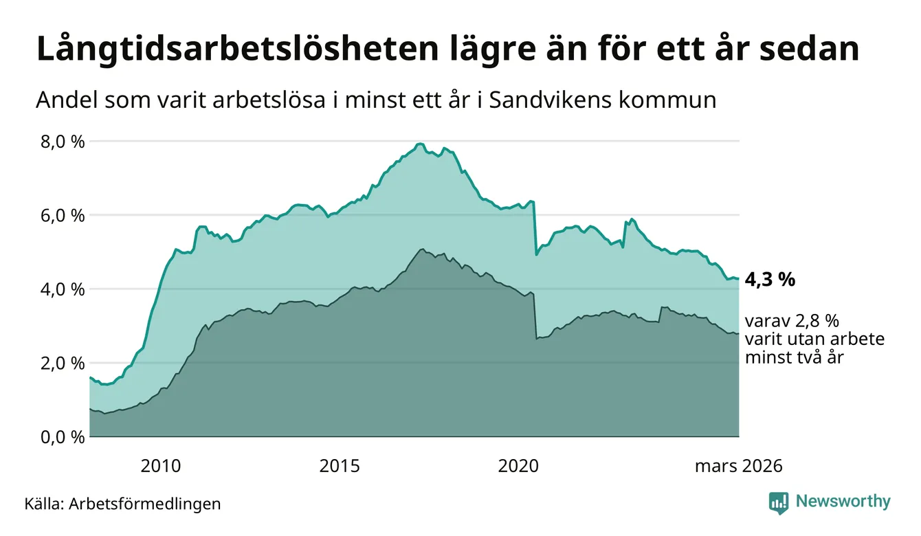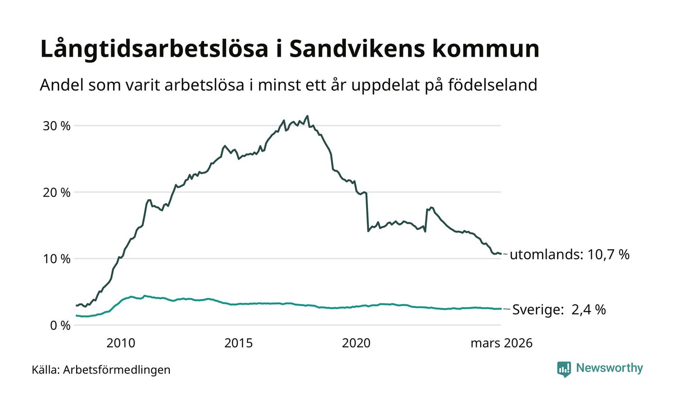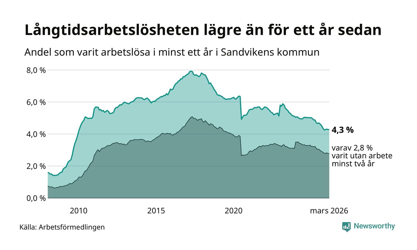 I mars hade 791 Sandvikenbor varit arbetslösa i minst ett år, vilket är två färre än månaden innan. 791 personer motsvarar 4,3 procent av arbetskraften i kommunen – andelen långtidsarbetslösa är 0,6 procentenheter lägre än samma månad för ett år sedan. Sandviken tillhör de kommuner som har högst andel långtidsarbetslösa i hela landet just nu.