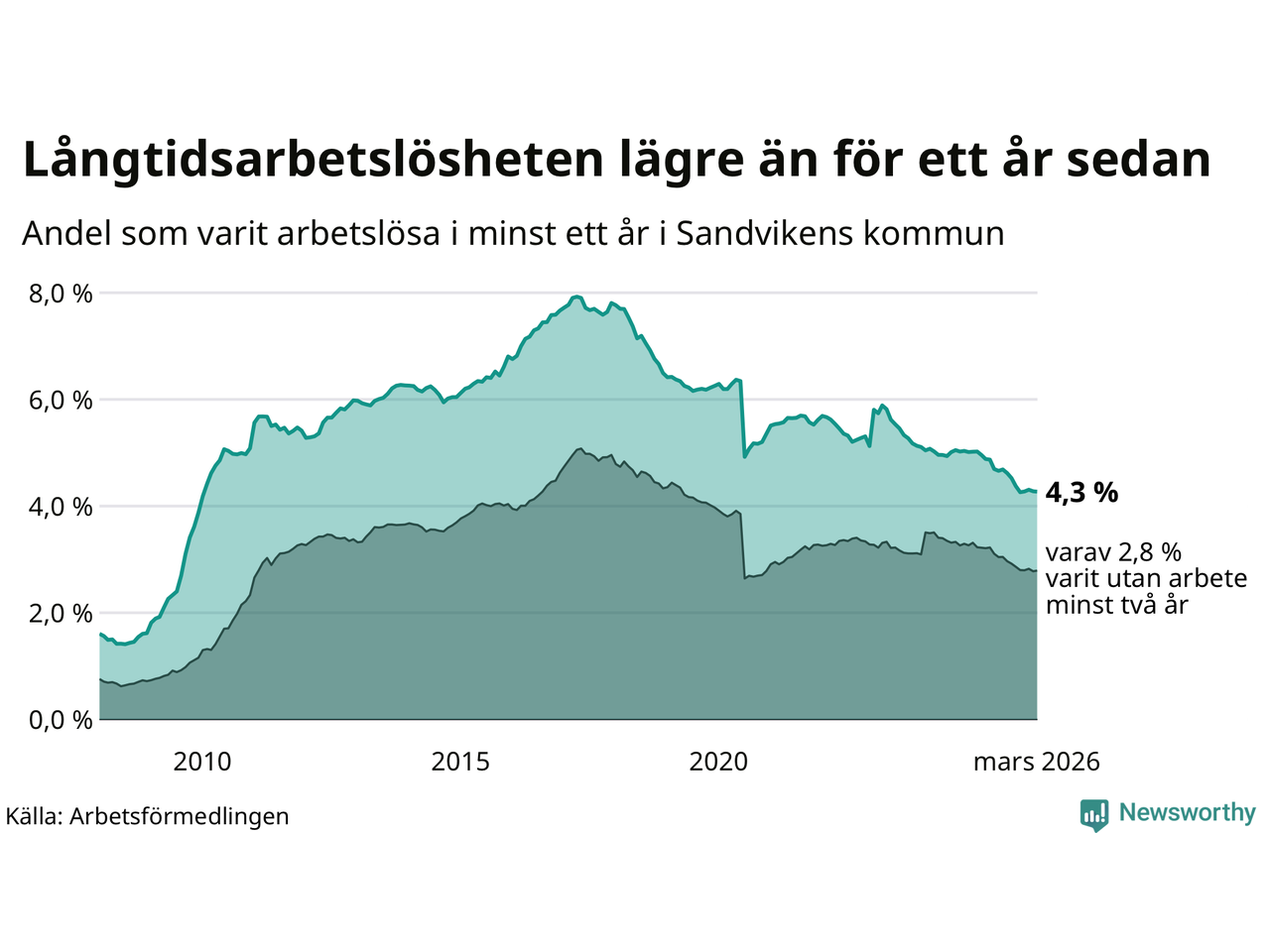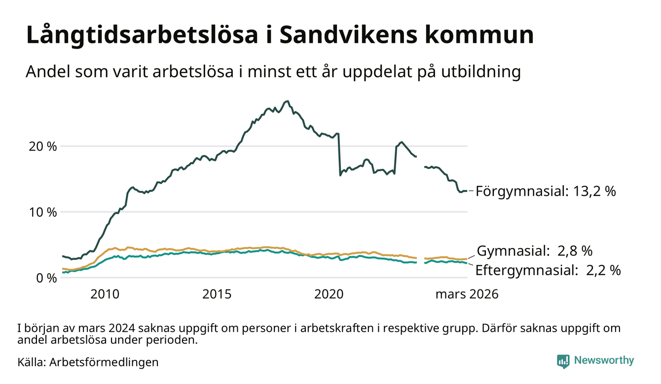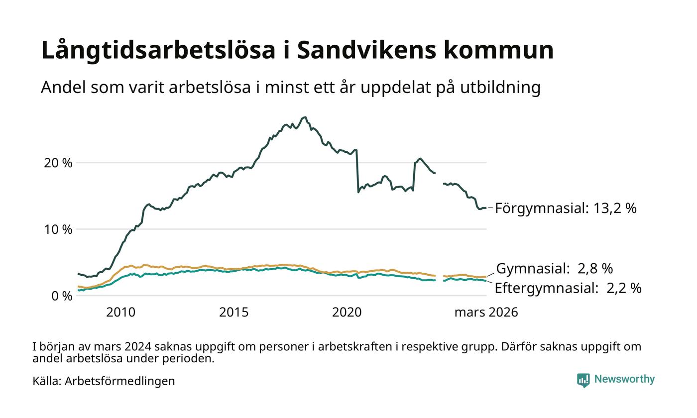 I mars hade 791 Sandvikenbor varit arbetslösa i minst ett år, vilket är två färre än månaden innan. 791 personer motsvarar 4,3 procent av arbetskraften i kommunen – andelen långtidsarbetslösa är 0,6 procentenheter lägre än samma månad för ett år sedan. Sandviken tillhör de kommuner som har högst andel långtidsarbetslösa i hela landet just nu.
