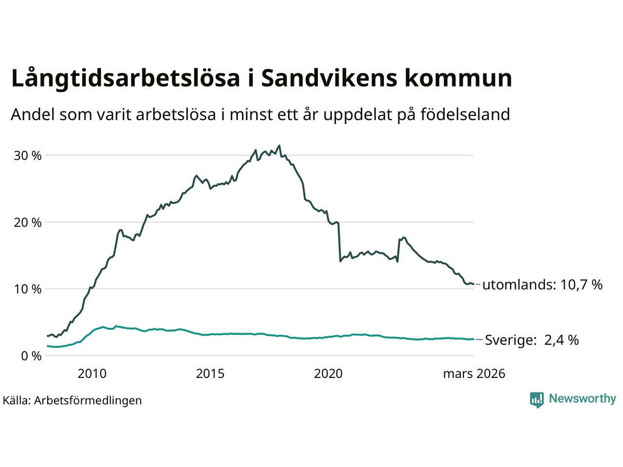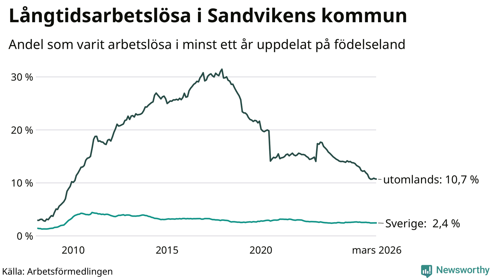 Graf: Andel arbetslösa uppdelat på födelseland i Sandviken
