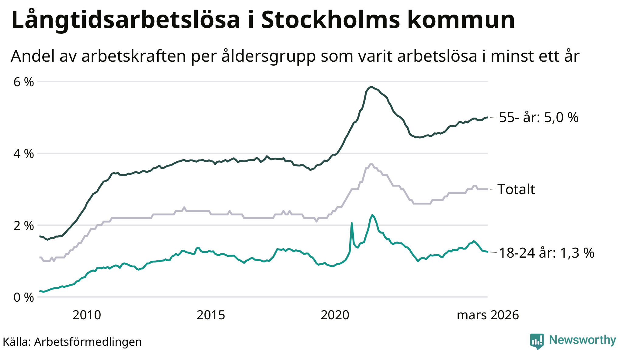 | Andel arbetslösa i minst två år | 1,6 % | 1,6 % | 1,6 % |