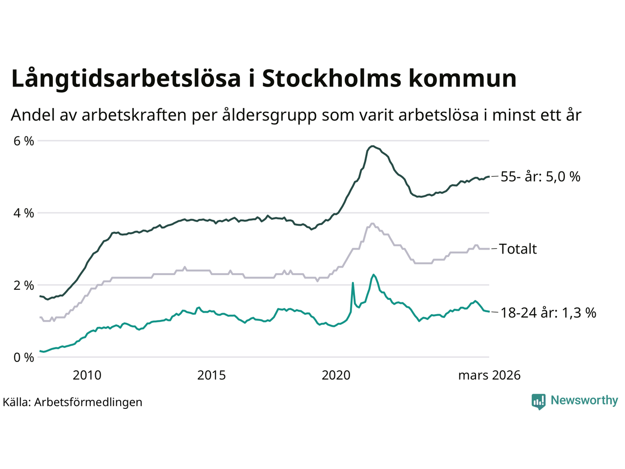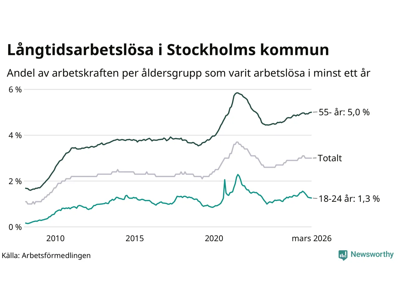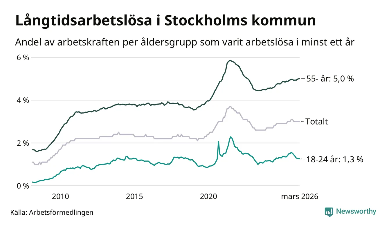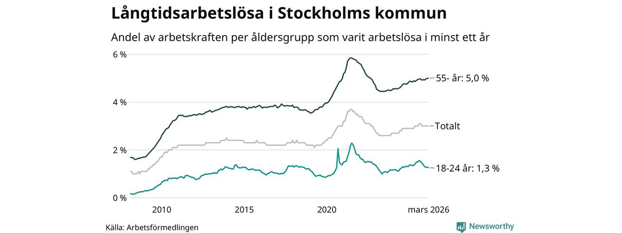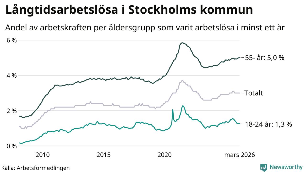 Av de 16 463 personerna som varit arbetslösa i mer än ett år i Stockholms kommun är 4 981 personer mellan 55 och 661 år och 555 är mellan 18 och 24 år. För den äldre gruppen är andelen arbetslösa 5,0 procent medan den i den yngre gruppen är 1,3 procent. Även i riket som helhet är långtidsarbetslösheten högre i gruppen äldre.
