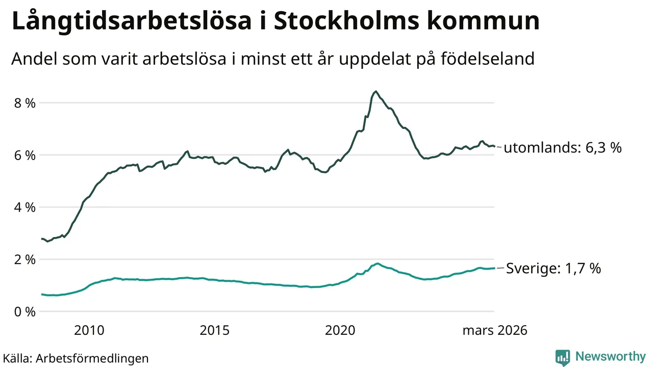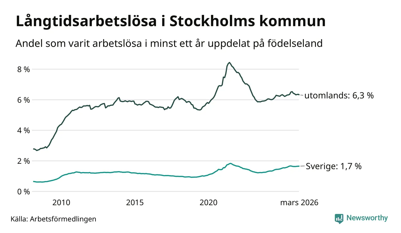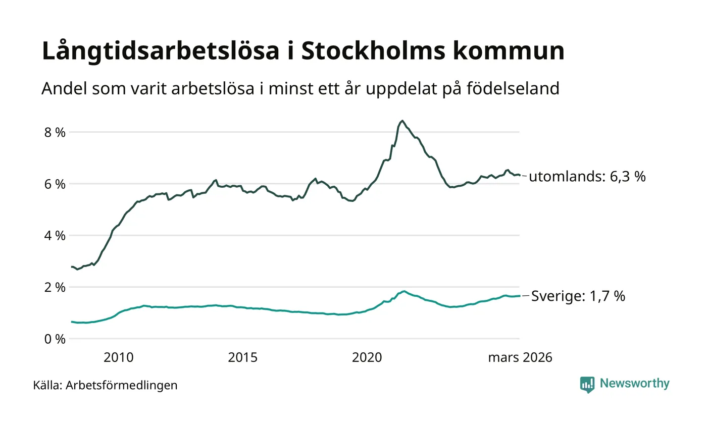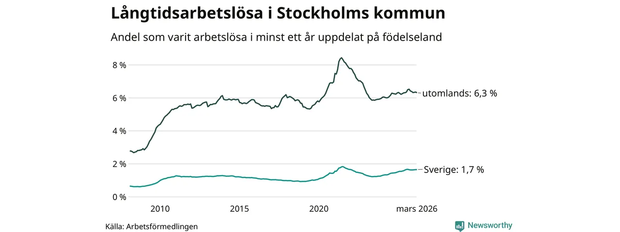 6 330 av de långtidsarbetslösa i Stockholms kommun är födda i Sverige, medan 10 133 är födda utomlands. Det innebär att långtidsarbetslösheten bland Sverigefödda är 1,7 procent, medan den är fyra gånger så hög – 6,3 procent – bland födda utomlands. Även i riket som helhet är arbetslösheten högre bland utrikesfödda.
