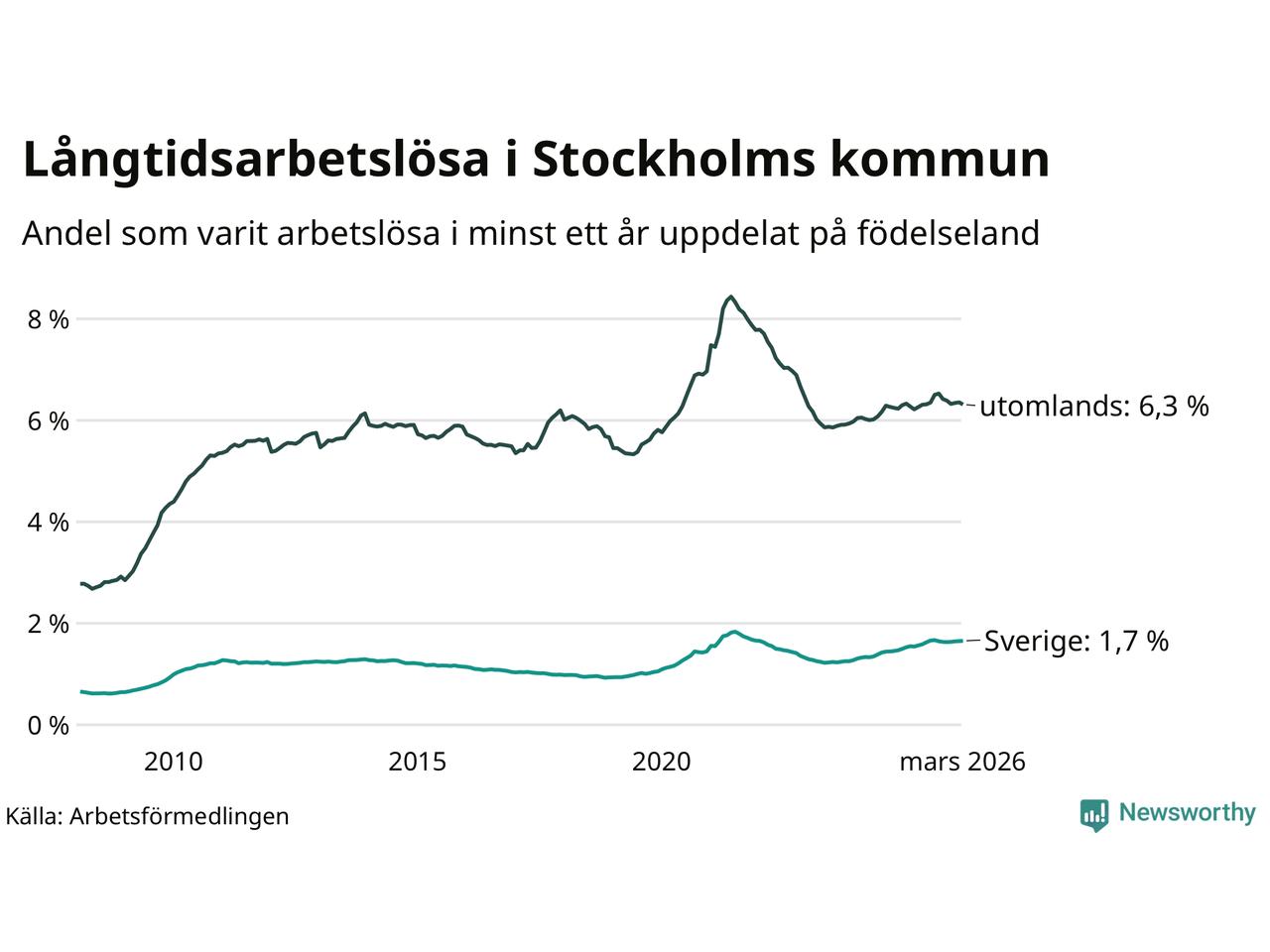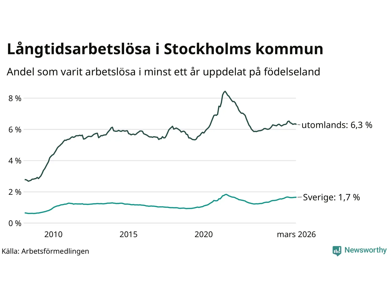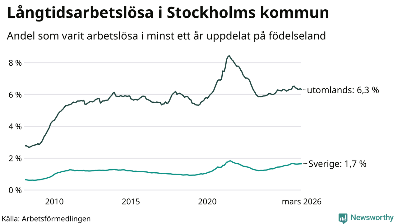 6 330 av de långtidsarbetslösa i Stockholms kommun är födda i Sverige, medan 10 133 är födda utomlands. Det innebär att långtidsarbetslösheten bland Sverigefödda är 1,7 procent, medan den är fyra gånger så hög – 6,3 procent – bland födda utomlands. Även i riket som helhet är arbetslösheten högre bland utrikesfödda.