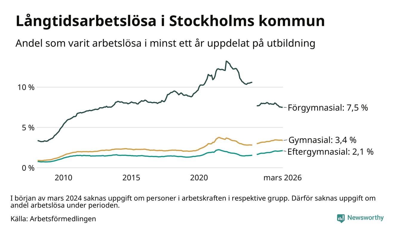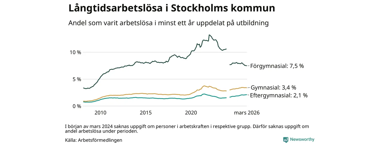 Andelen som varit utan arbete i minst ett år i Stockholms kommun var ungefär lika stor i mars jämfört med samma månad för ett år sedan. Det visar Arbetsfömedlingens senaste månadsstatistik.