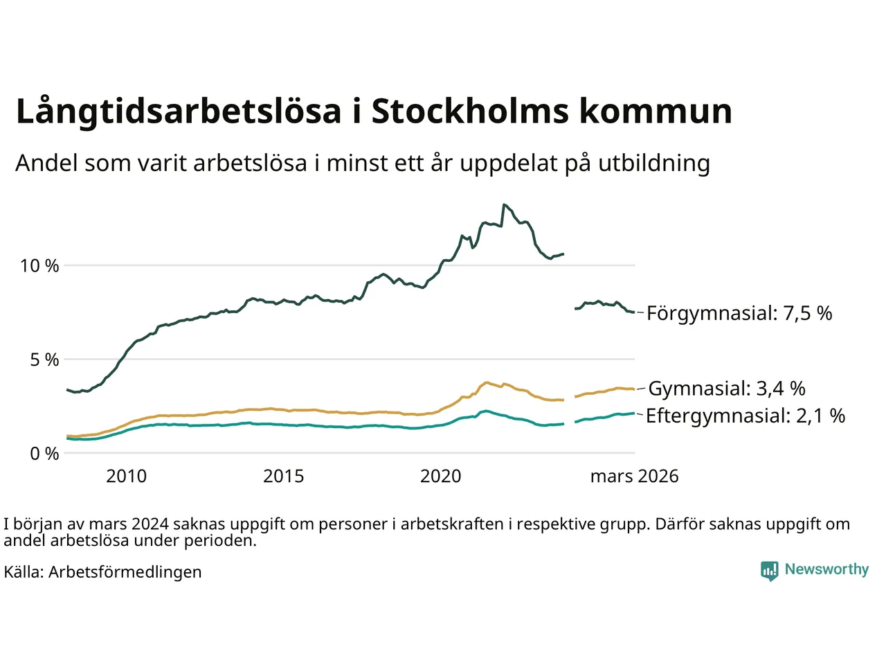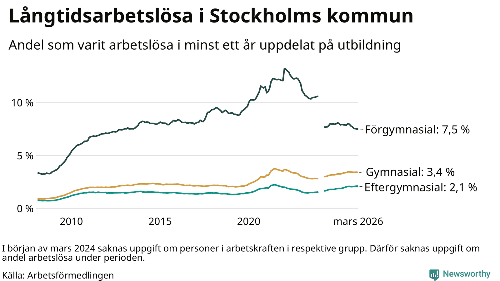 | Bland dem med gymnasieutbildning | 3,4 % | 2,8 % | 2,4 % |