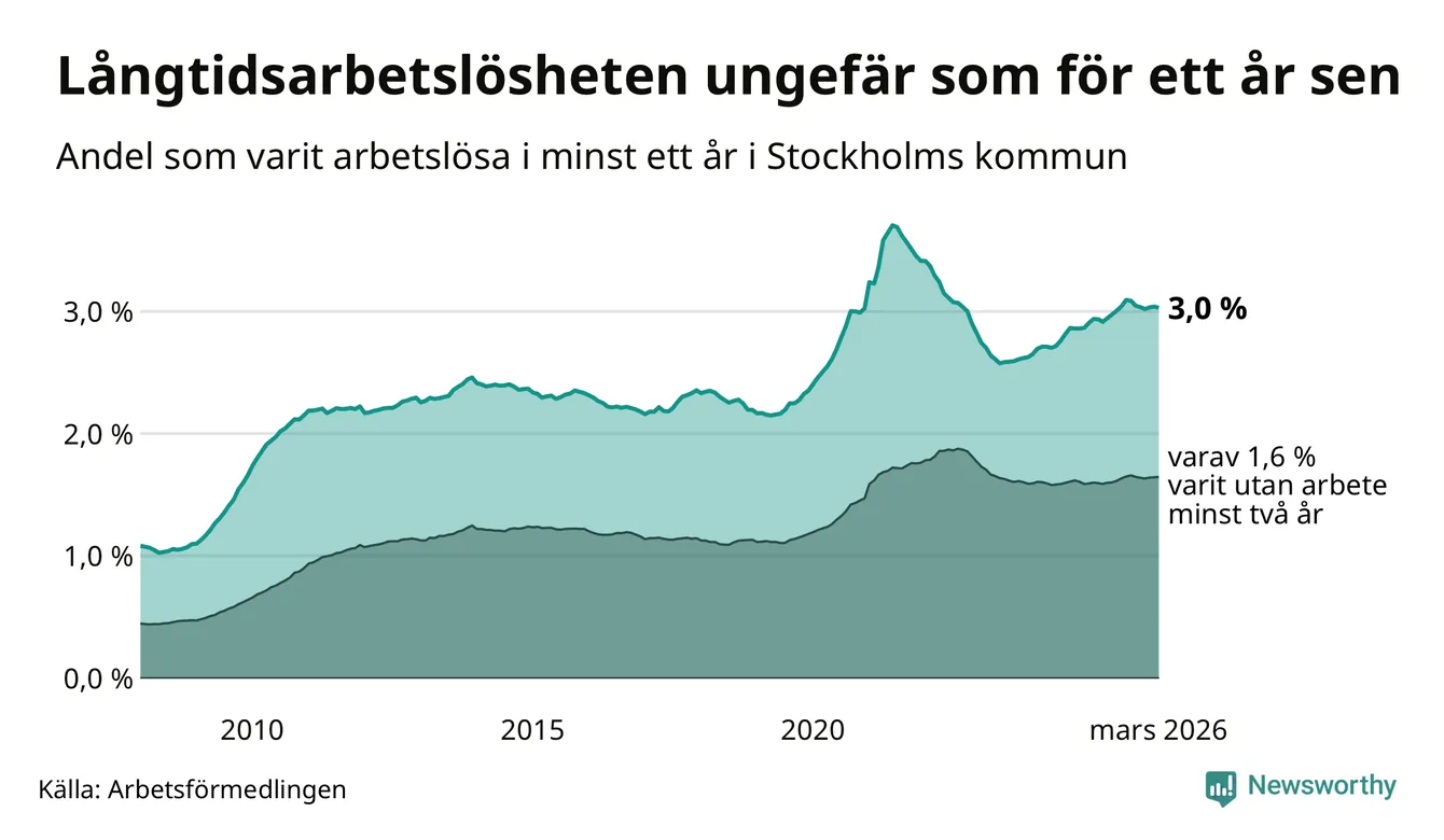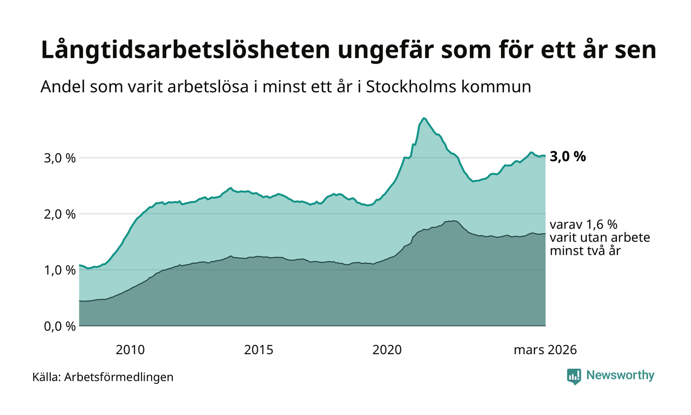 I mars hade 16 463 Stockholmsbor varit arbetslösa i minst ett år, vilket är 45 färre än månaden innan. 16 463 personer motsvarar 3,0 procent av arbetskraften i kommunen – andelen långtidsarbetslösa är ungefär på samma nivå som för ett år sedan.