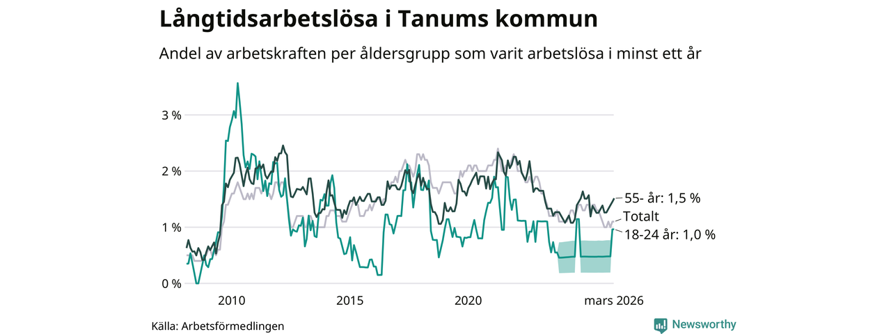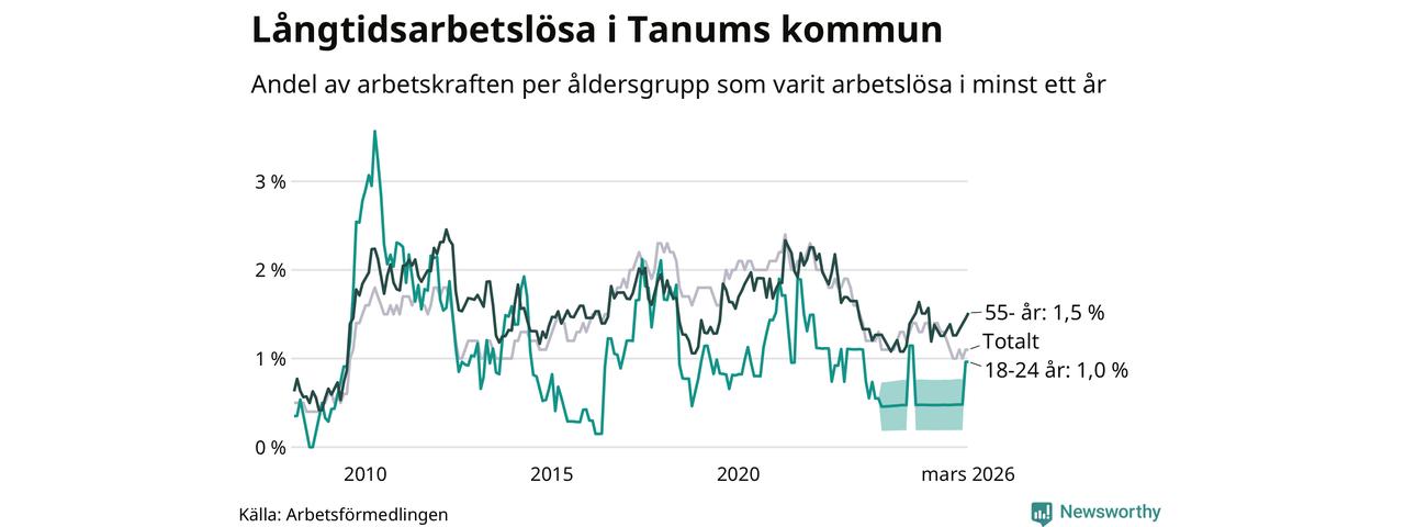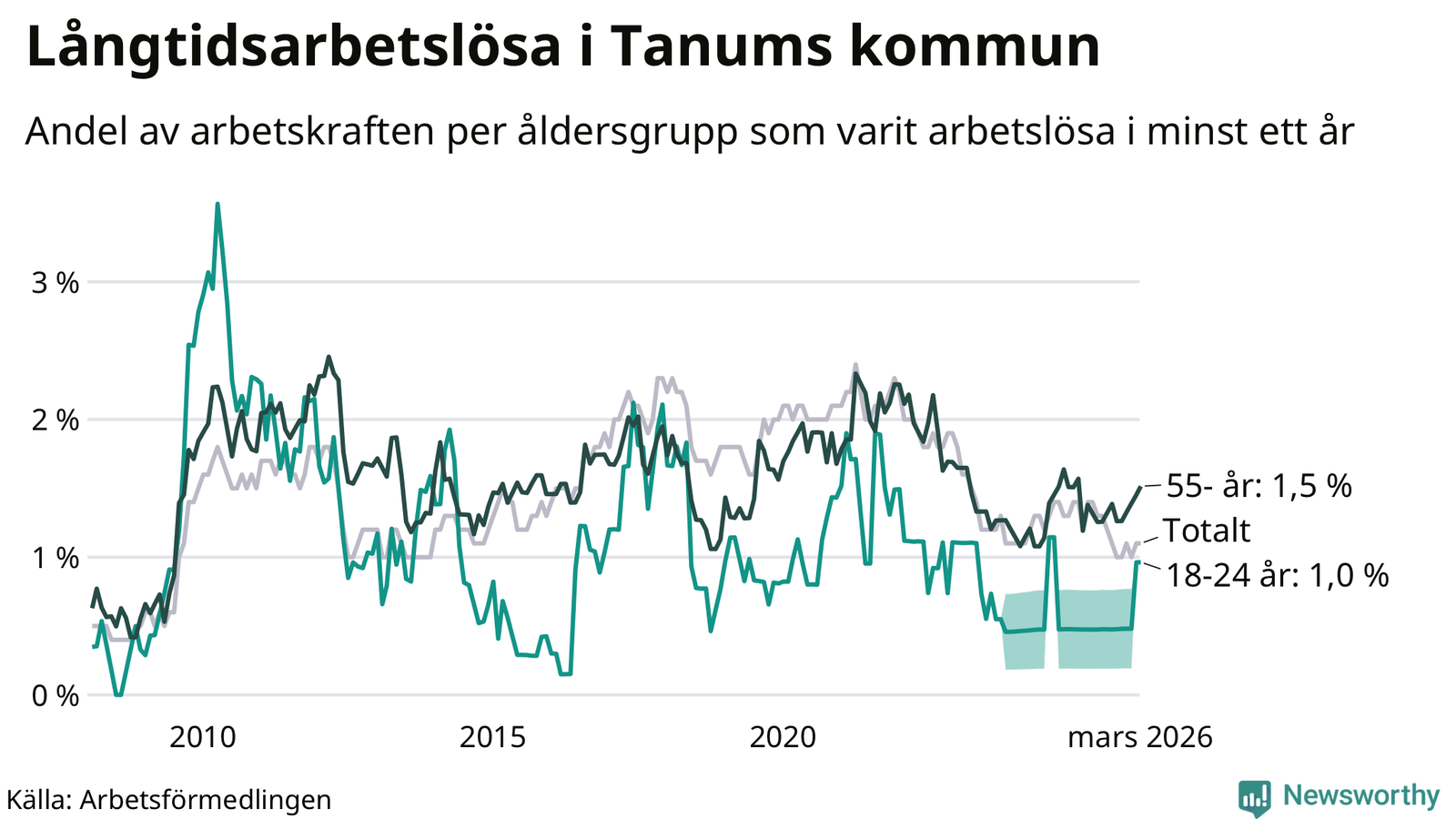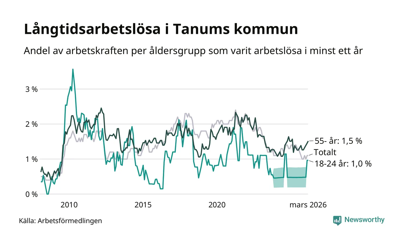 Av de 61 personerna som varit arbetslösa i mer än ett år i Tanums kommun är 24 personer mellan 55 och 661 år och fem är mellan 18 och 24 år. För den äldre gruppen är andelen arbetslösa 1,5 procent medan den i den yngre gruppen är 1,0 procent. Även i riket som helhet är långtidsarbetslösheten högre i gruppen äldre.