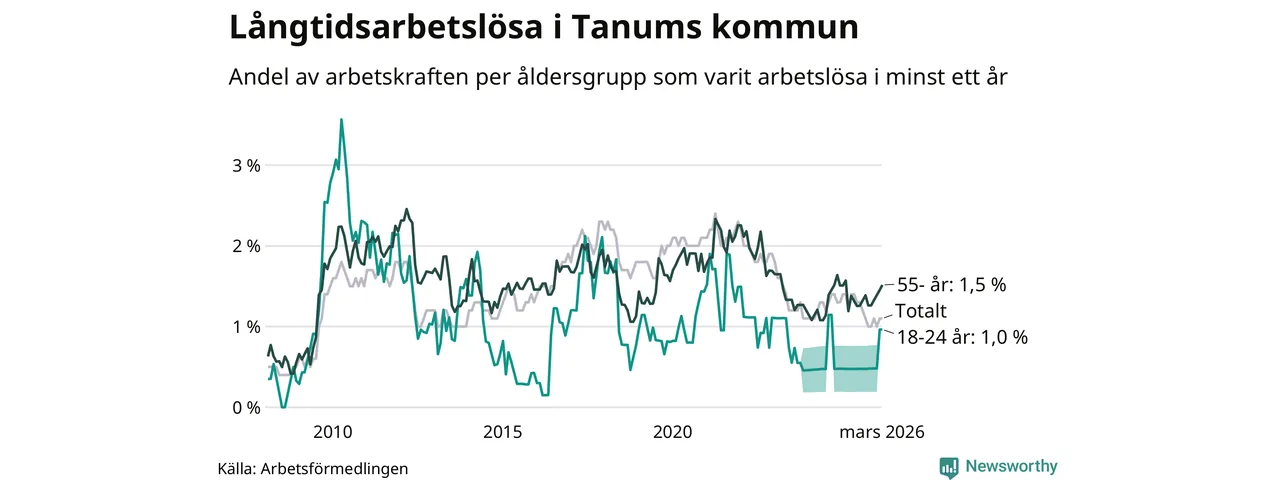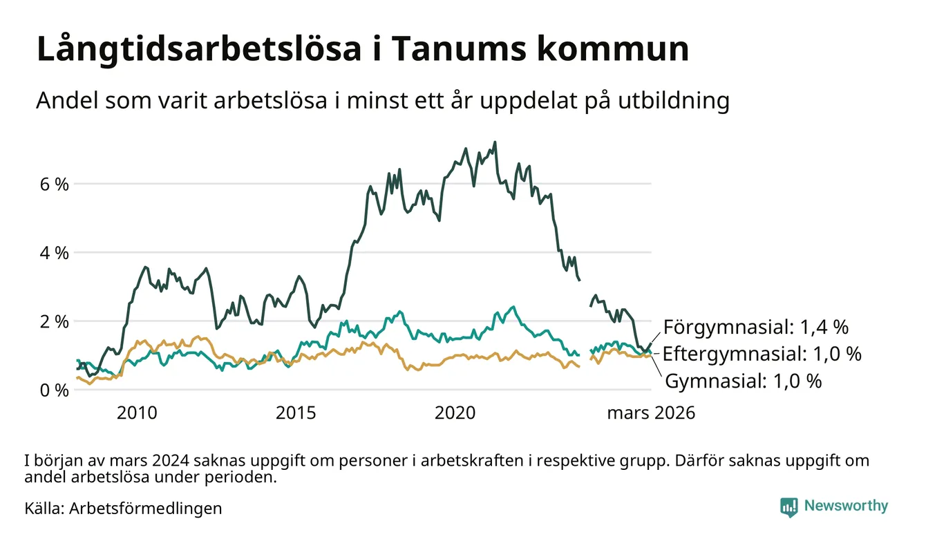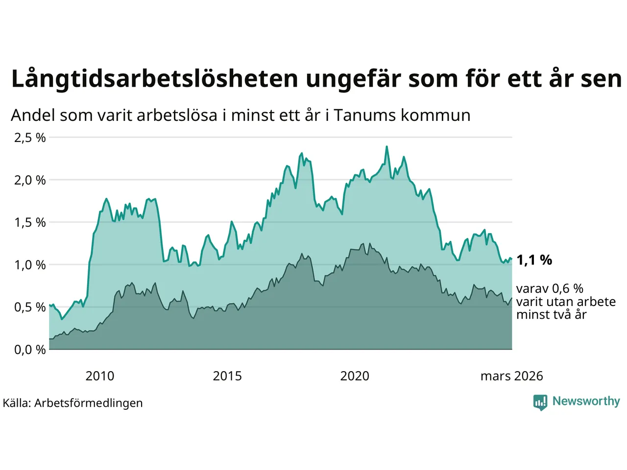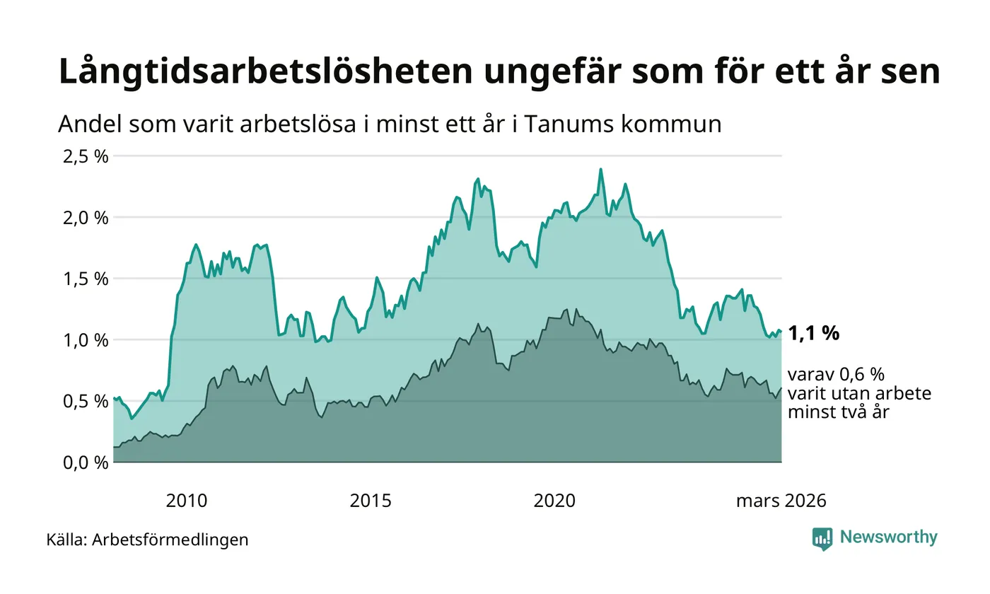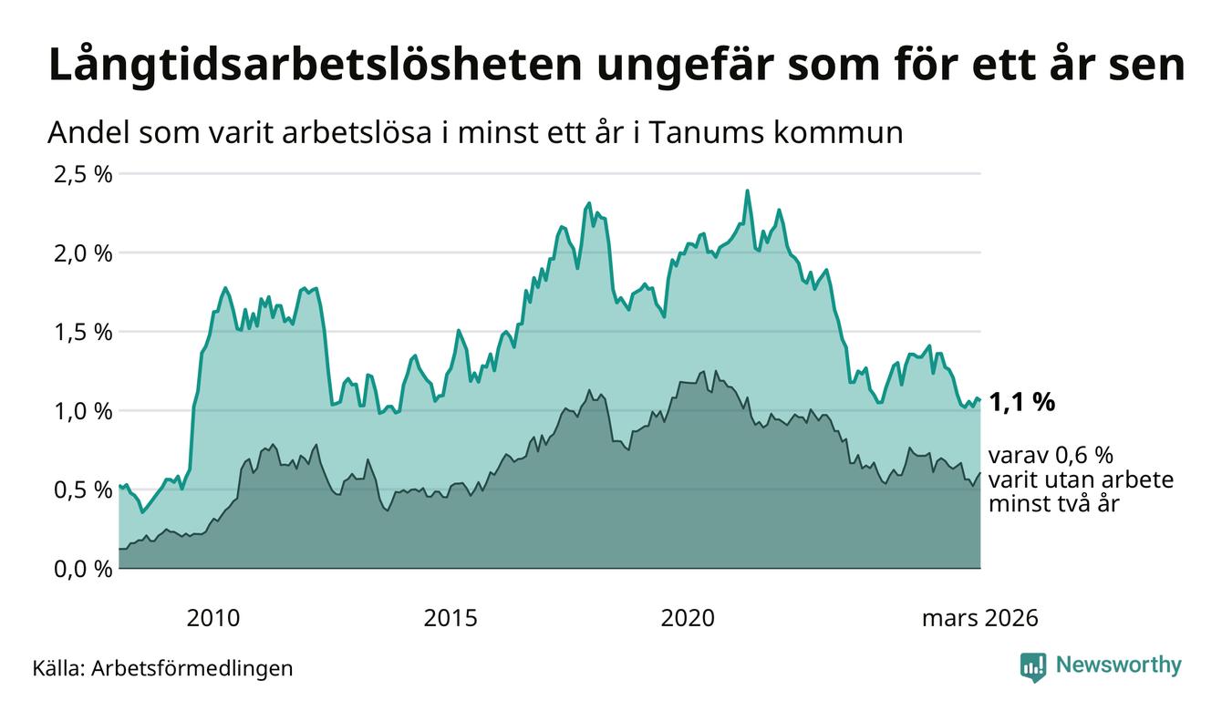 Andelen som varit utan arbete i minst ett år i Tanum var ungefär lika stor i mars jämfört med samma månad för ett år sedan. Det visar Arbetsfömedlingens senaste månadsstatistik.
