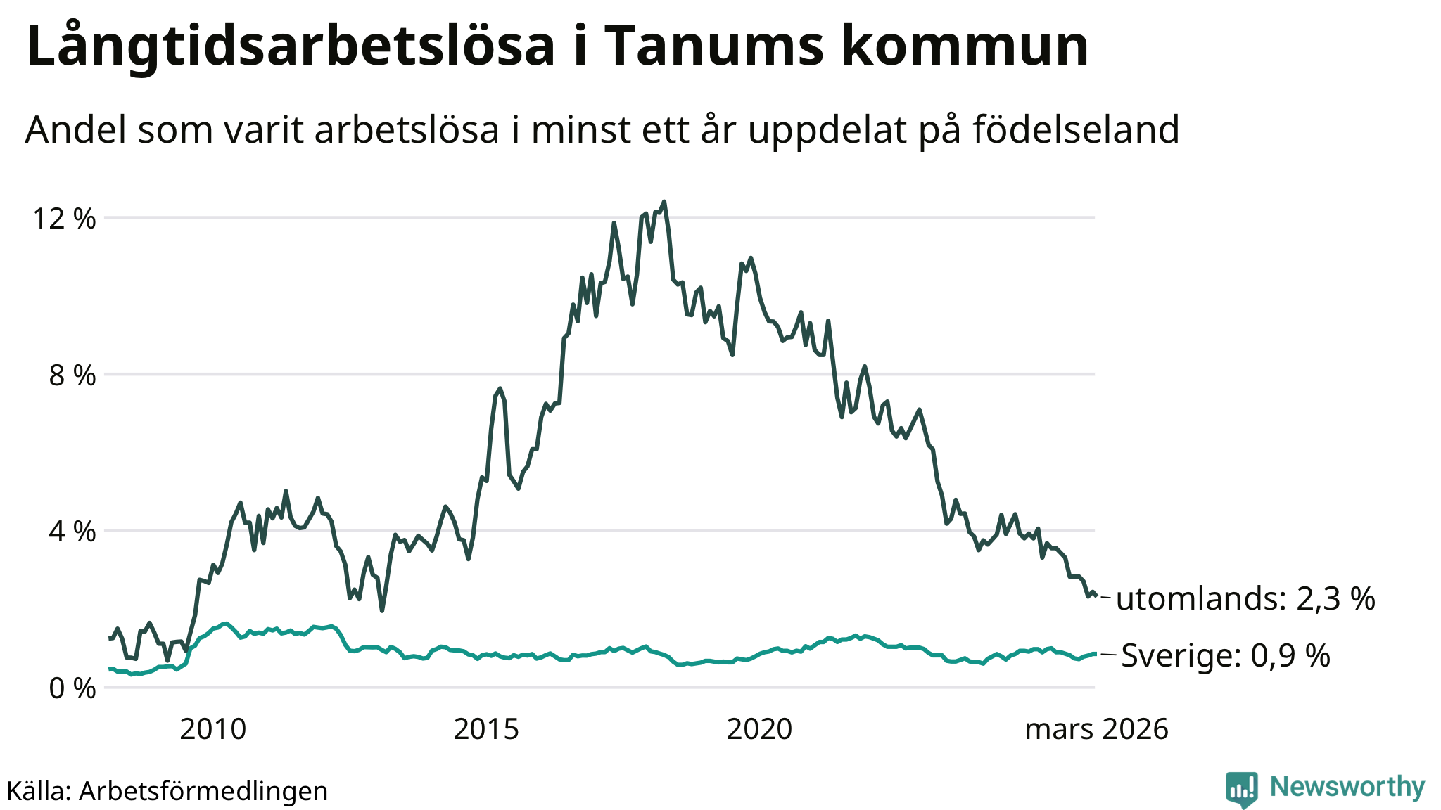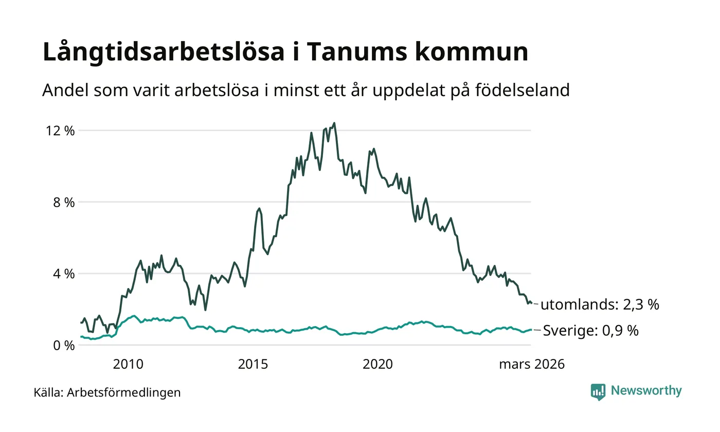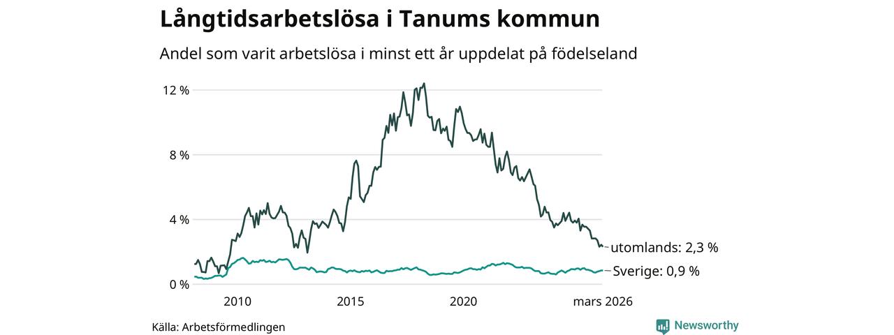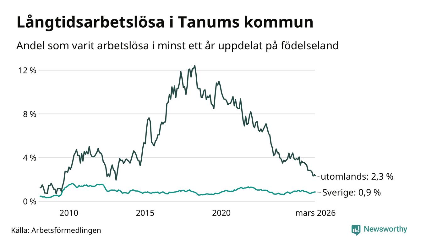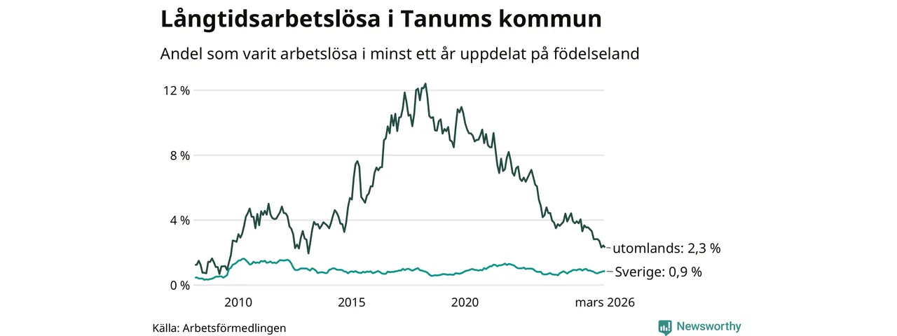 42 av de långtidsarbetslösa i Tanum är födda i Sverige, medan 19 är födda utomlands. Det innebär att långtidsarbetslösheten bland Sverigefödda är 0,9 procent, medan den är tre gånger så hög – 2,3 procent – bland födda utomlands. Även i riket som helhet är arbetslösheten högre bland utrikesfödda.