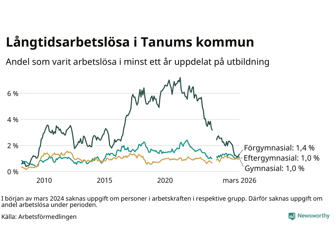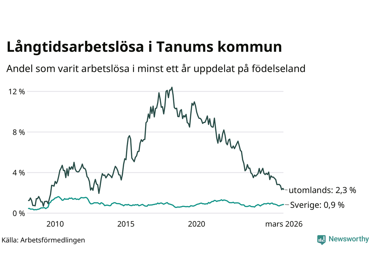 I mars hade 61 Tanumsbor varit arbetslösa i minst ett år, vilket är en färre än månaden innan. 61 personer motsvarar 1,1 procent av arbetskraften i kommunen – andelen långtidsarbetslösa är ungefär på samma nivå som för ett år sedan. Tanum tillhör de kommuner som har lägst andel långtidsarbetslösa i hela landet just nu.