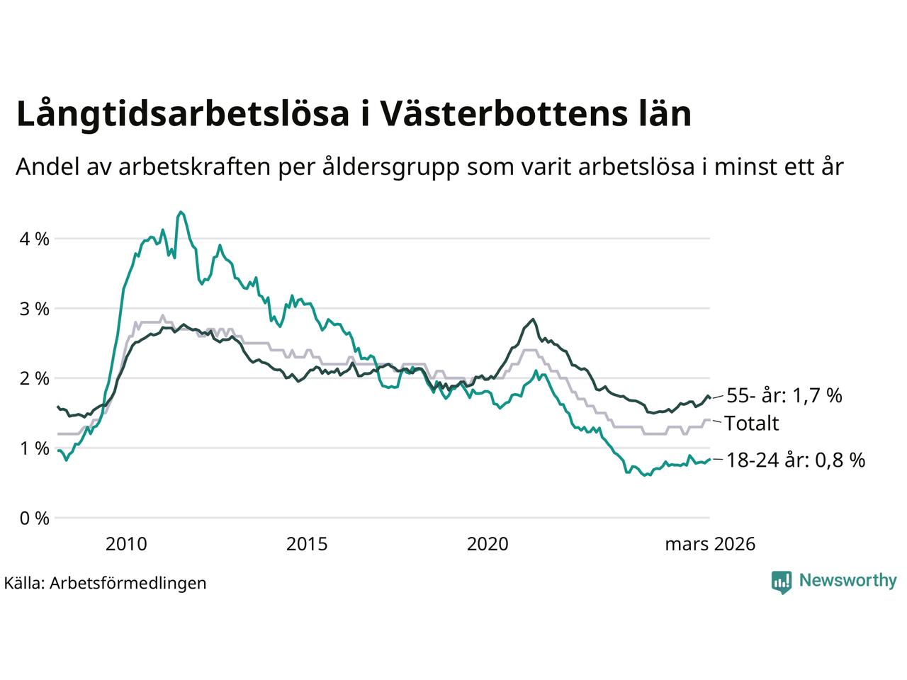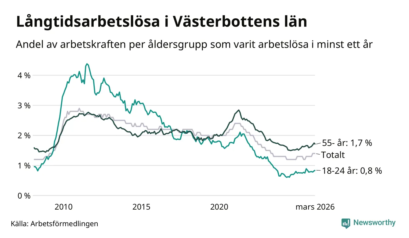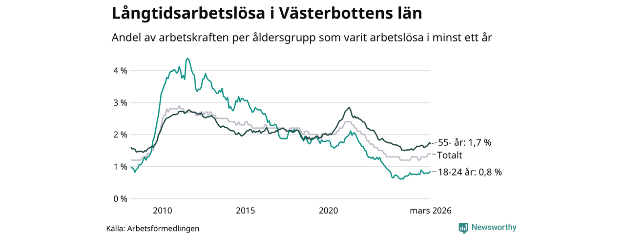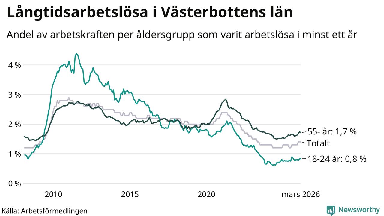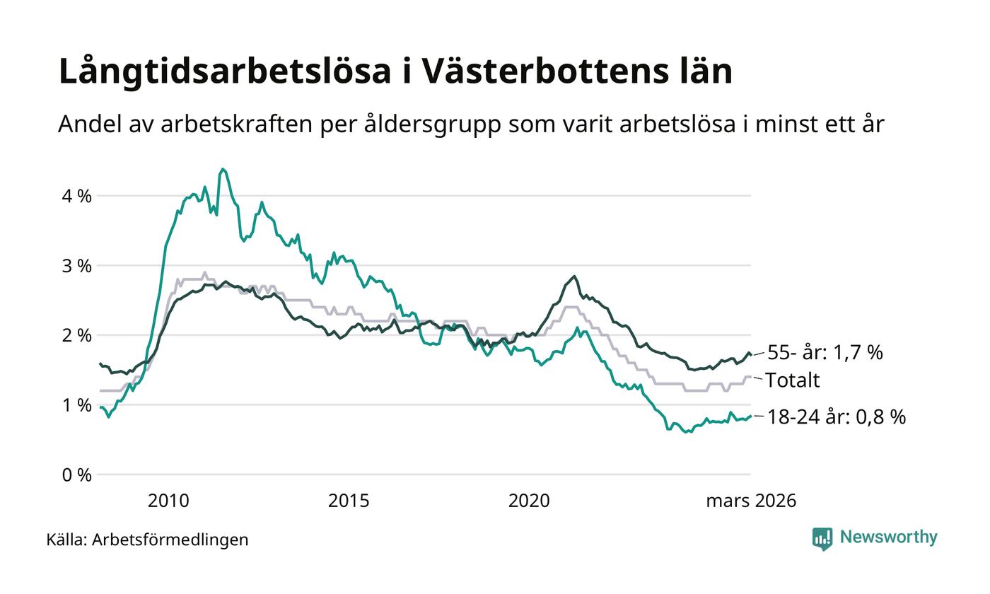Av de 1 990 personerna som varit arbetslösa i mer än ett år i Västerbottens län är mellan 485 och 485 personer mellan 55 och 661 år och mellan 137 och 137 är mellan 18 och 24 år. För den äldre gruppen är andelen arbetslösa 1,7 procent medan den i den yngre gruppen är 0,8 procent. Även i riket som helhet är långtidsarbetslösheten högre i gruppen äldre.