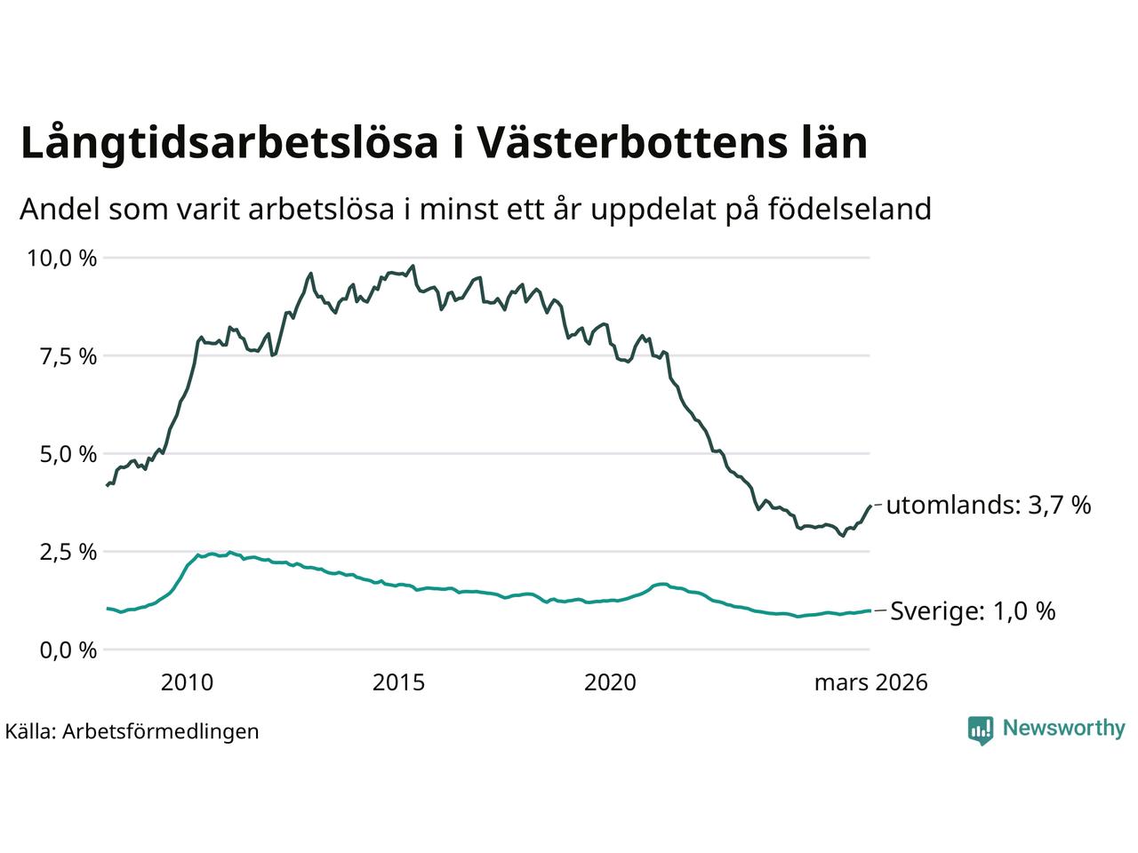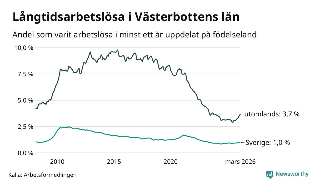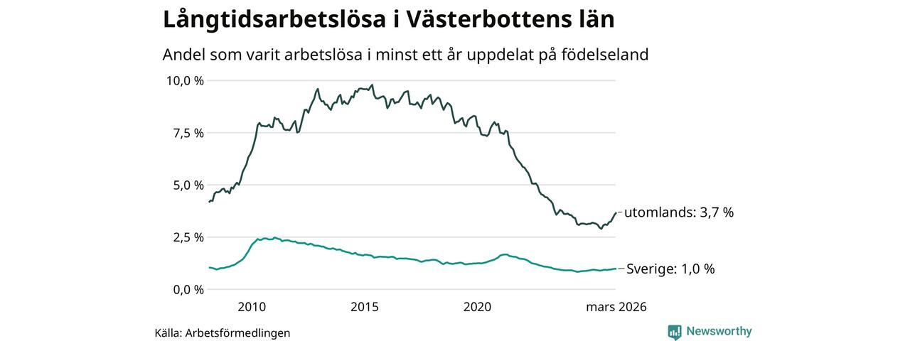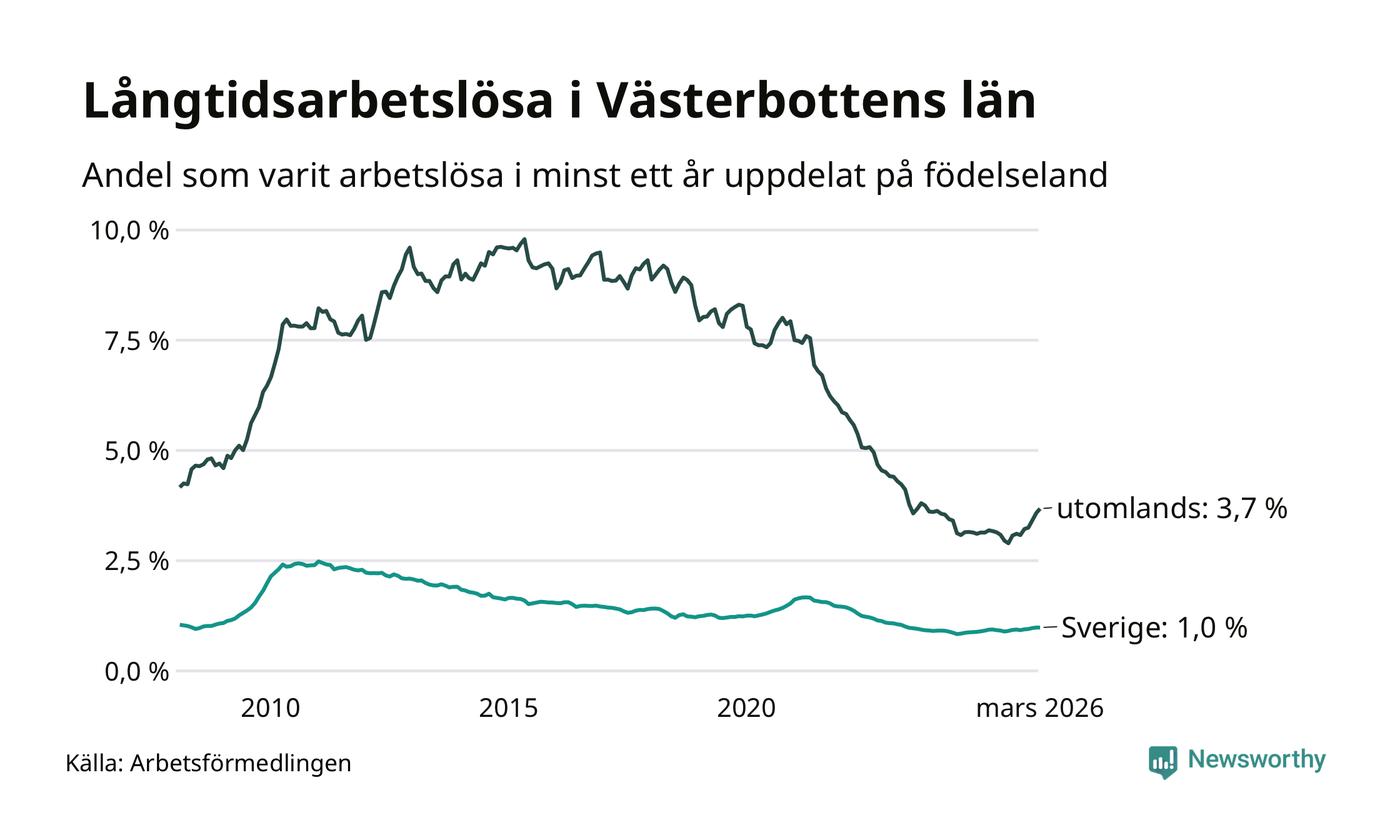 Mellan 1 168 och 1 171 av de långtidsarbetslösa i Västerbotten är födda i Sverige och mellan 817 och 823 är födda utomlands. Det innebär att långtidsarbetslösheten bland Sverigefödda är 1,0 procent, medan den ligger på 3,7 procent för utlandsfödda.
