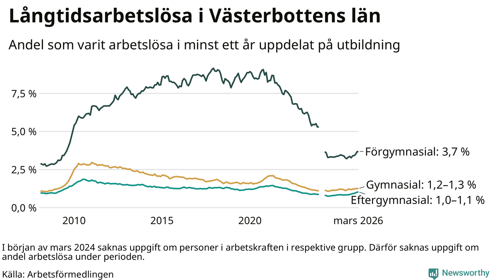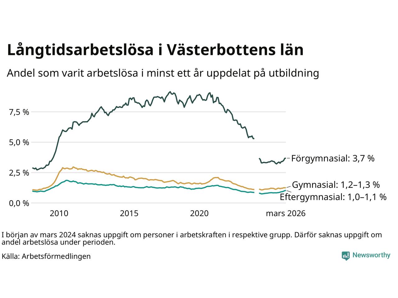 Graf över andel långtidsarbetslösa i Västerbotten uppdelat på utbildningsnivå