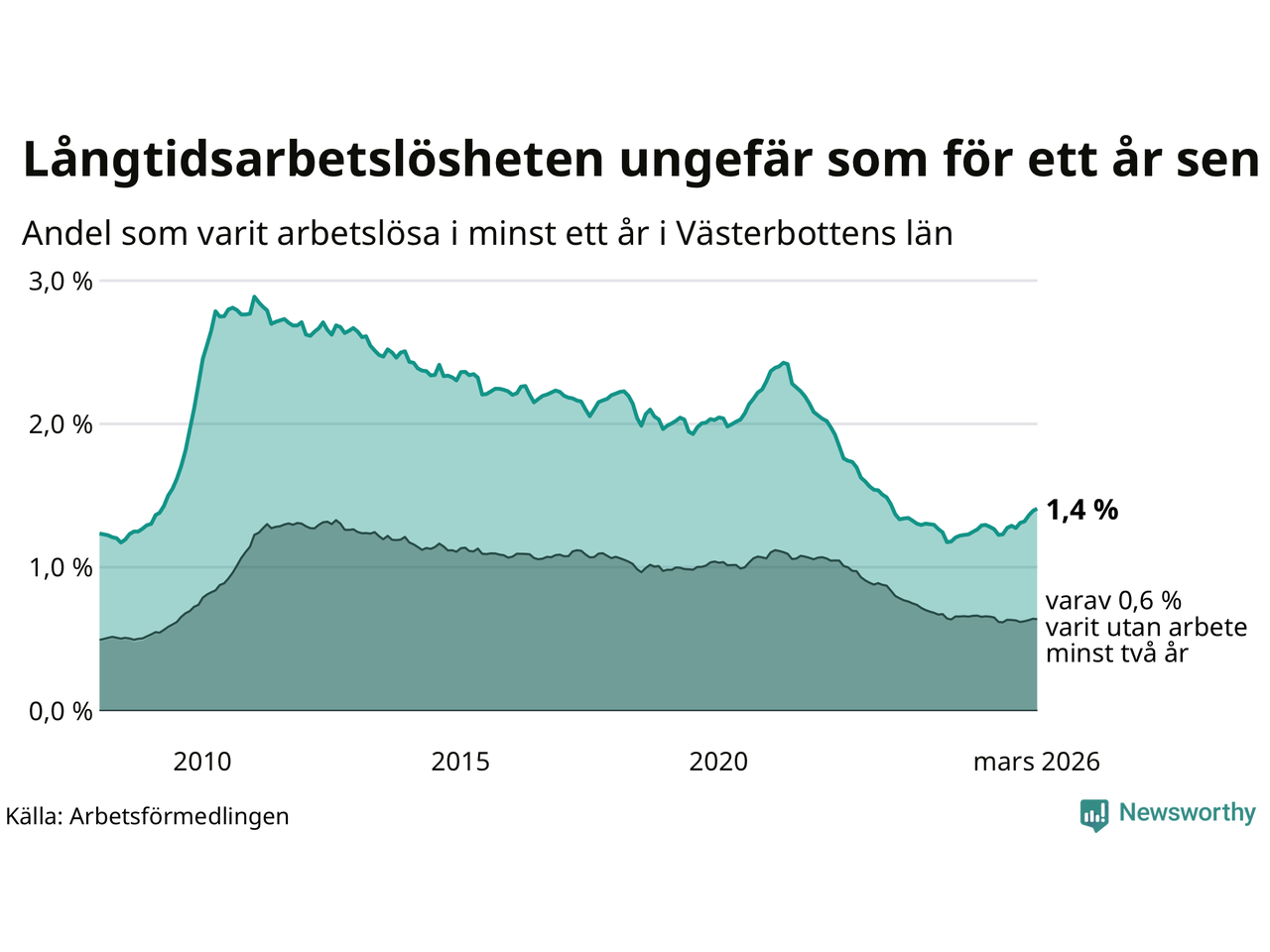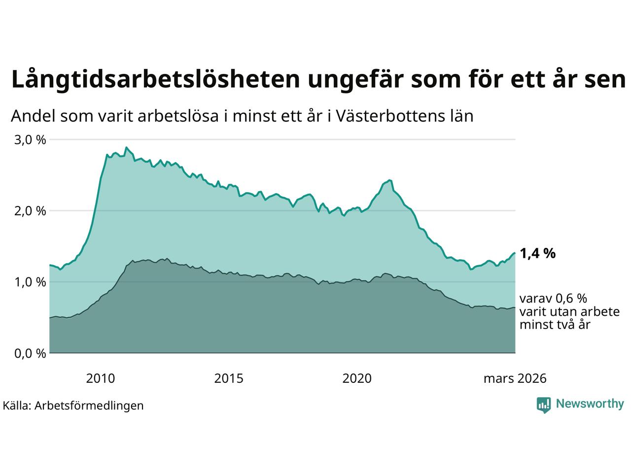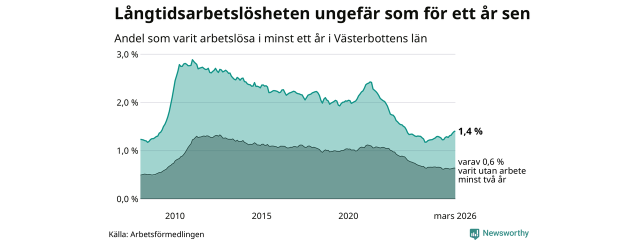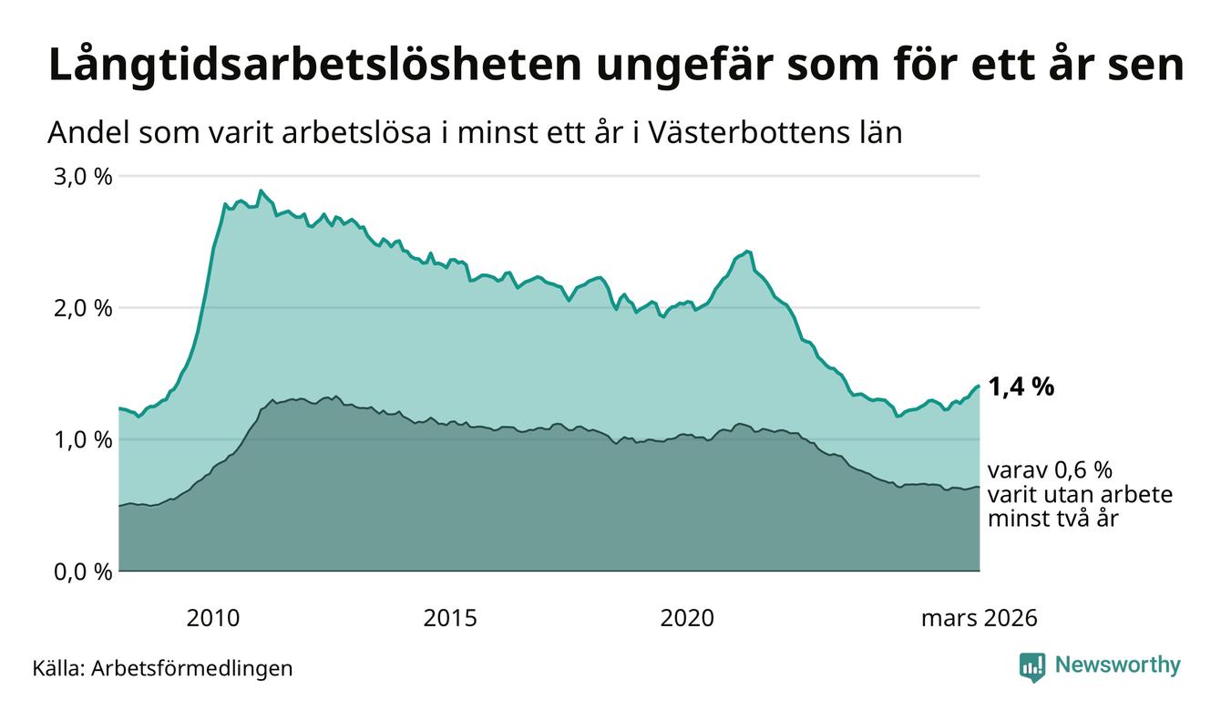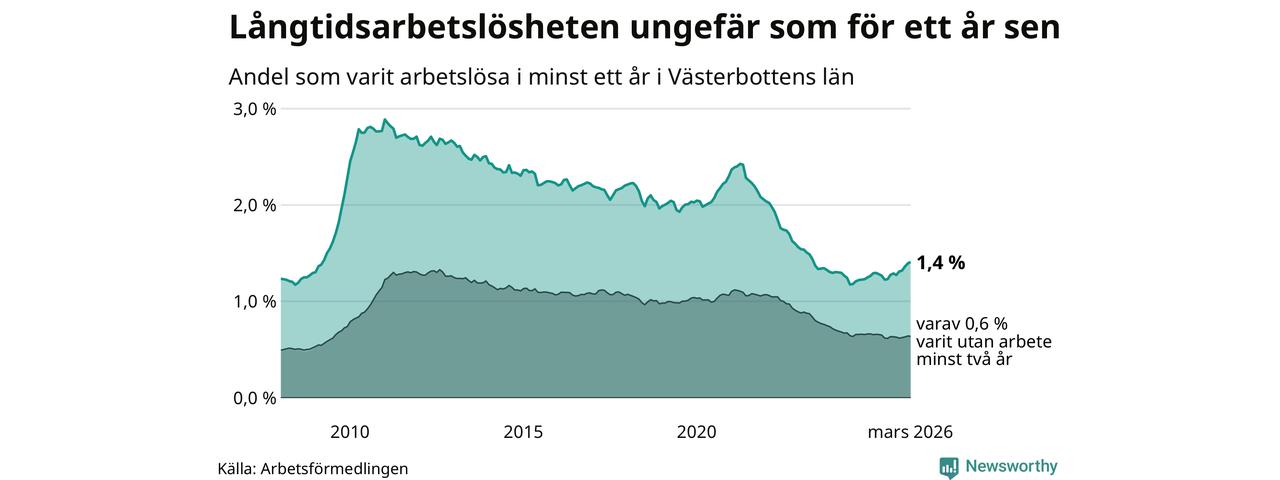 I mars hade 1 990 Västerbottensbor varit arbetslösa i minst ett år, vilket är 17 fler än månaden innan. Det är den femte månaden i rad med ökande antal långtidsarbetslösa. 1 990 personer motsvarar 1,4 procent av arbetskraften i länet – andelen långtidsarbetslösa är ungefär på samma nivå som för ett år sedan. Västerbottens län hade näst lägst andel långtidsarbetslösa i landet i mars.