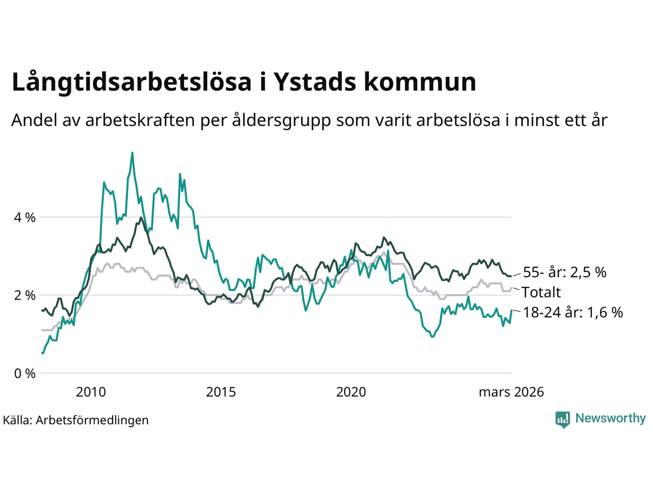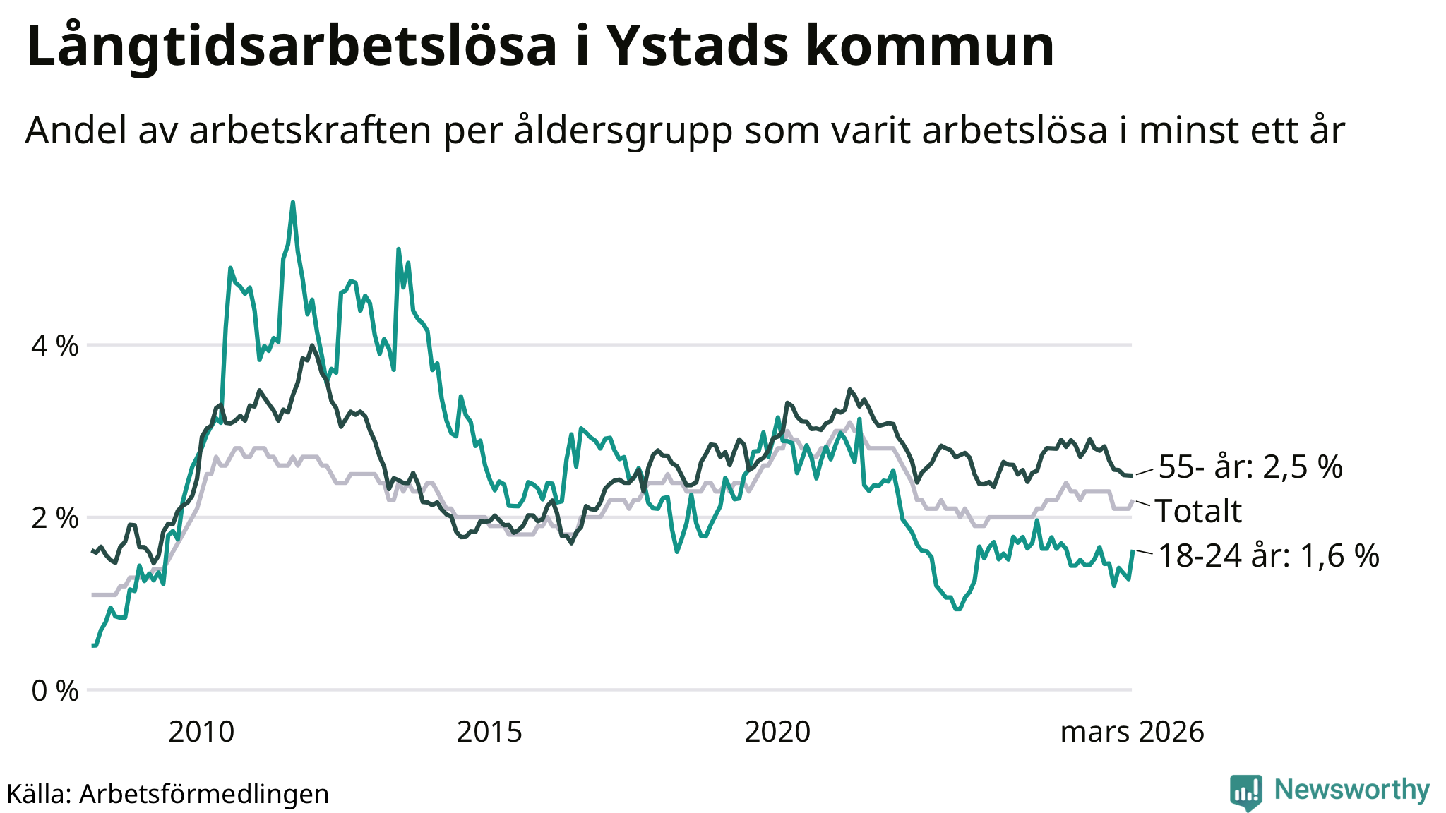 Graf: Andel arbetslösa uppdelat i åldersgrupper i Ystad