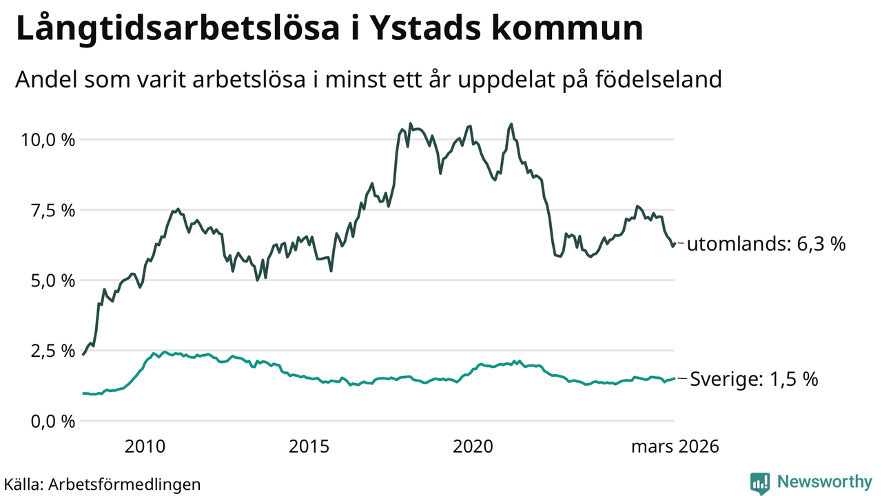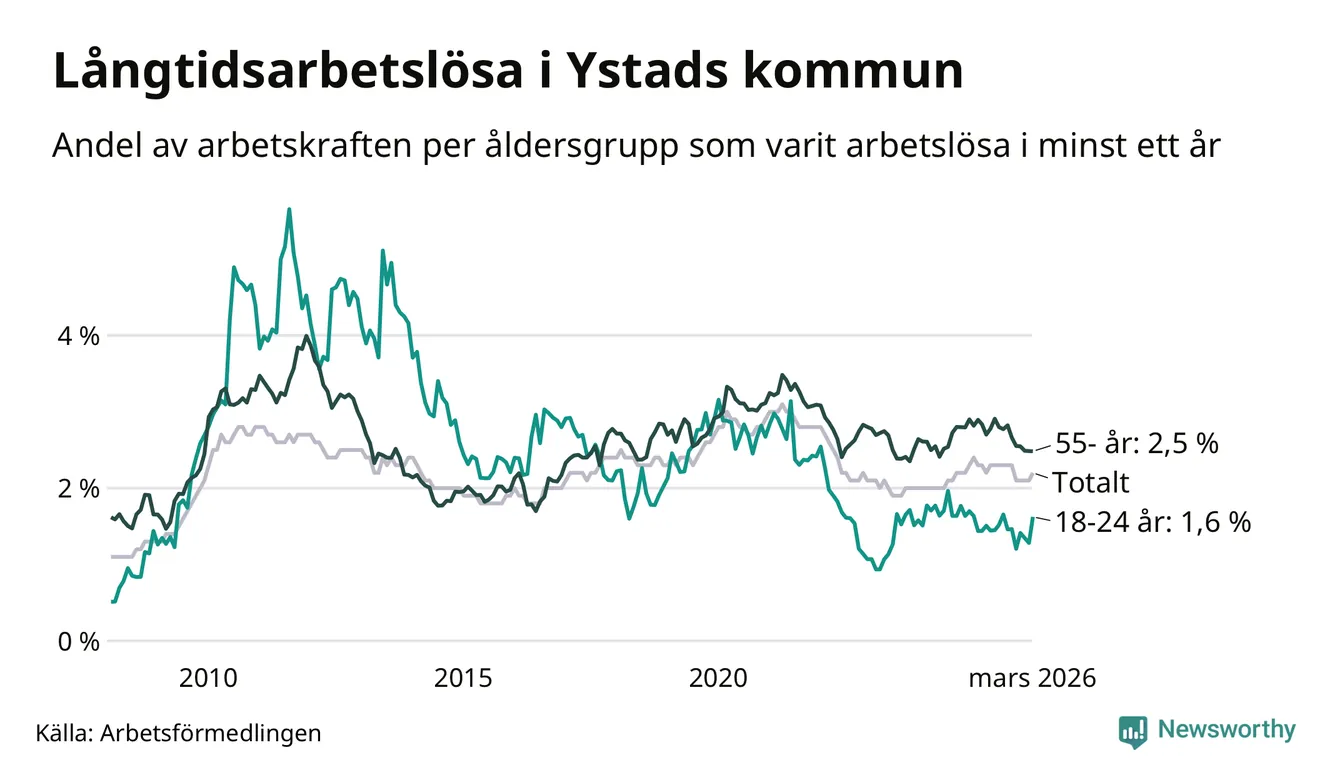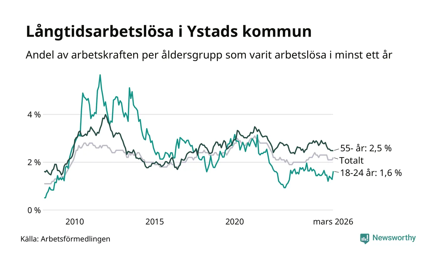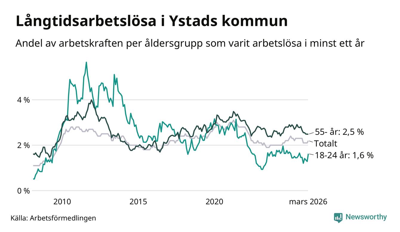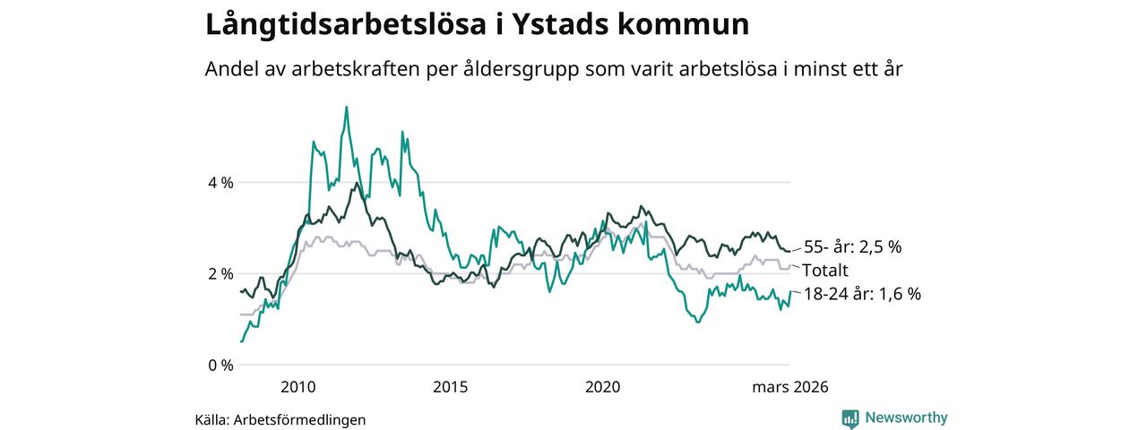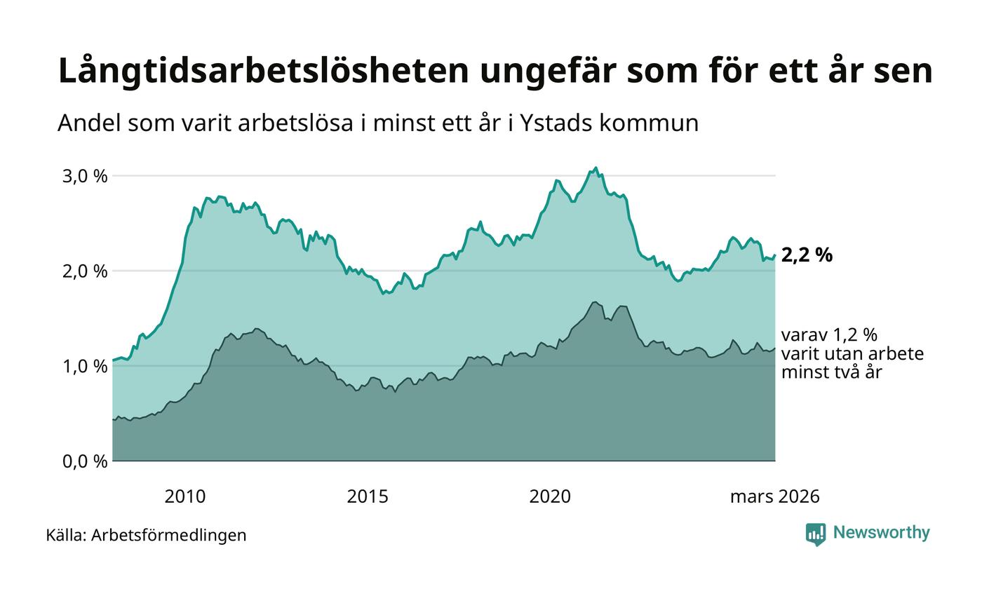 I mars hade 329 Ystadsbor varit arbetslösa i minst ett år, vilket är åtta fler än månaden innan. 329 personer motsvarar 2,2 procent av arbetskraften i kommunen – andelen långtidsarbetslösa är ungefär på samma nivå som för ett år sedan.