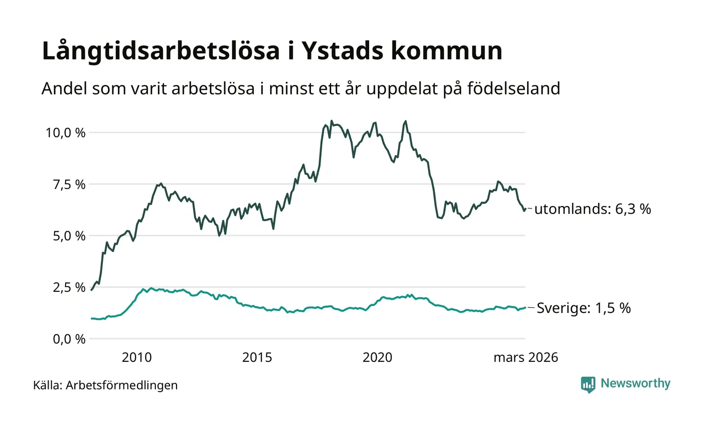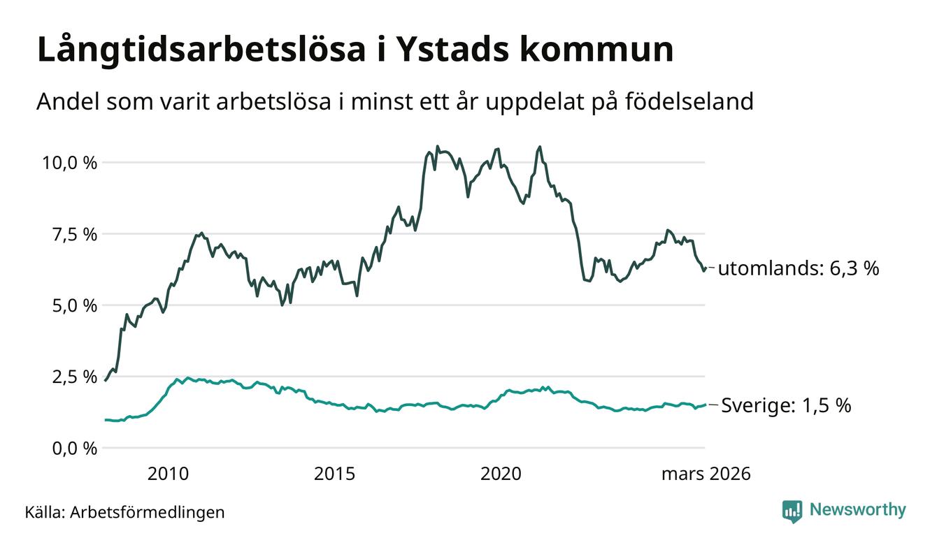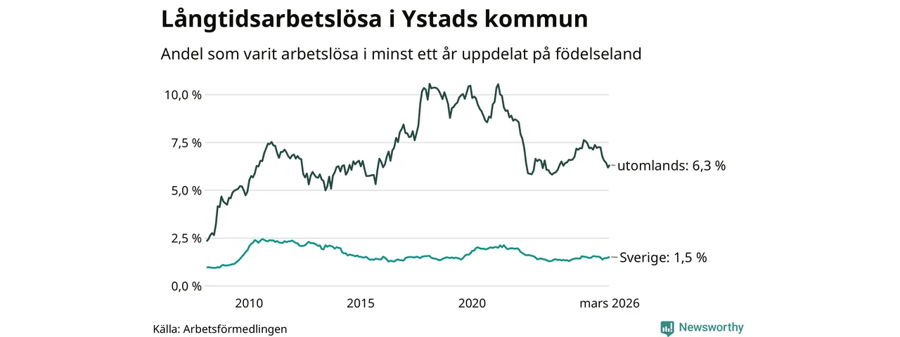 199 av de långtidsarbetslösa i Ystad är födda i Sverige, medan 130 är födda utomlands. Det innebär att långtidsarbetslösheten bland Sverigefödda är 1,5 procent, medan den är fyra gånger så hög – 6,3 procent – bland födda utomlands. Även i riket som helhet är arbetslösheten högre bland utrikesfödda.