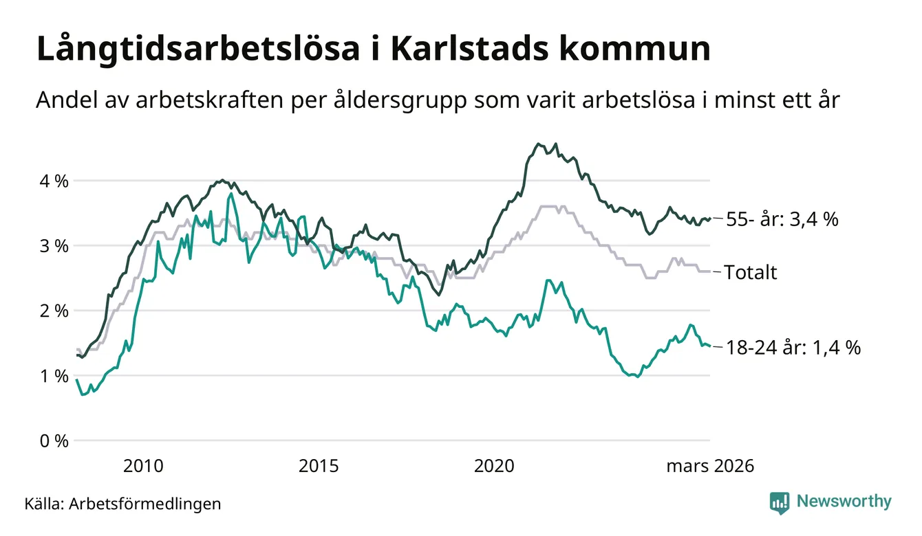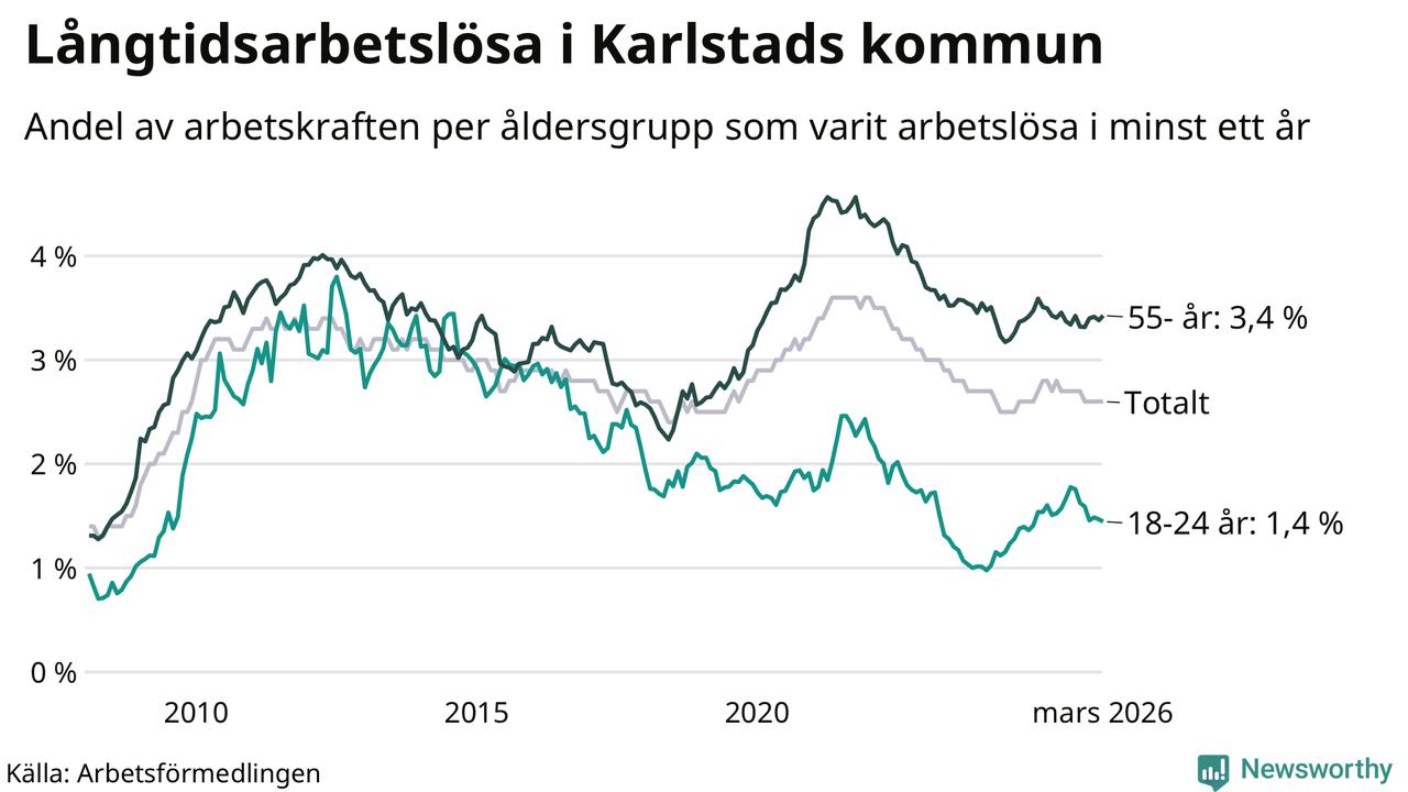 Av de 1 317 personerna som varit arbetslösa i mer än ett år i Karlstads kommun är 351 personer mellan 55 och 661 år och 92 är mellan 18 och 24 år. För den äldre gruppen är andelen arbetslösa 3,4 procent medan den i den yngre gruppen är 1,4 procent. Även i riket som helhet är långtidsarbetslösheten högre i gruppen äldre.