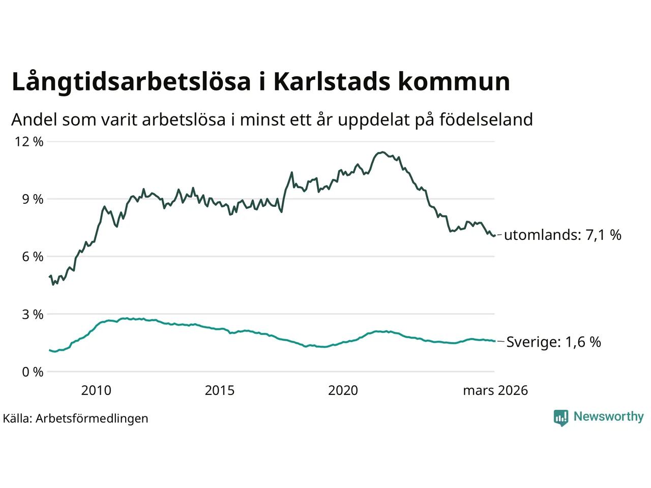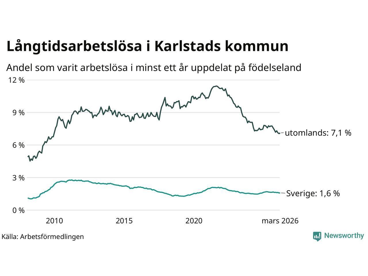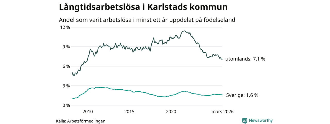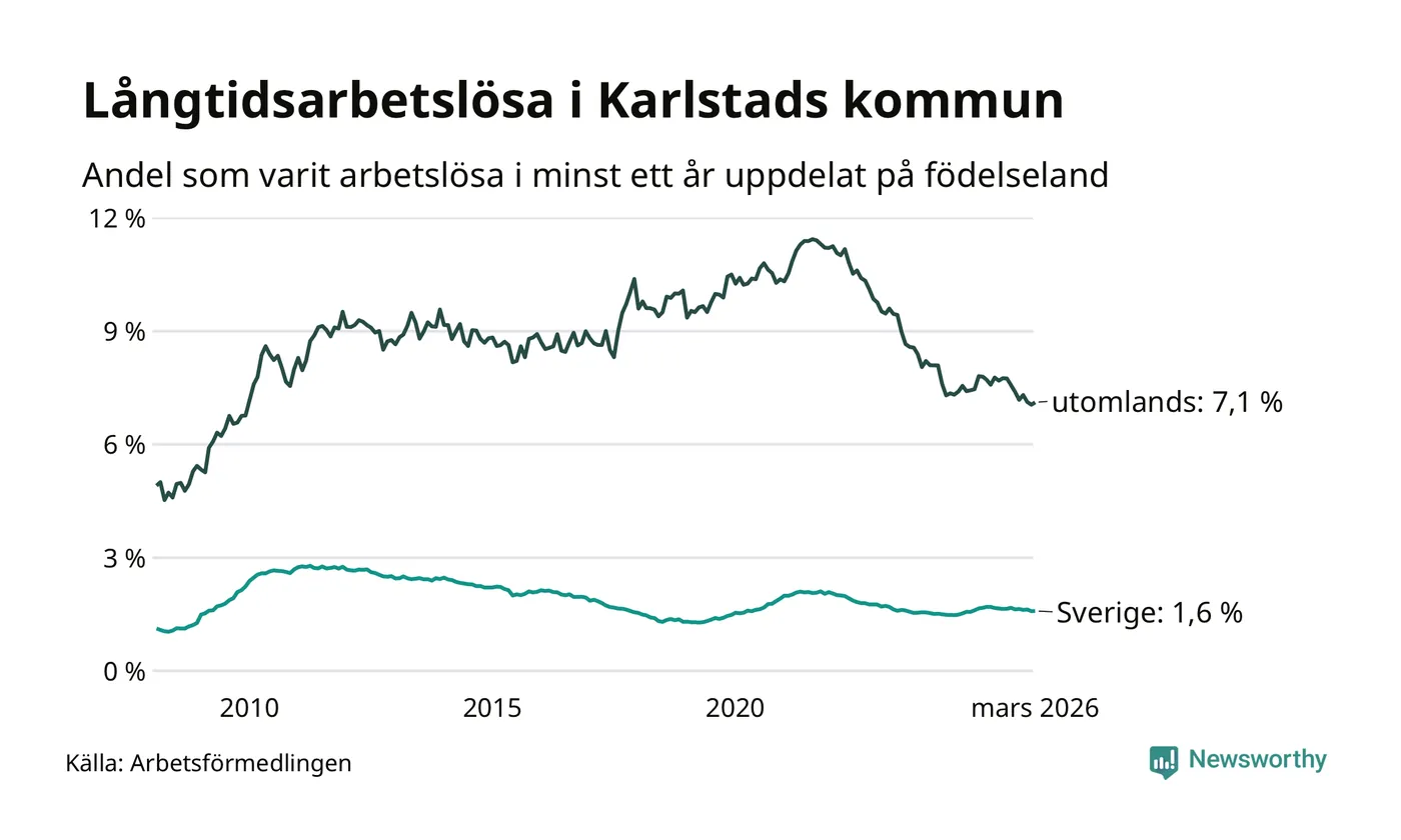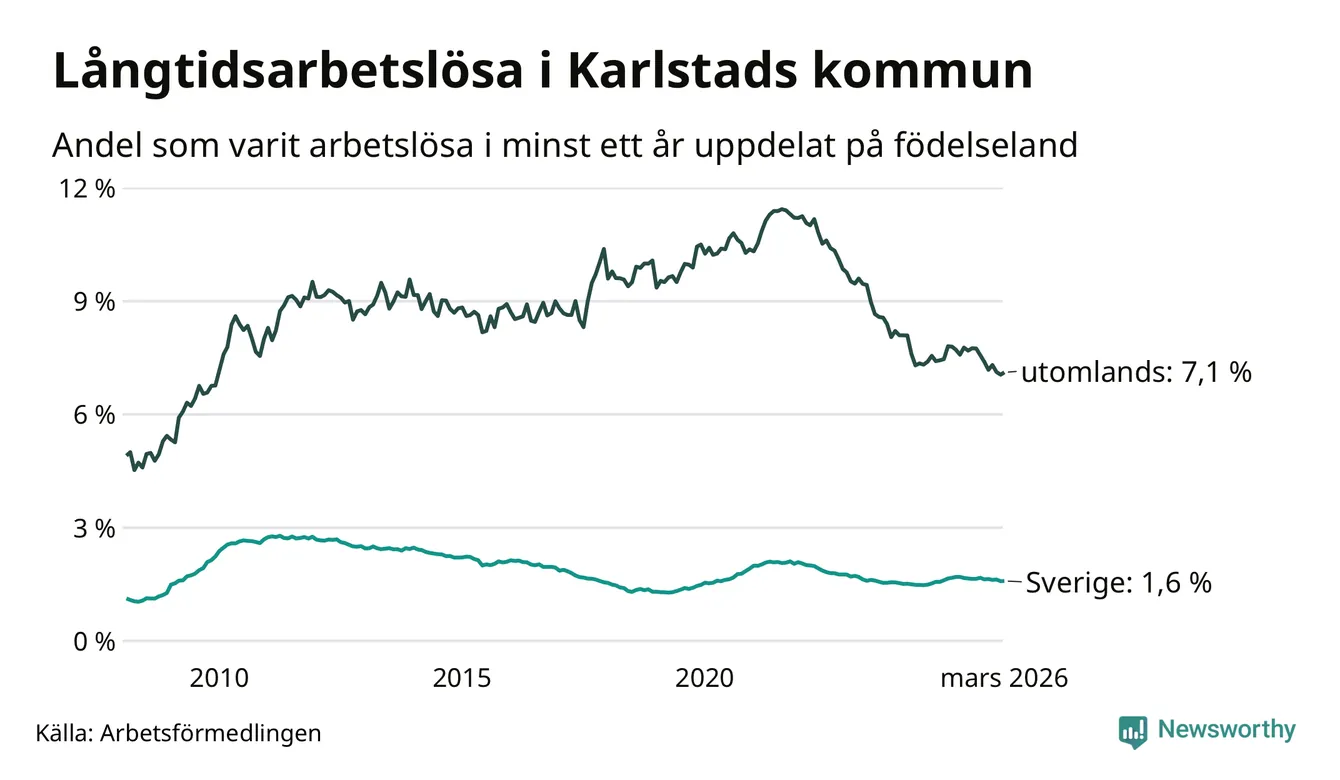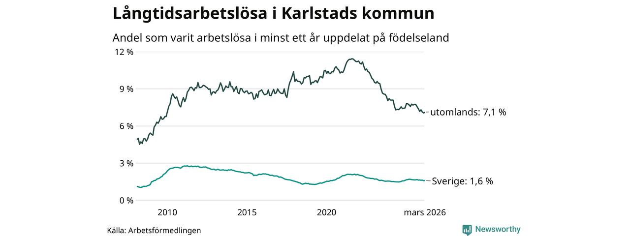 664 av de långtidsarbetslösa i Karlstad är födda i Sverige, medan 653 är födda utomlands. Det innebär att långtidsarbetslösheten bland Sverigefödda är 1,6 procent, medan den är fyra gånger så hög – 7,1 procent – bland födda utomlands. Även i riket som helhet är arbetslösheten högre bland utrikesfödda.