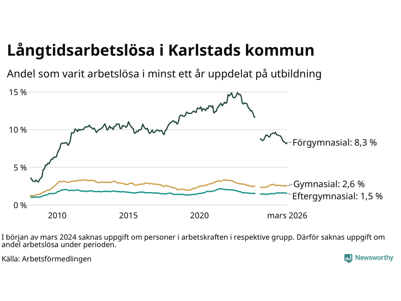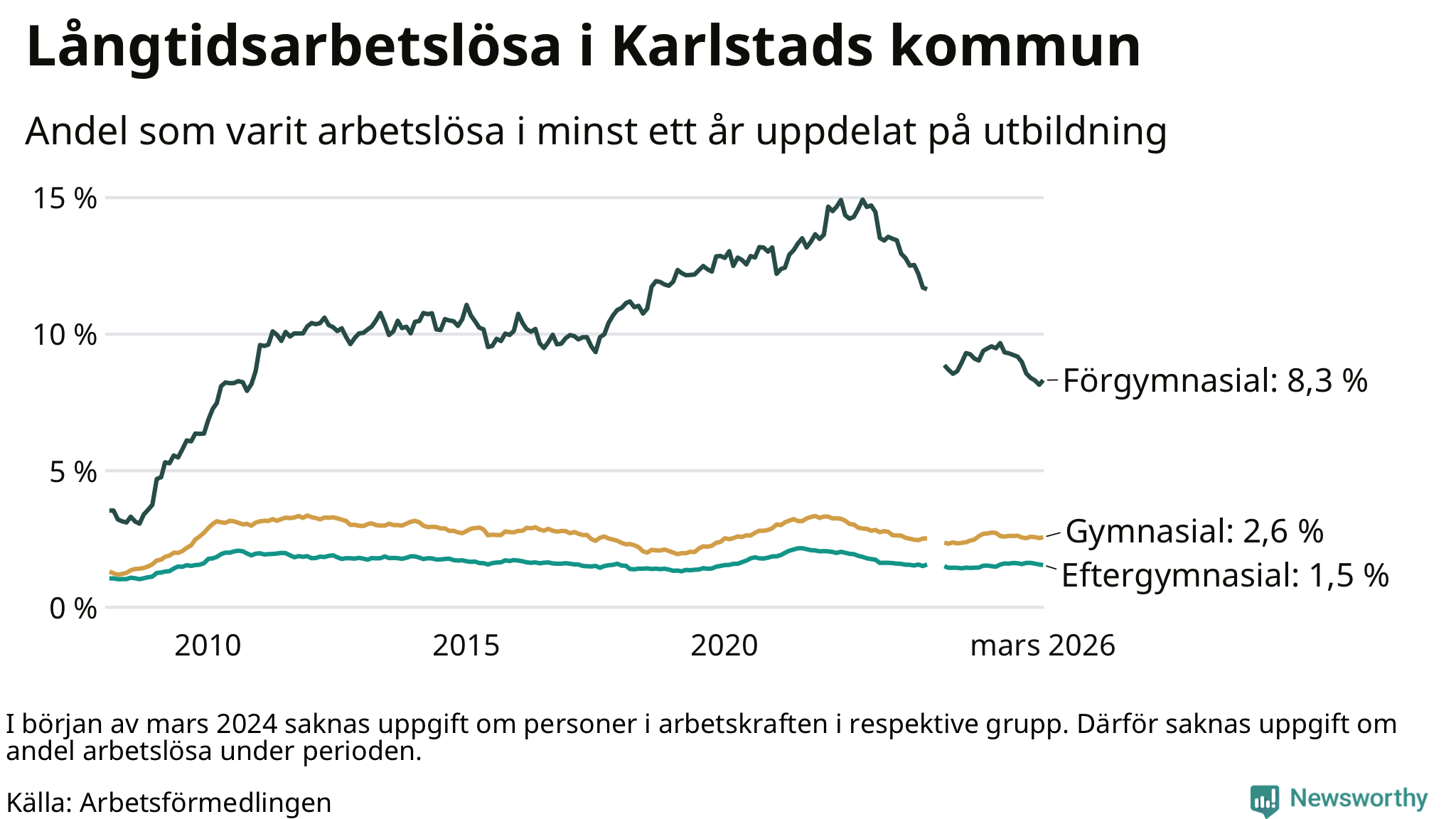 Graf över andel långtidsarbetslösa i Karlstad uppdelat på utbildningsnivå