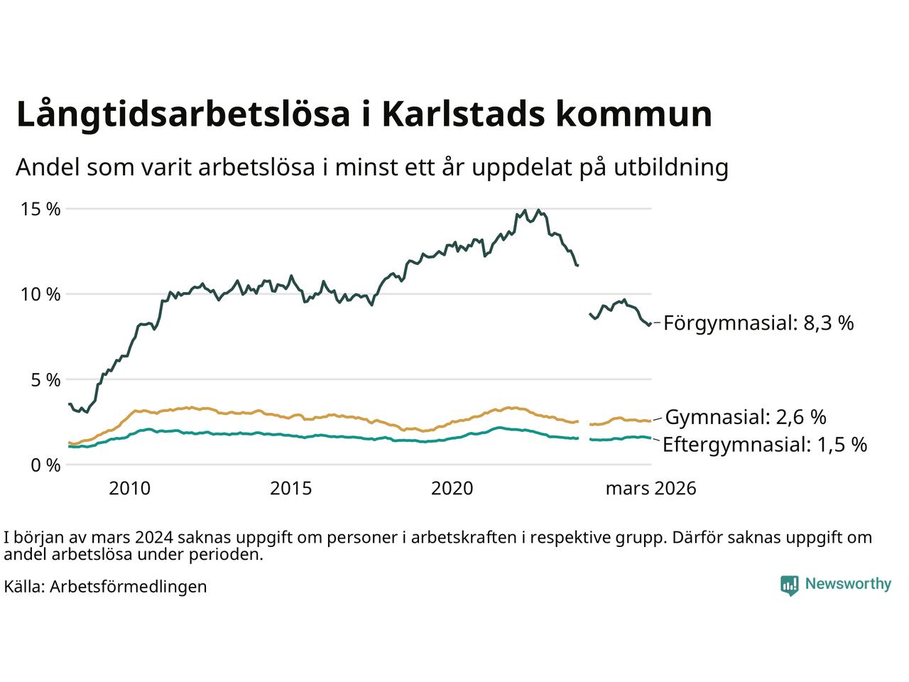 Graf: Andel arbetslösa i Karlstad som varit utan arbete i minst 12 månader