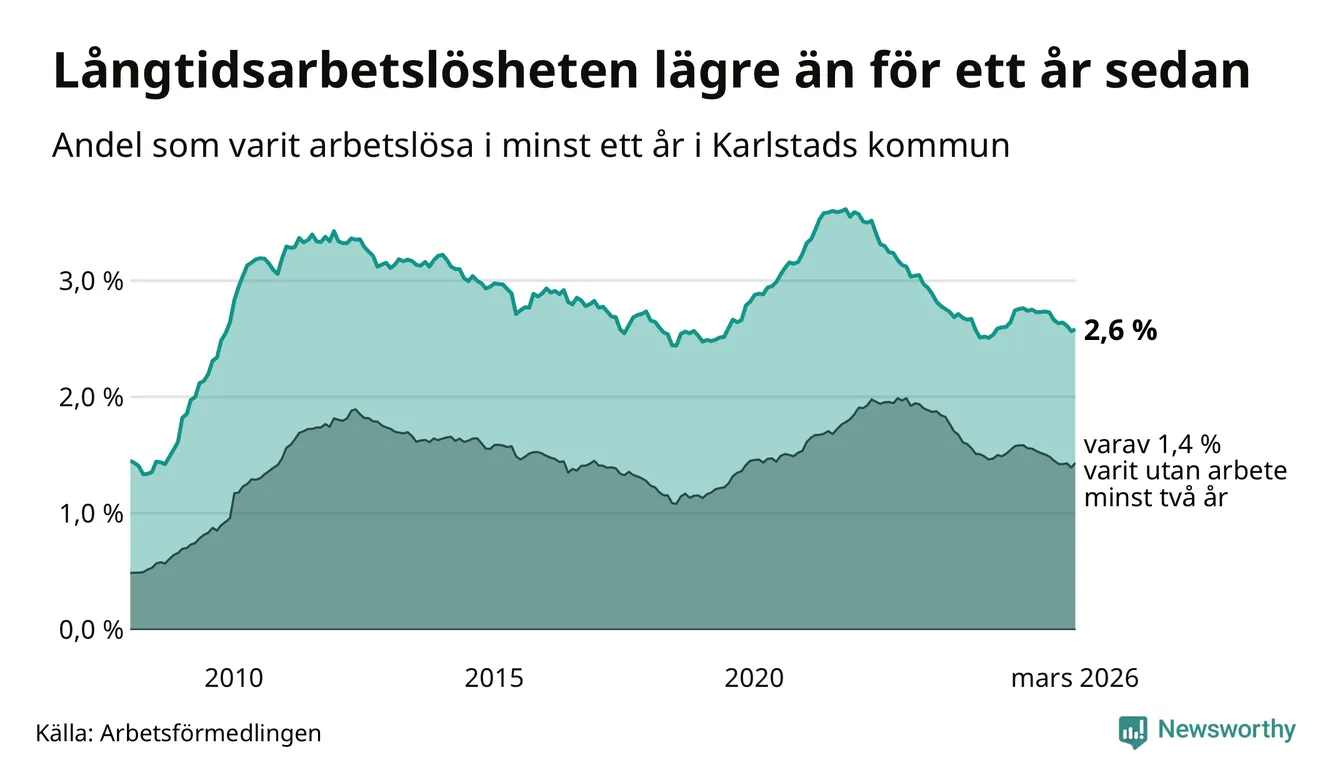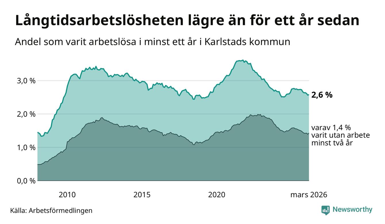 I mars hade 1 317 Karlstadsbor varit arbetslösa i minst ett år, vilket är tio fler än månaden innan. 1 317 personer motsvarar 2,6 procent av arbetskraften i kommunen – andelen långtidsarbetslösa är 0,2 procentenheter lägre än samma månad för ett år sedan.