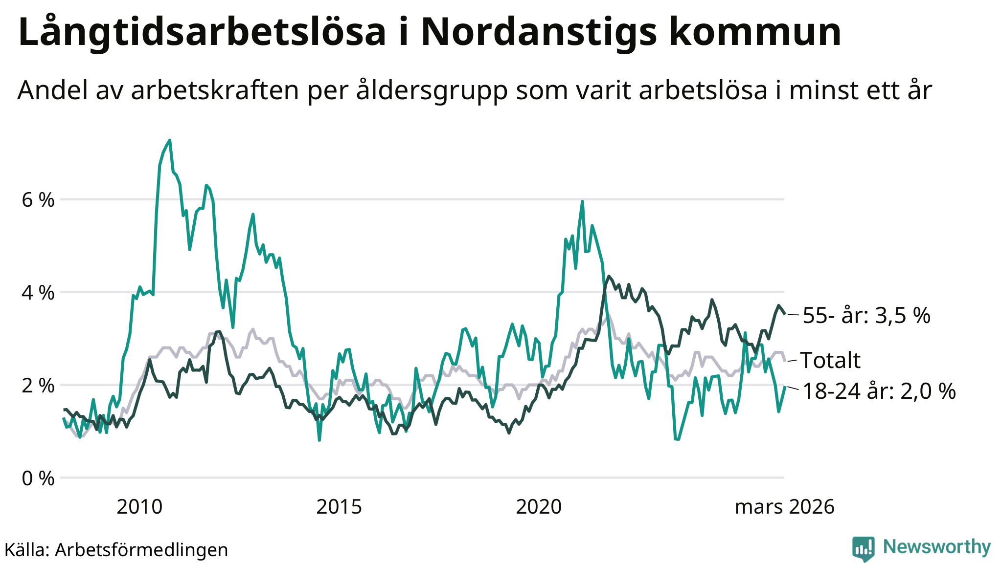 Graf: Andel arbetslösa uppdelat i åldersgrupper i Nordanstig