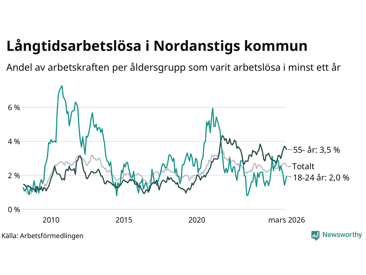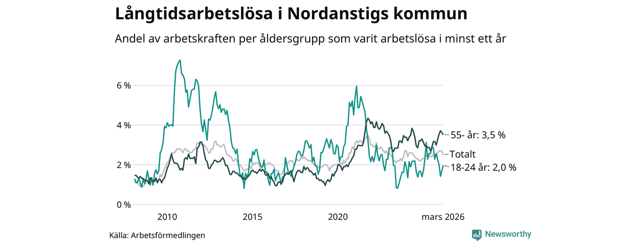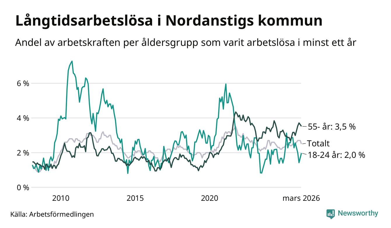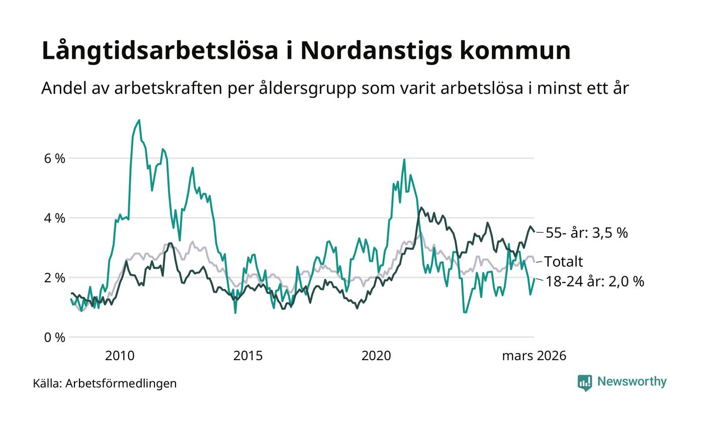Av de 105 personerna som varit arbetslösa i mer än ett år i Nordanstigs kommun är 39 personer mellan 55 och 661 år och sju är mellan 18 och 24 år. För den äldre gruppen är andelen arbetslösa 3,5 procent medan den i den yngre gruppen är 2,0 procent. Även i riket som helhet är långtidsarbetslösheten högre i gruppen äldre.