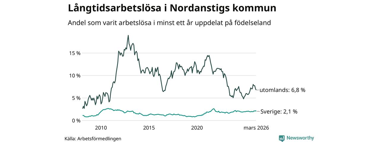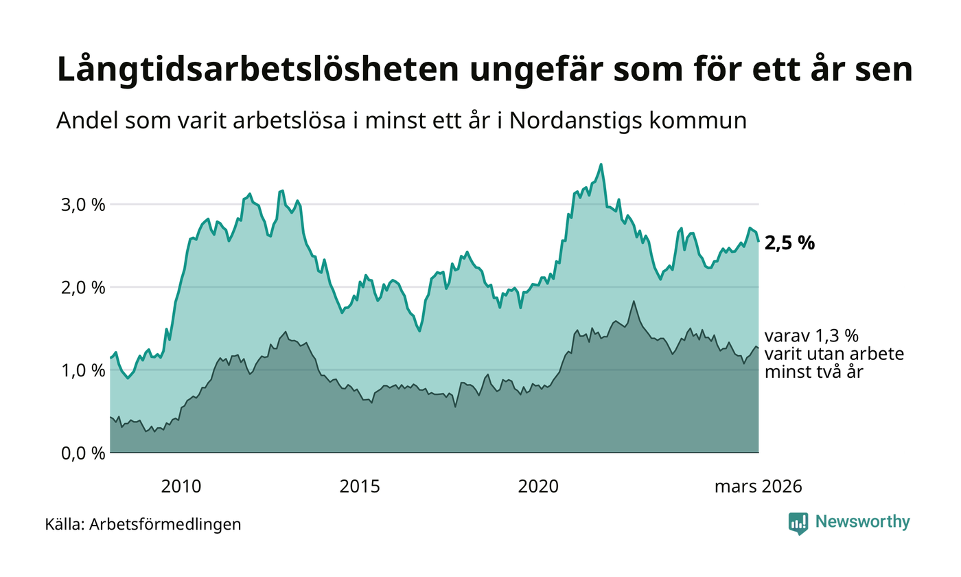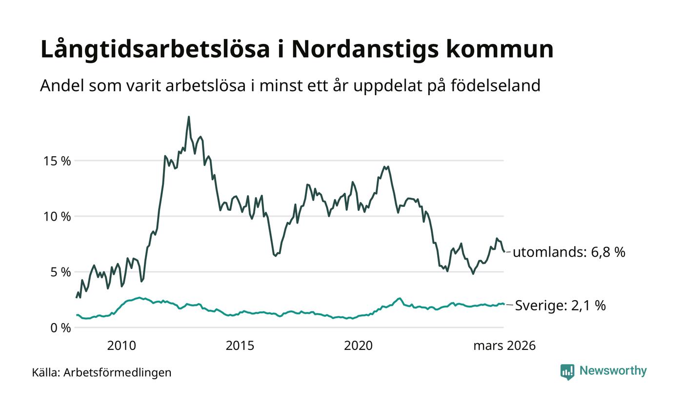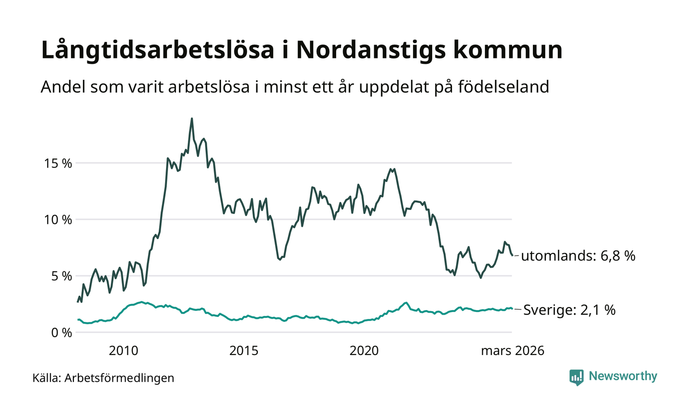 I mars hade 105 Nordanstigsbor varit arbetslösa i minst ett år, vilket är fem färre än månaden innan. 105 personer motsvarar 2,5 procent av arbetskraften i kommunen – andelen långtidsarbetslösa är ungefär på samma nivå som för ett år sedan.