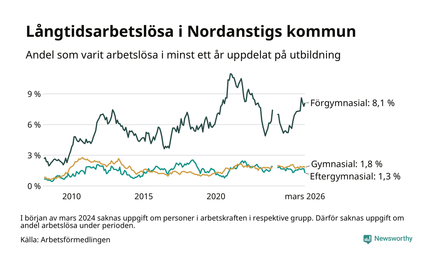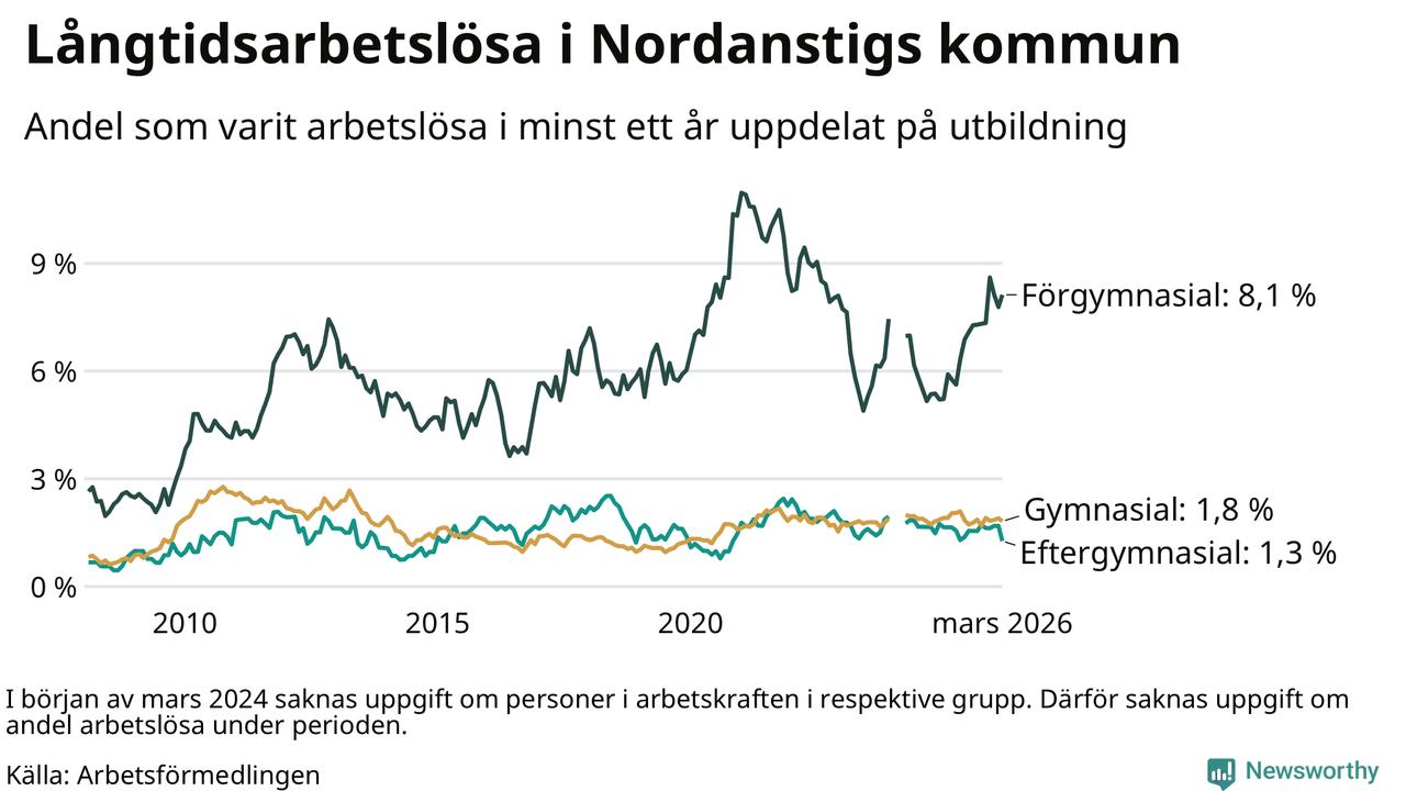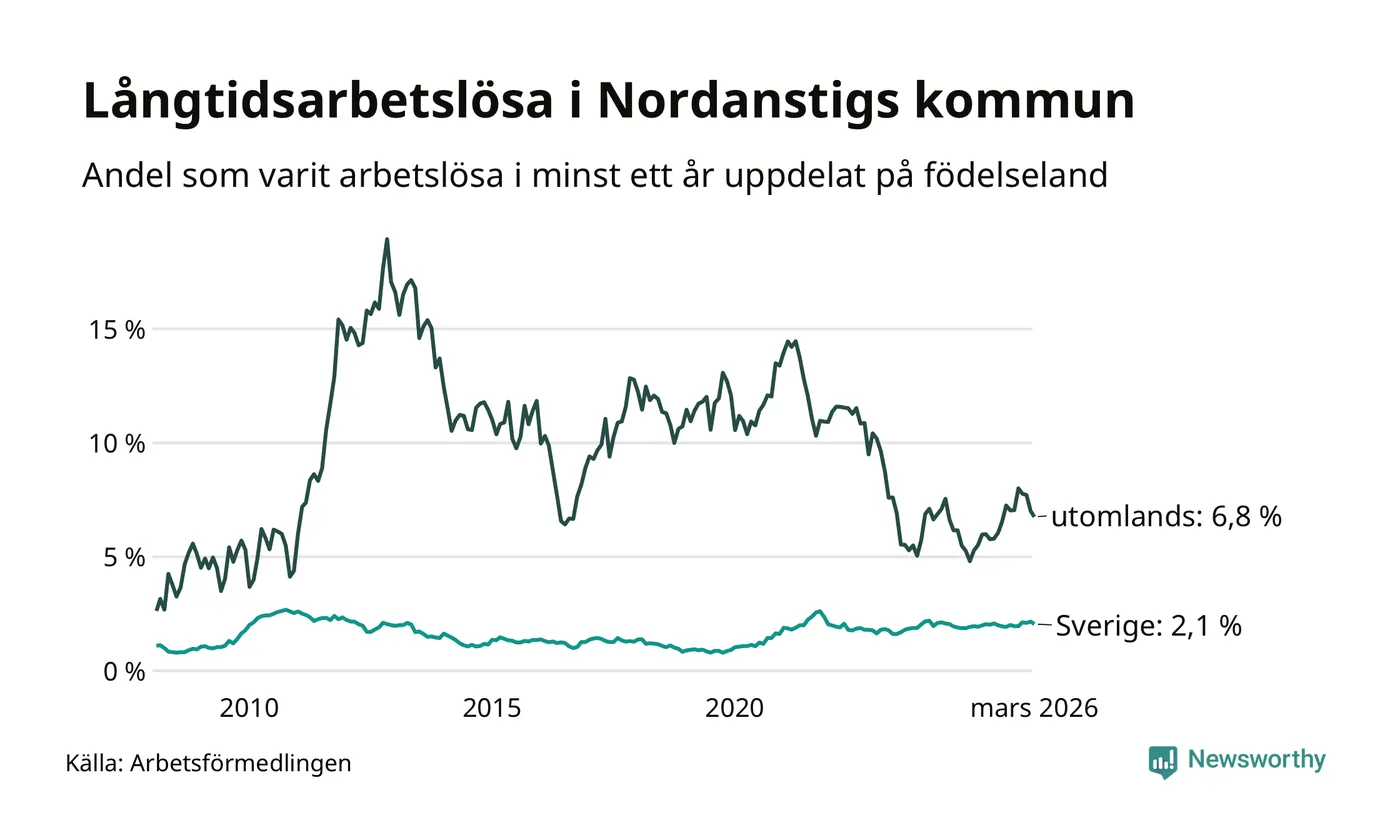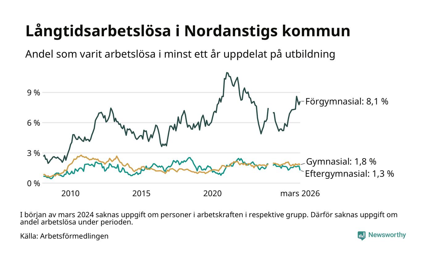I mars hade 105 Nordanstigsbor varit arbetslösa i minst ett år, vilket är fem färre än månaden innan. 105 personer motsvarar 2,5 procent av arbetskraften i kommunen – andelen långtidsarbetslösa är ungefär på samma nivå som för ett år sedan.