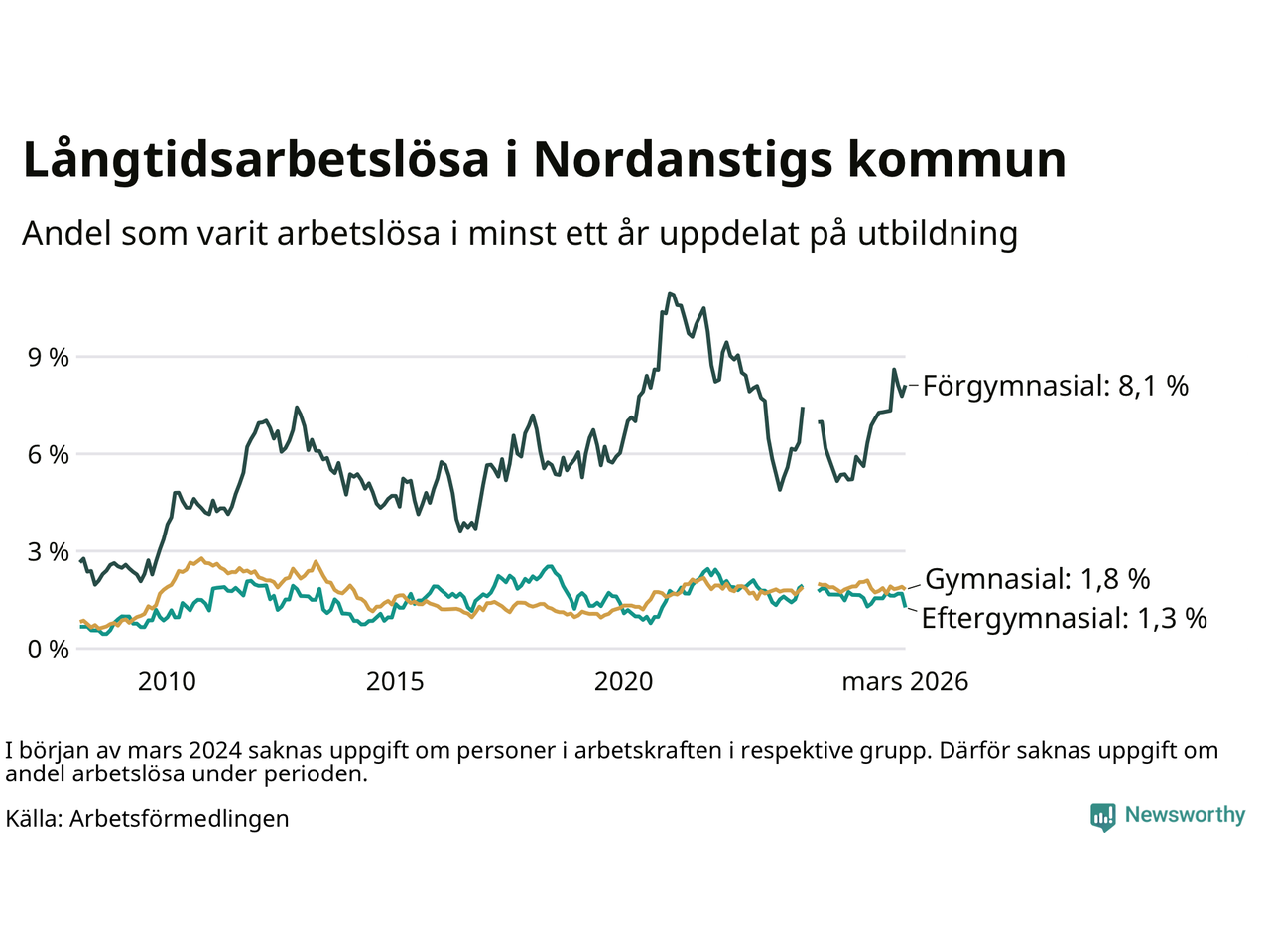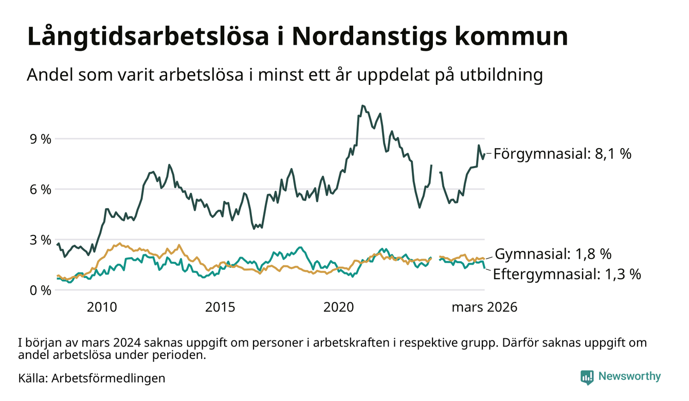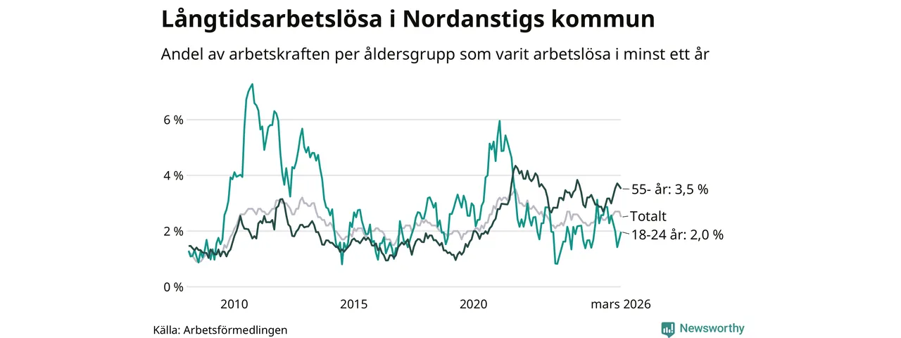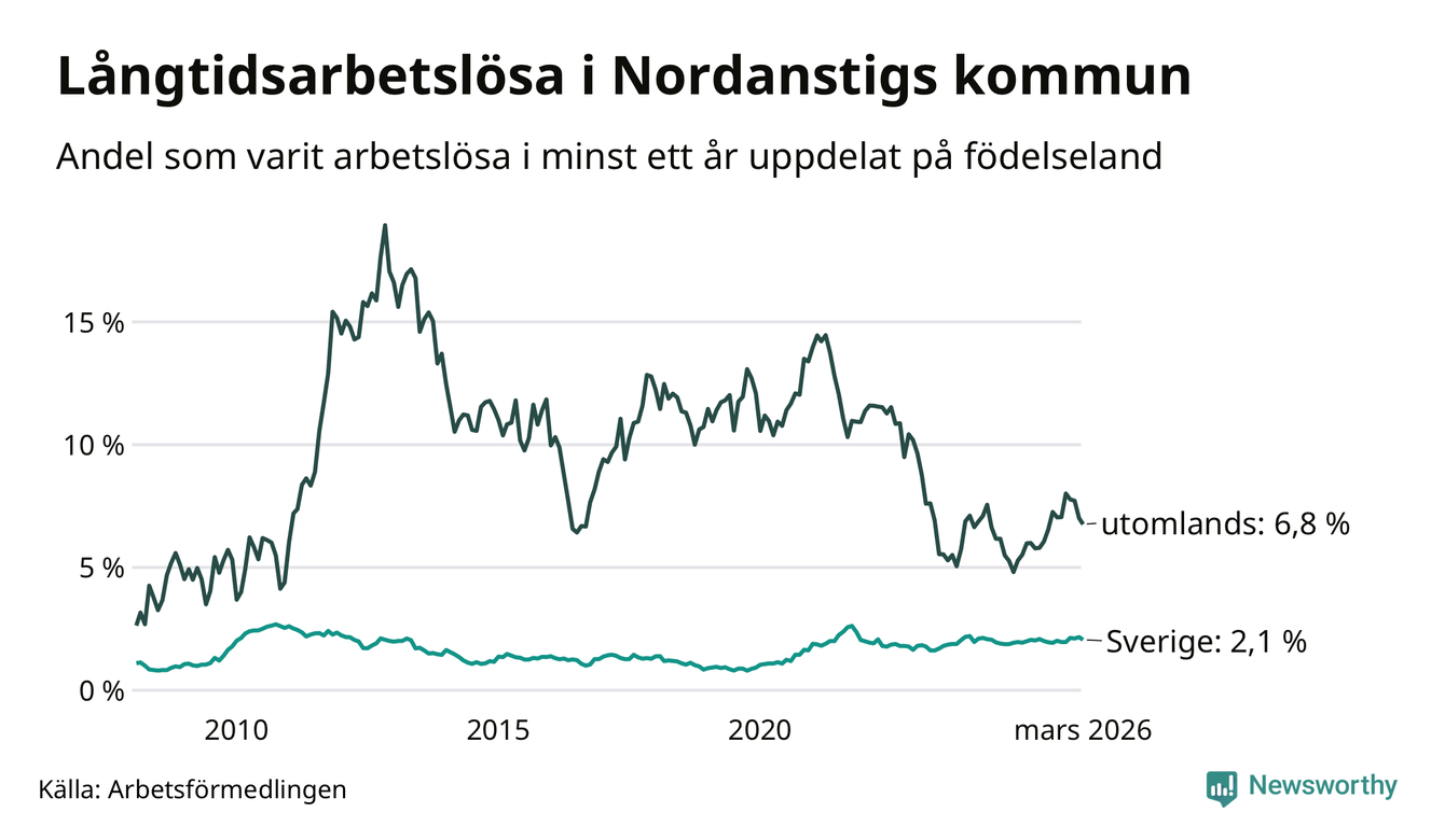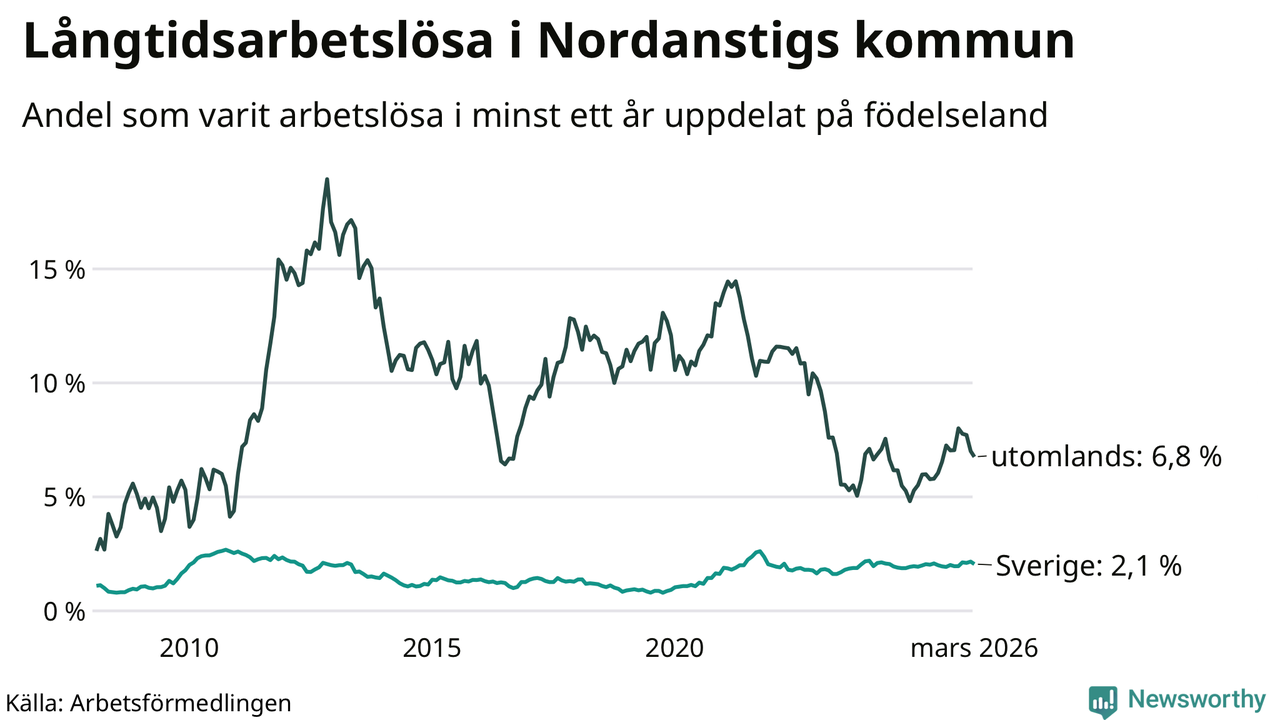 I mars hade 105 Nordanstigsbor varit arbetslösa i minst ett år, vilket är fem färre än månaden innan. 105 personer motsvarar 2,5 procent av arbetskraften i kommunen – andelen långtidsarbetslösa är ungefär på samma nivå som för ett år sedan.