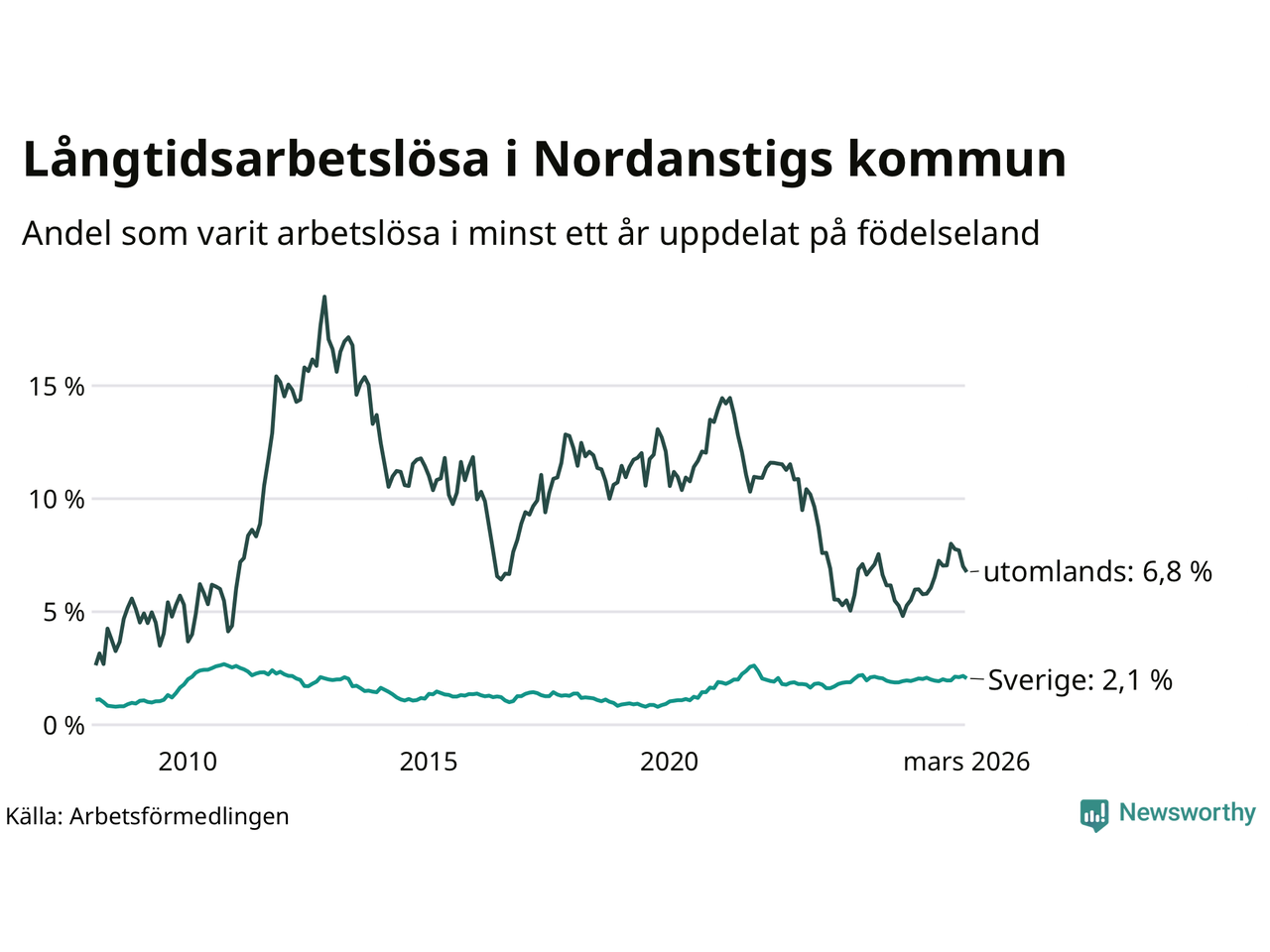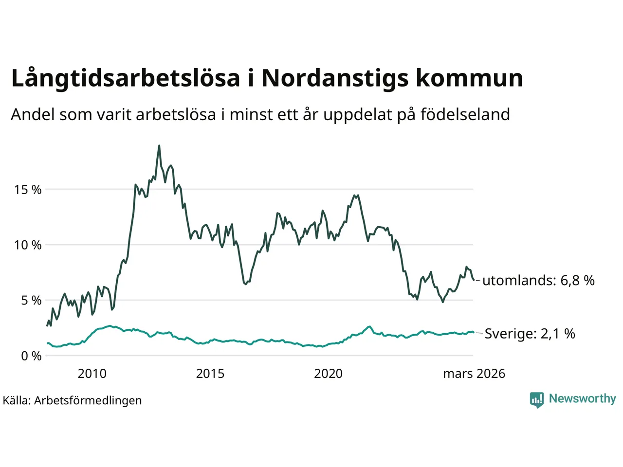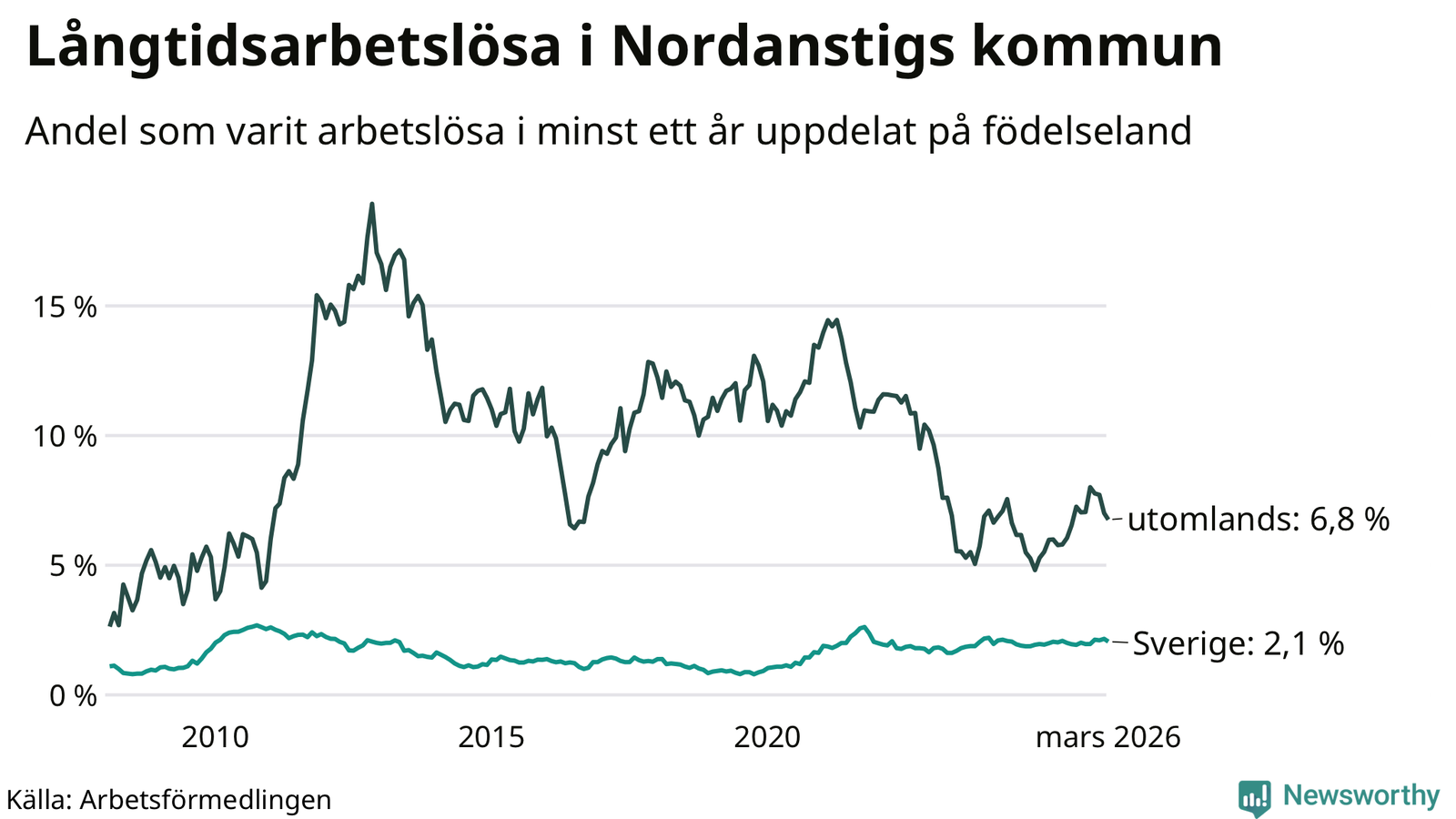 Graf: Andel arbetslösa uppdelat på födelseland i Nordanstig
