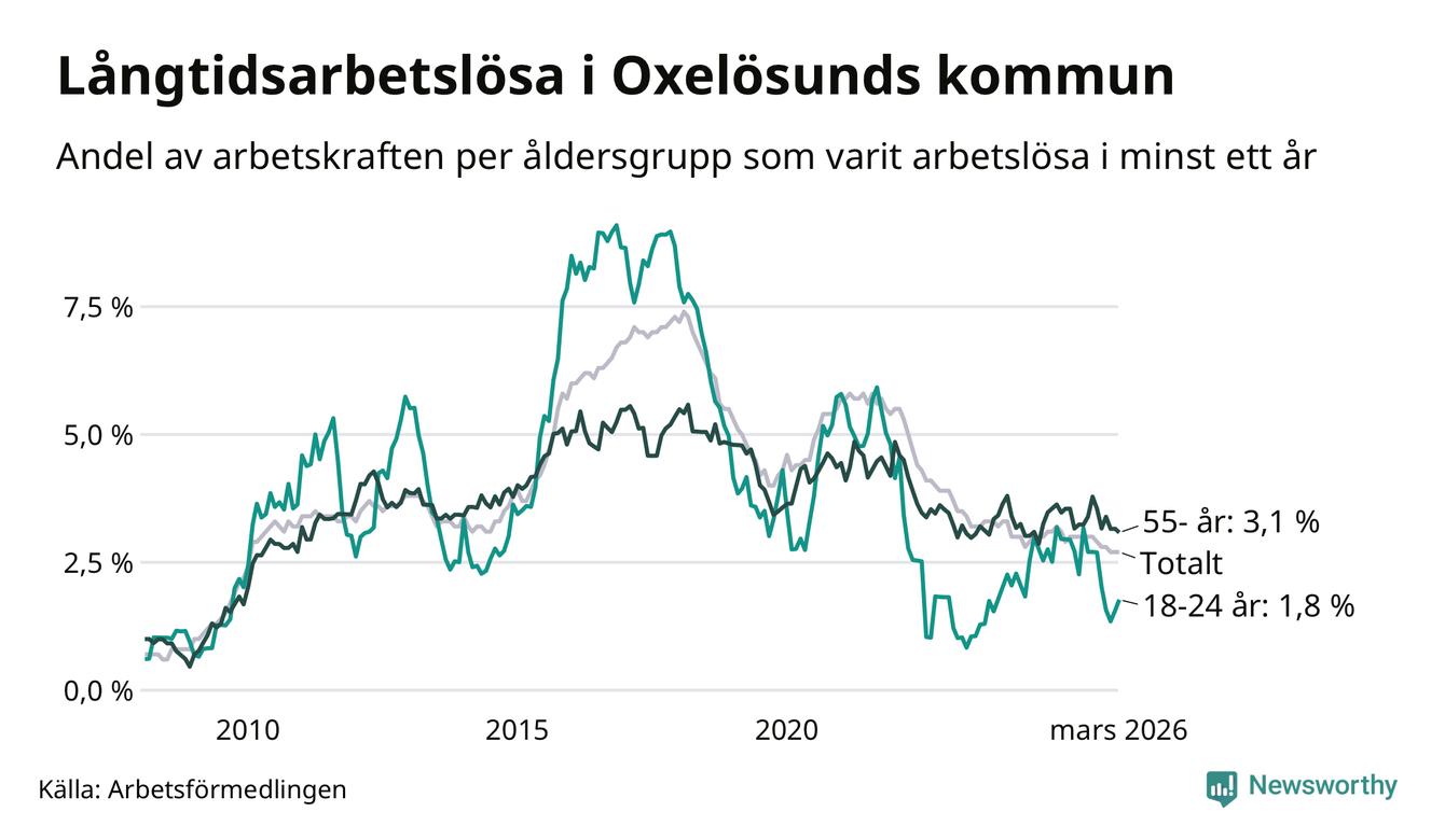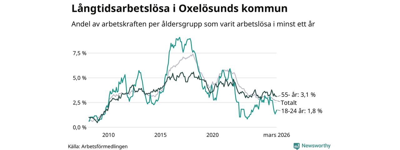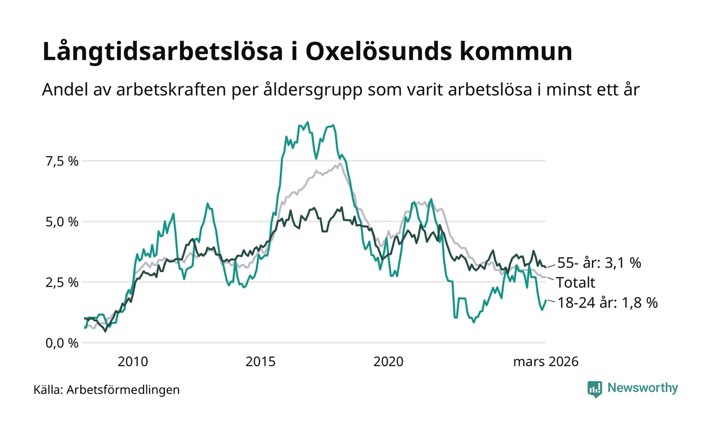 Av de 144 personerna som varit arbetslösa i mer än ett år i Oxelösunds kommun är 40 personer mellan 55 och 661 år och åtta är mellan 18 och 24 år. För den äldre gruppen är andelen arbetslösa 3,1 procent medan den i den yngre gruppen är 1,8 procent. Även i riket som helhet är långtidsarbetslösheten högre i gruppen äldre.