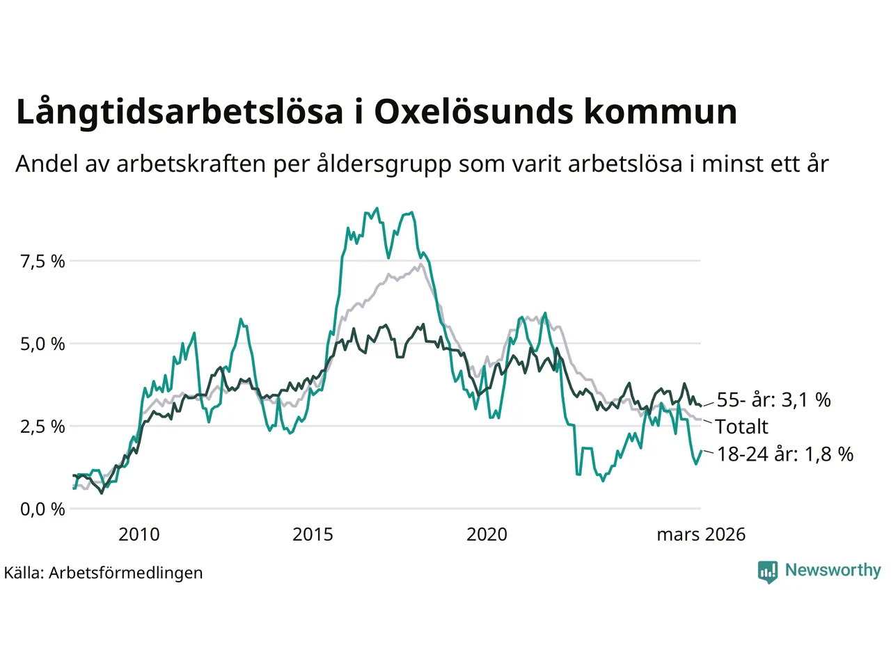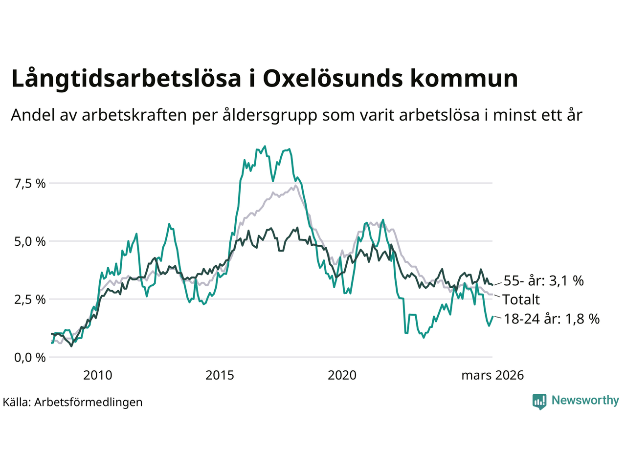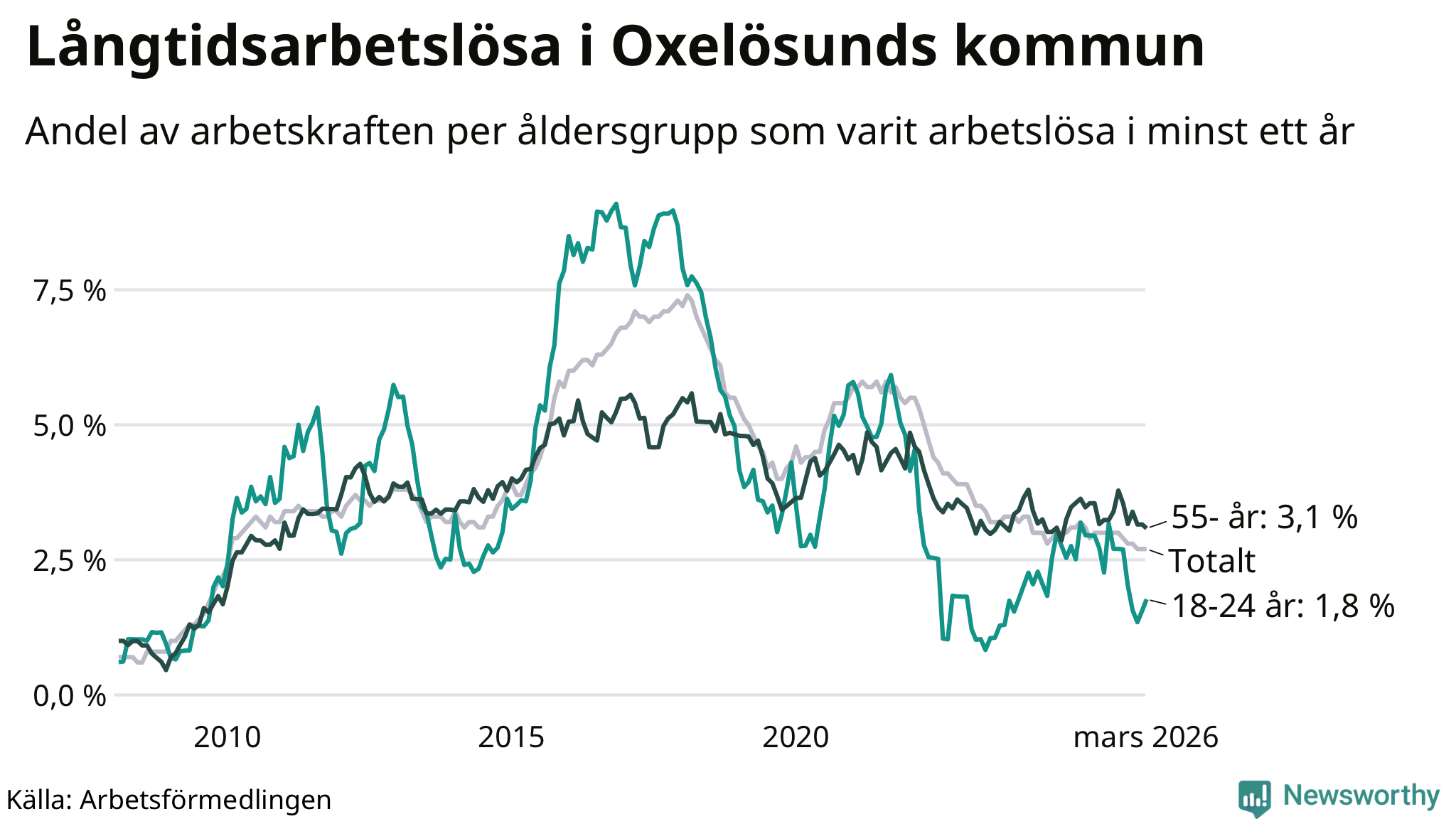 Av de 144 personerna som varit arbetslösa i mer än ett år i Oxelösunds kommun är 40 personer mellan 55 och 661 år och åtta är mellan 18 och 24 år. För den äldre gruppen är andelen arbetslösa 3,1 procent medan den i den yngre gruppen är 1,8 procent. Även i riket som helhet är långtidsarbetslösheten högre i gruppen äldre.
