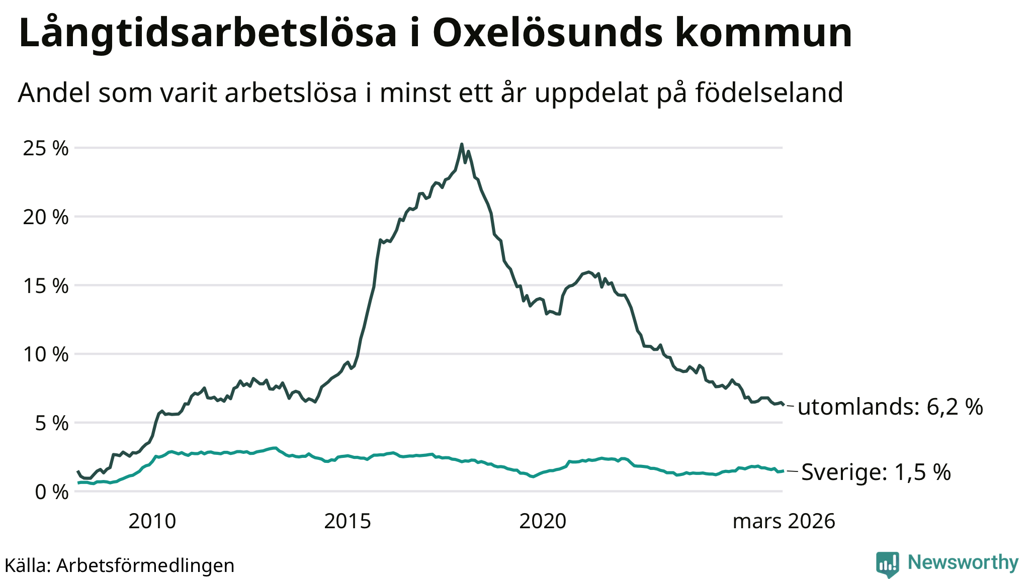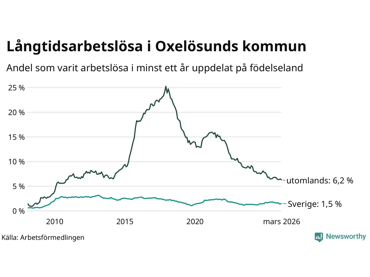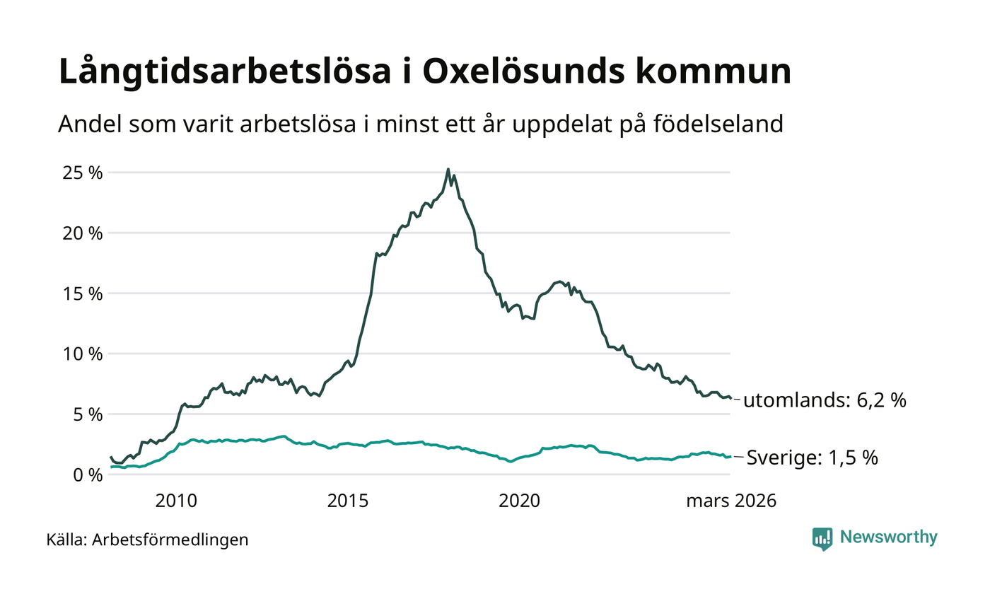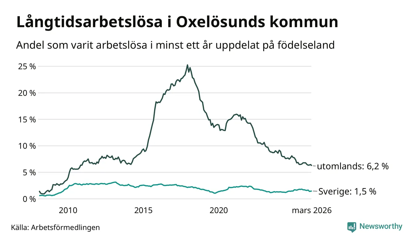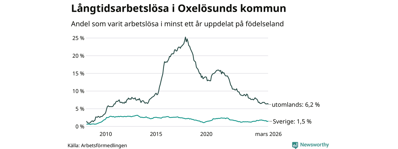 60 av de långtidsarbetslösa i Oxelösund är födda i Sverige, medan 84 är födda utomlands. Det innebär att långtidsarbetslösheten bland Sverigefödda är 1,5 procent, medan den är fyra gånger så hög – 6,2 procent – bland födda utomlands. Även i riket som helhet är arbetslösheten högre bland utrikesfödda.