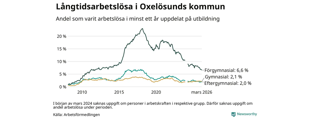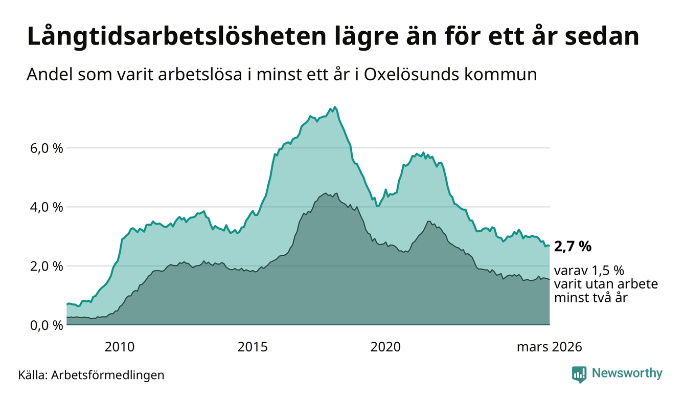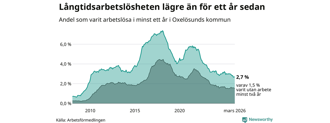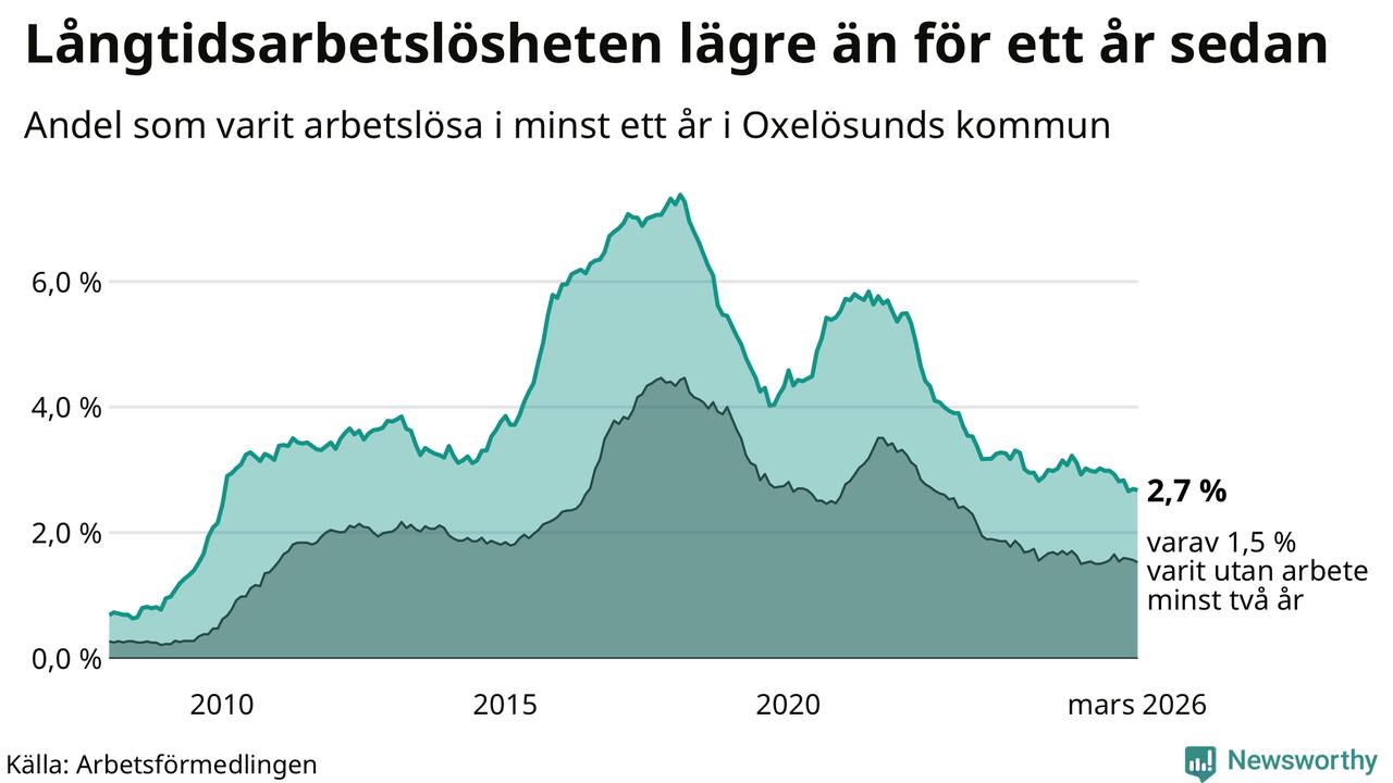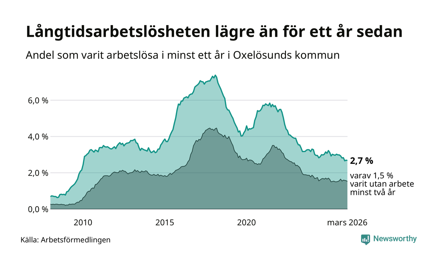 I mars hade 144 Oxelösundsbor varit arbetslösa i minst ett år, vilket är en färre än månaden innan. 144 personer motsvarar 2,7 procent av arbetskraften i kommunen – andelen långtidsarbetslösa är 0,2 procentenheter lägre än samma månad för ett år sedan.