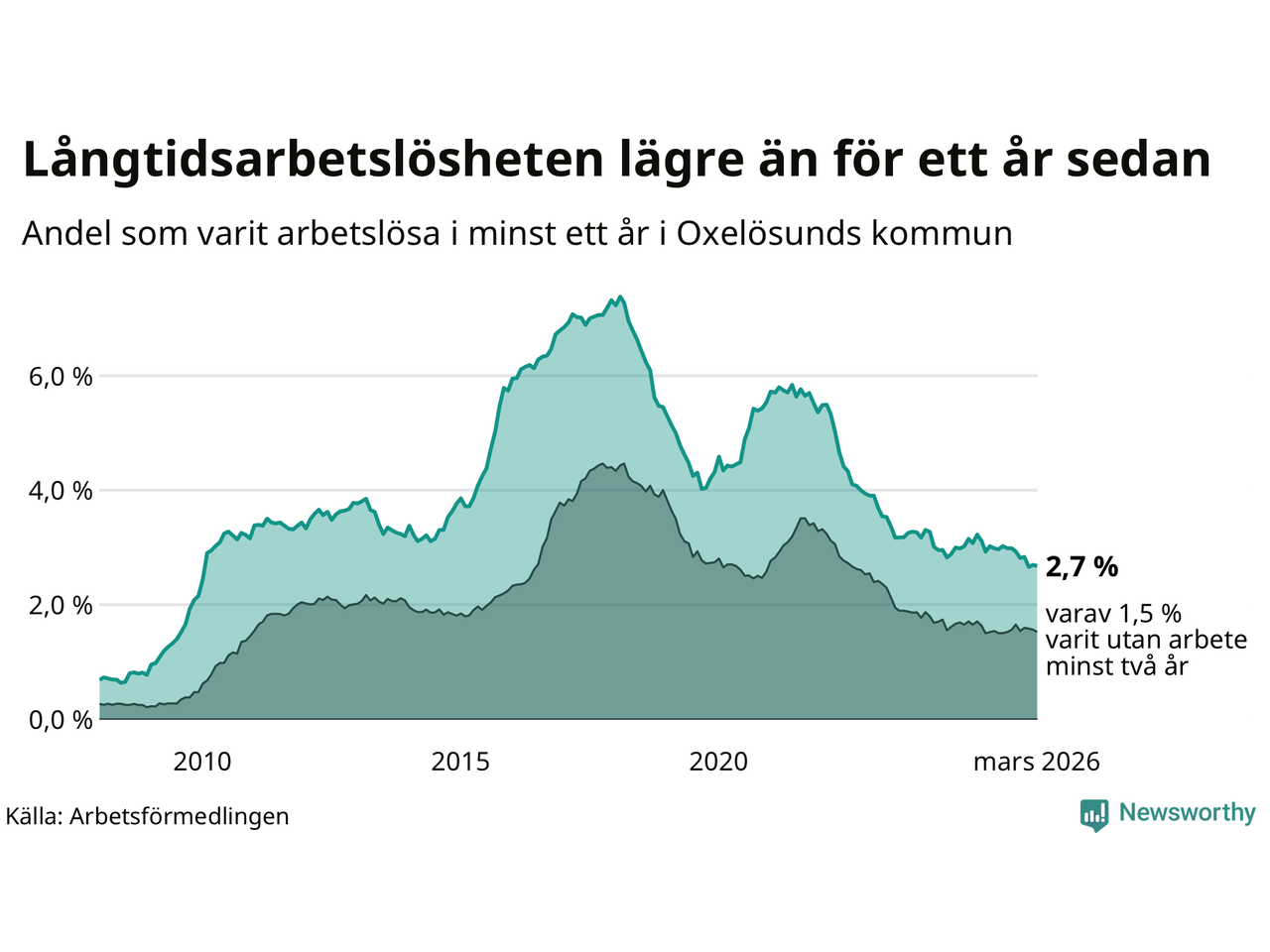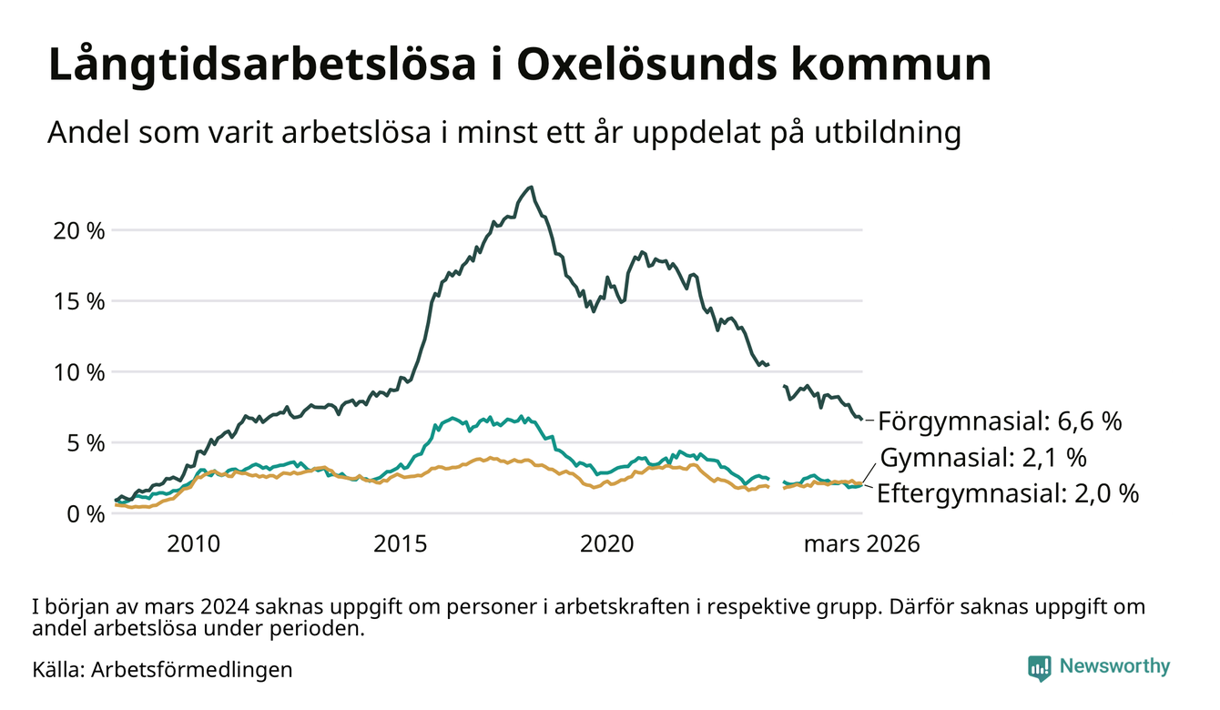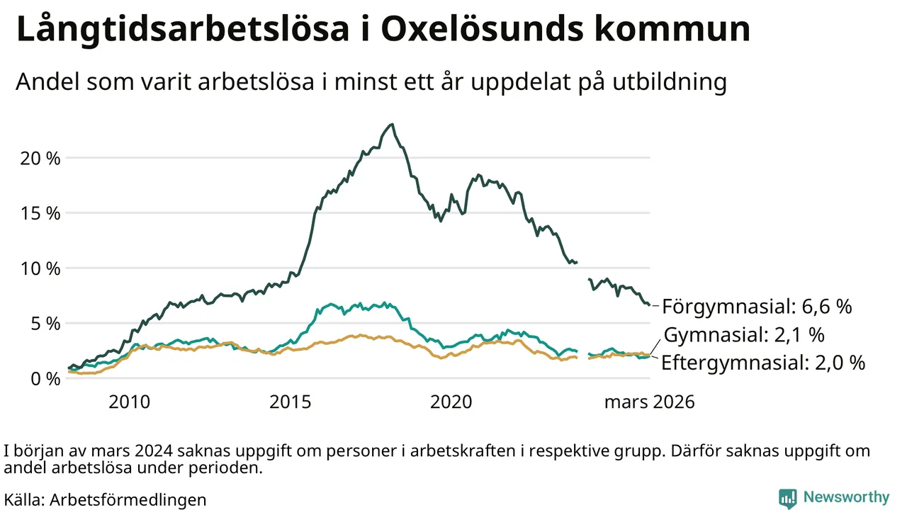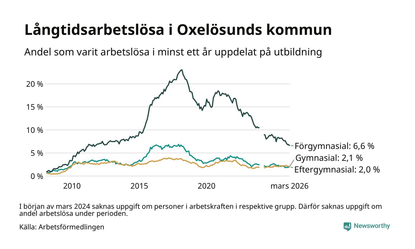 I mars hade 144 Oxelösundsbor varit arbetslösa i minst ett år, vilket är en färre än månaden innan. 144 personer motsvarar 2,7 procent av arbetskraften i kommunen – andelen långtidsarbetslösa är 0,2 procentenheter lägre än samma månad för ett år sedan.