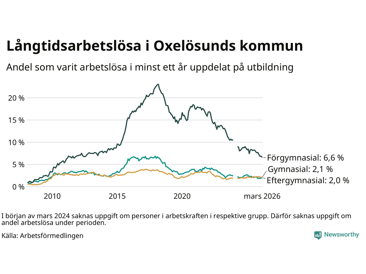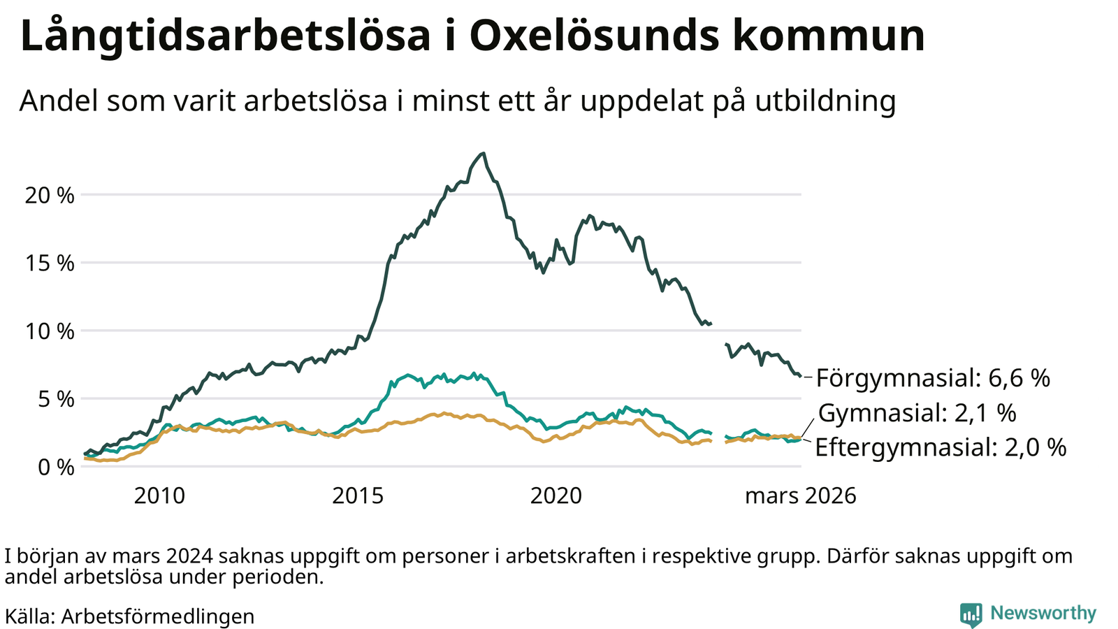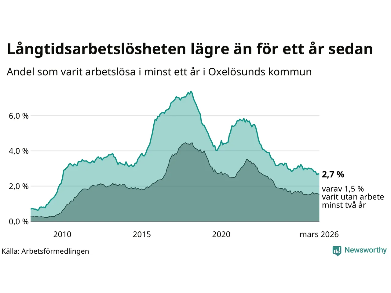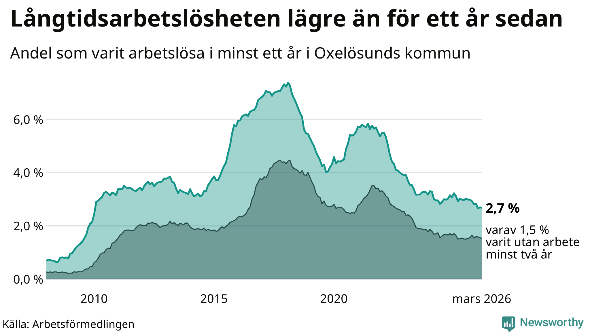 I mars hade 144 Oxelösundsbor varit arbetslösa i minst ett år, vilket är en färre än månaden innan. 144 personer motsvarar 2,7 procent av arbetskraften i kommunen – andelen långtidsarbetslösa är 0,2 procentenheter lägre än samma månad för ett år sedan.