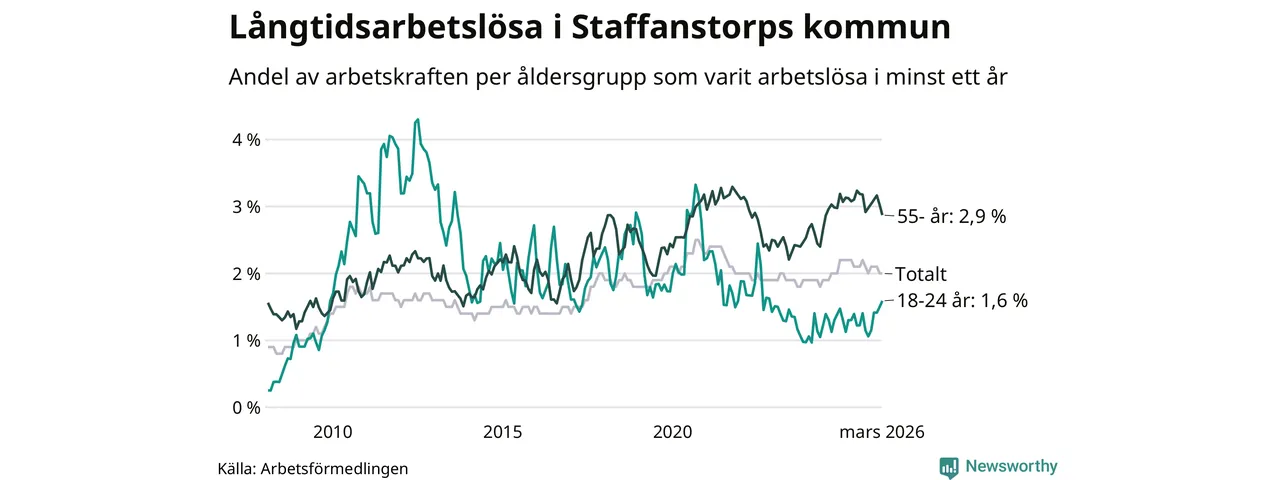 Av de 269 personerna som varit arbetslösa i mer än ett år i Staffanstorps kommun är 82 personer mellan 55 och 661 år och 18 är mellan 18 och 24 år. För den äldre gruppen är andelen arbetslösa 2,9 procent medan den i den yngre gruppen är 1,6 procent. Även i riket som helhet är långtidsarbetslösheten högre i gruppen äldre.