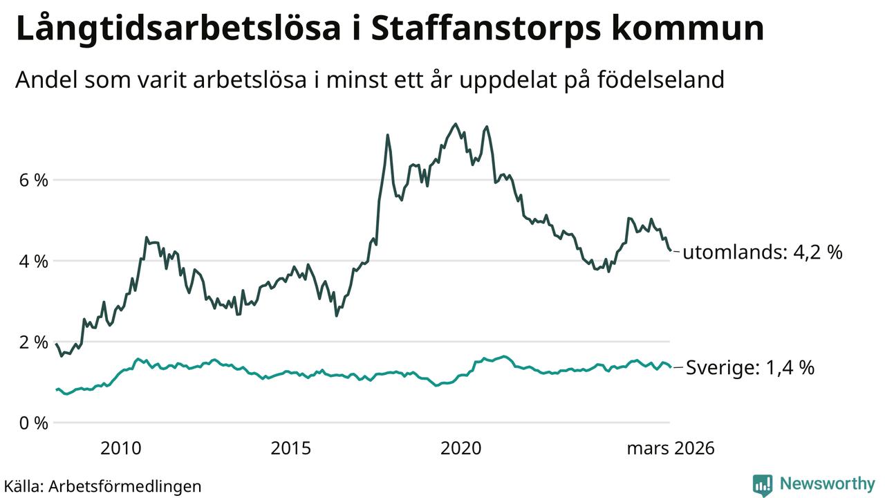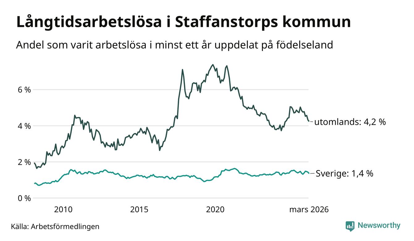 147 av de långtidsarbetslösa i Staffanstorp är födda i Sverige, medan 122 är födda utomlands. Det innebär att långtidsarbetslösheten bland Sverigefödda är 1,4 procent, medan den är tre gånger så hög – 4,2 procent – bland födda utomlands. Även i riket som helhet är arbetslösheten högre bland utrikesfödda.