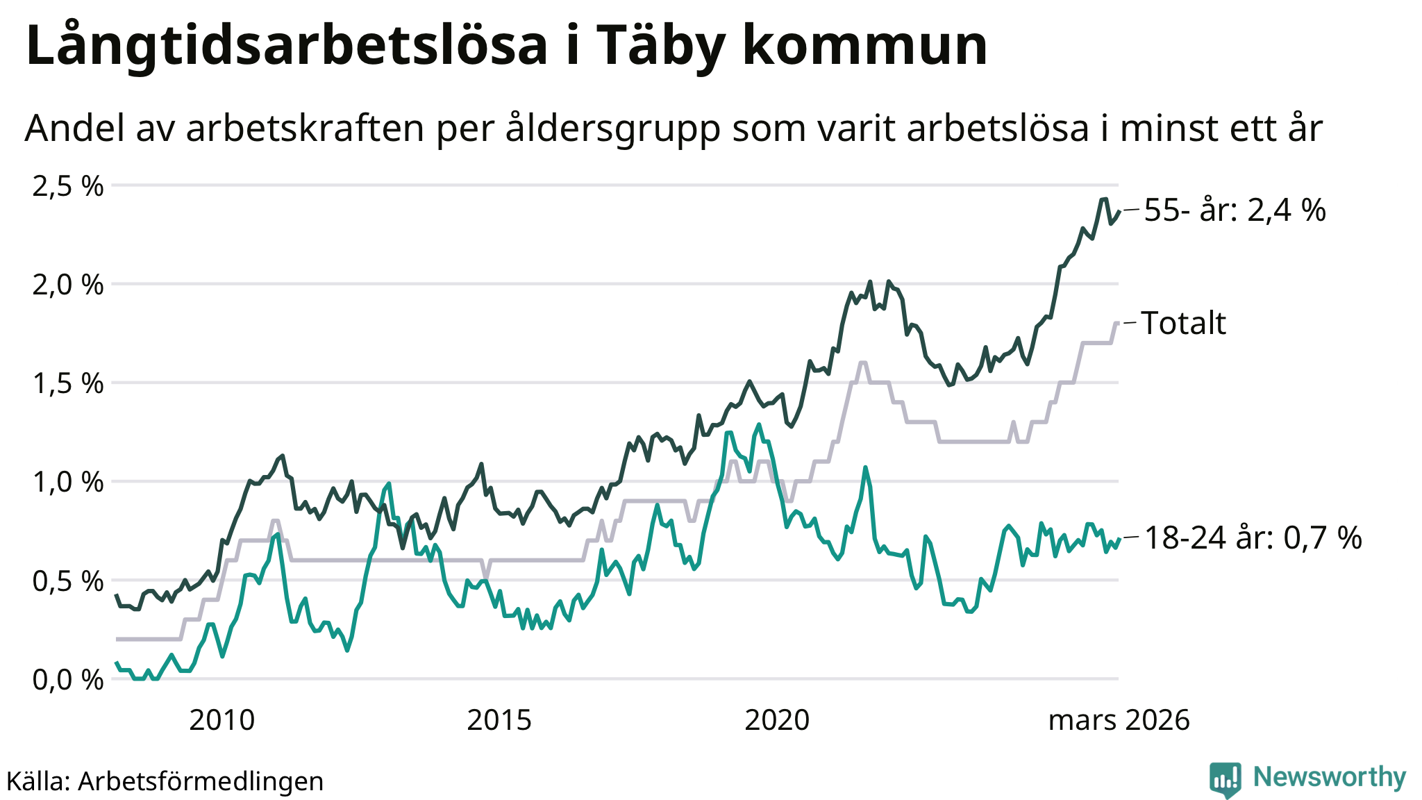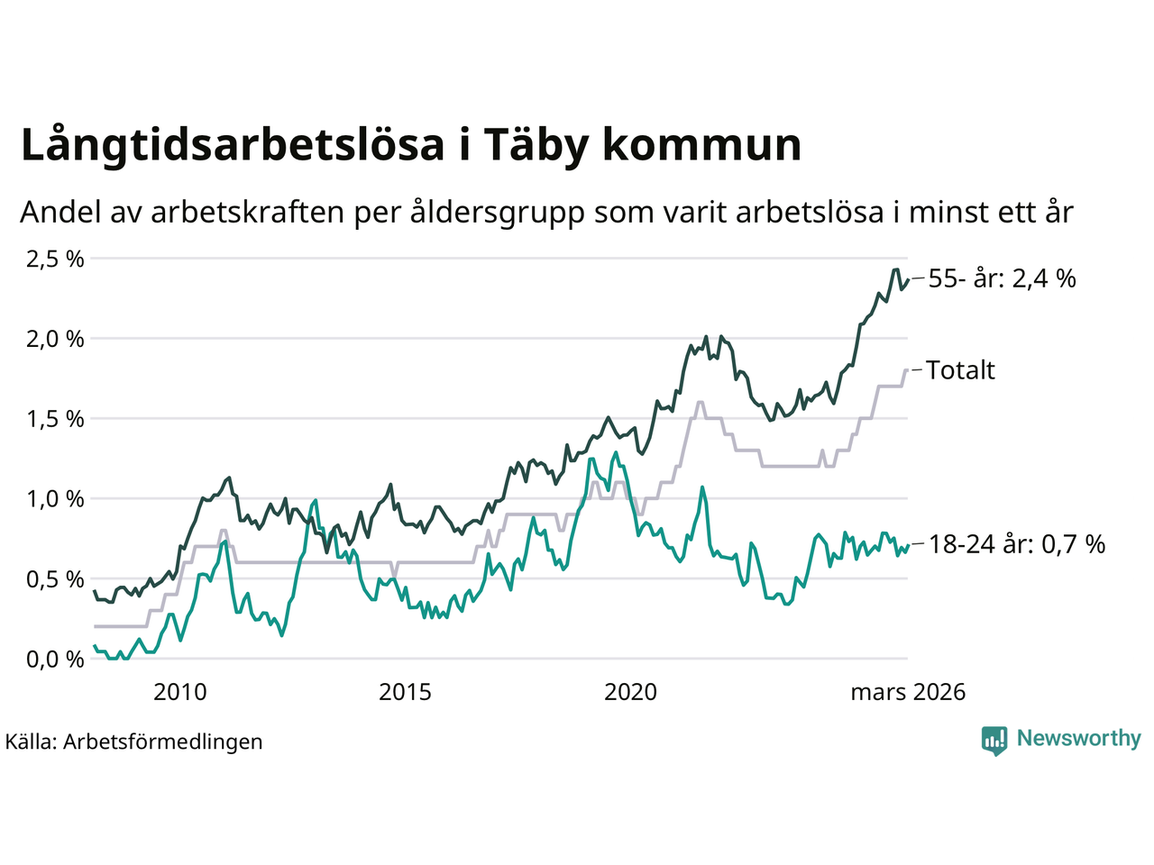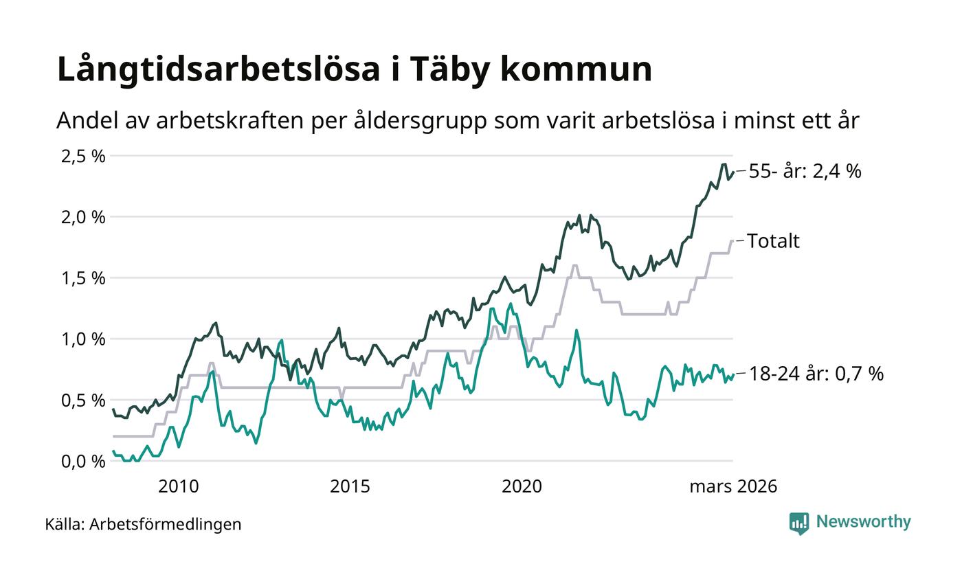 Av de 689 personerna som varit arbetslösa i mer än ett år i Täby kommun är 204 personer mellan 55 och 661 år och 27 är mellan 18 och 24 år. För den äldre gruppen är andelen arbetslösa 2,4 procent medan den i den yngre gruppen är 0,7 procent. Även i riket som helhet är långtidsarbetslösheten högre i gruppen äldre.